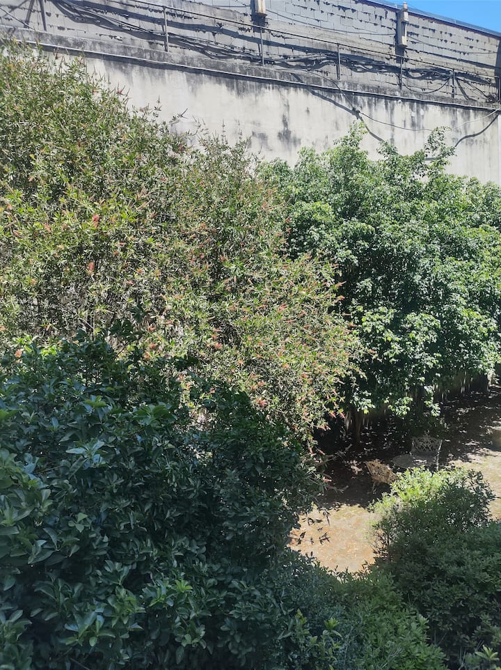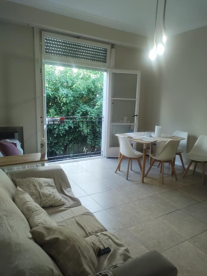 45 m² apartment in Flores with a private garden or patio. It has a kitchen, a separate laundry room, 1 full bathroom, and includes a work desk with a PC, a smart TV, and a breakfast bar. The listing places it near Parque Chacabuco and Plaza Flores, with connections to Av. Rivadavia, Av. Alberdi and Av. Directorio, and easy access to buses and the subway.