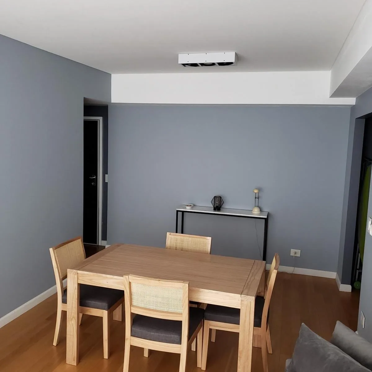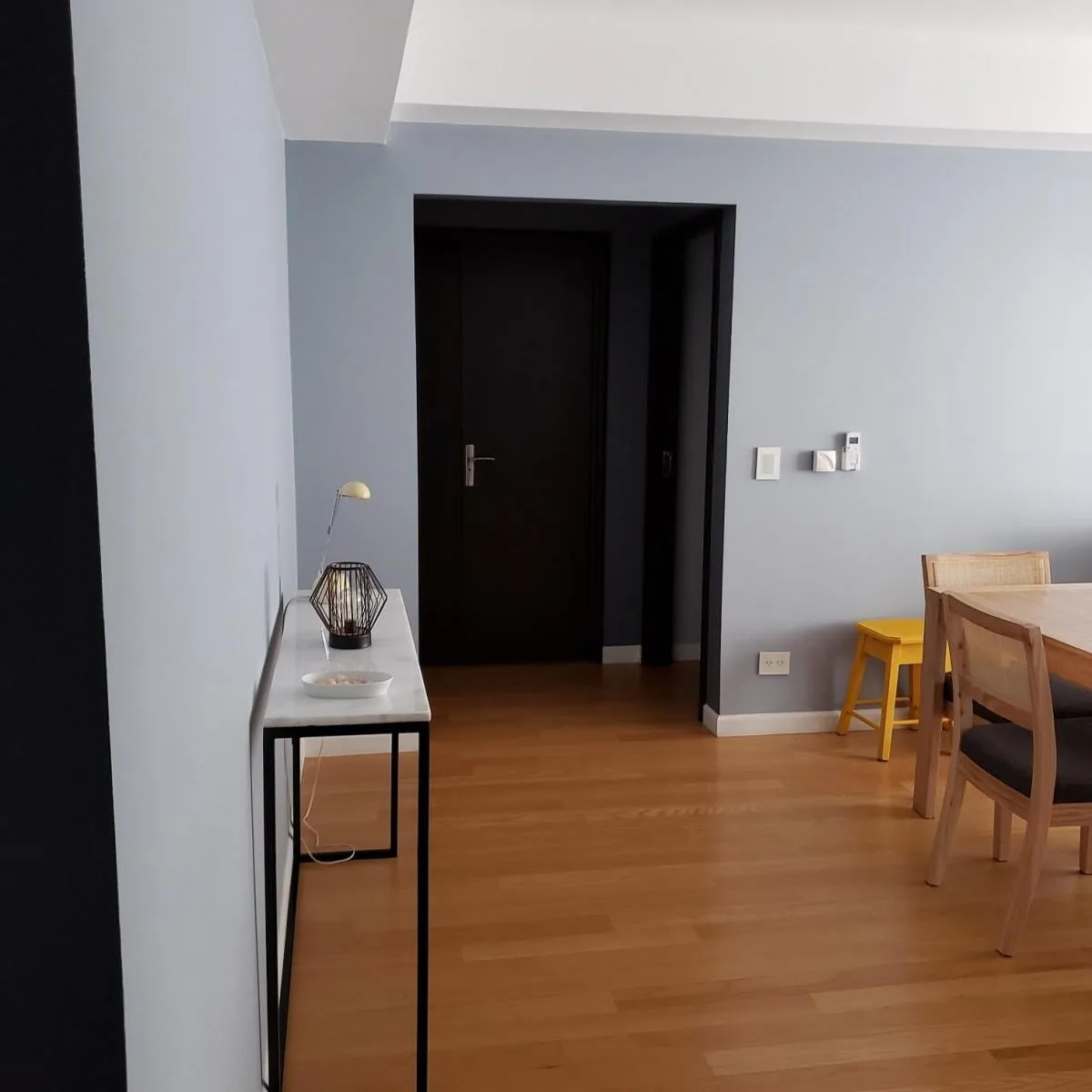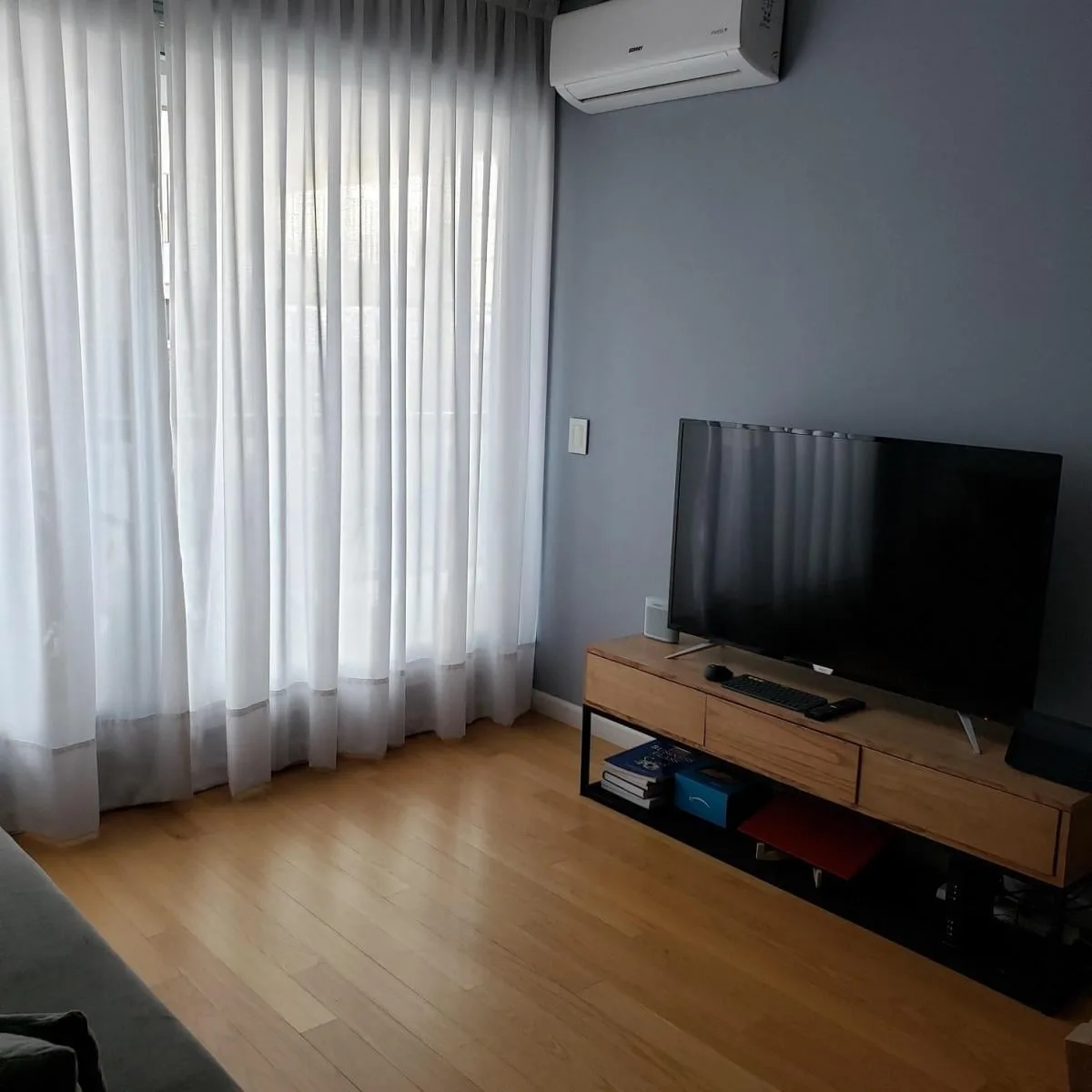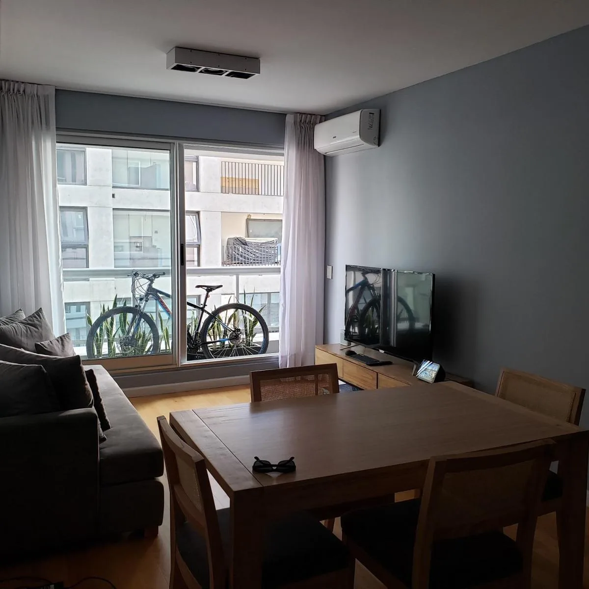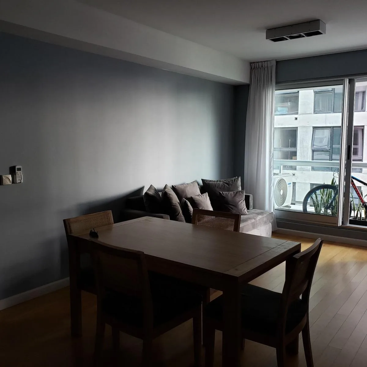Two-room apartment of 50 m² with 1 bedroom in Flores, with a balcony. Unfurnished except for luminarias and curtains; separate kitchen with space for a washing machine. Living and bedroom have floating floors, kitchen and bathroom have porcelain tile; aluminium windows with double glazing. Central heating with individual control and air conditioning in both the bedroom and living room. Includes an assigned covered parking space and building amenities including a pool, solarium, grill, communal
