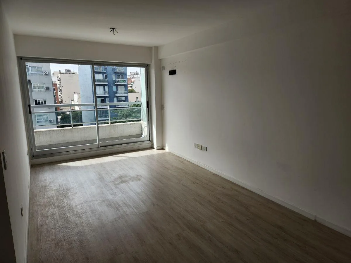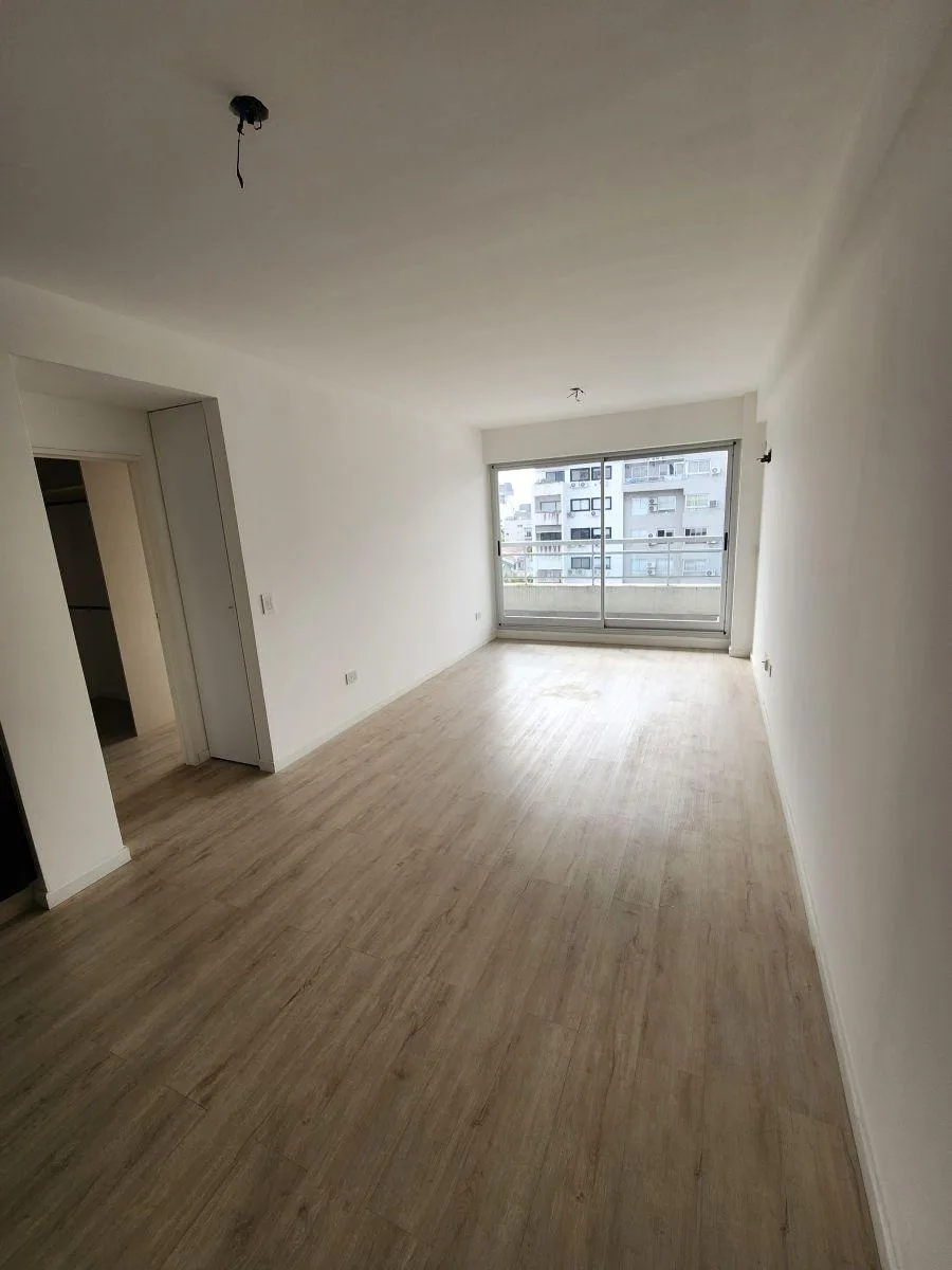 Two-room apartment on the 6th floor, courtyard-facing (contrafrente). Living room plus a primary bedroom in suite with a dressing area. The building has a pool, communal room and BBQ grills at ground level, a laundry in the basement, and on the 8th floor courtyard-facing a gym, terrace and sauna. 24-hour security with a totem.