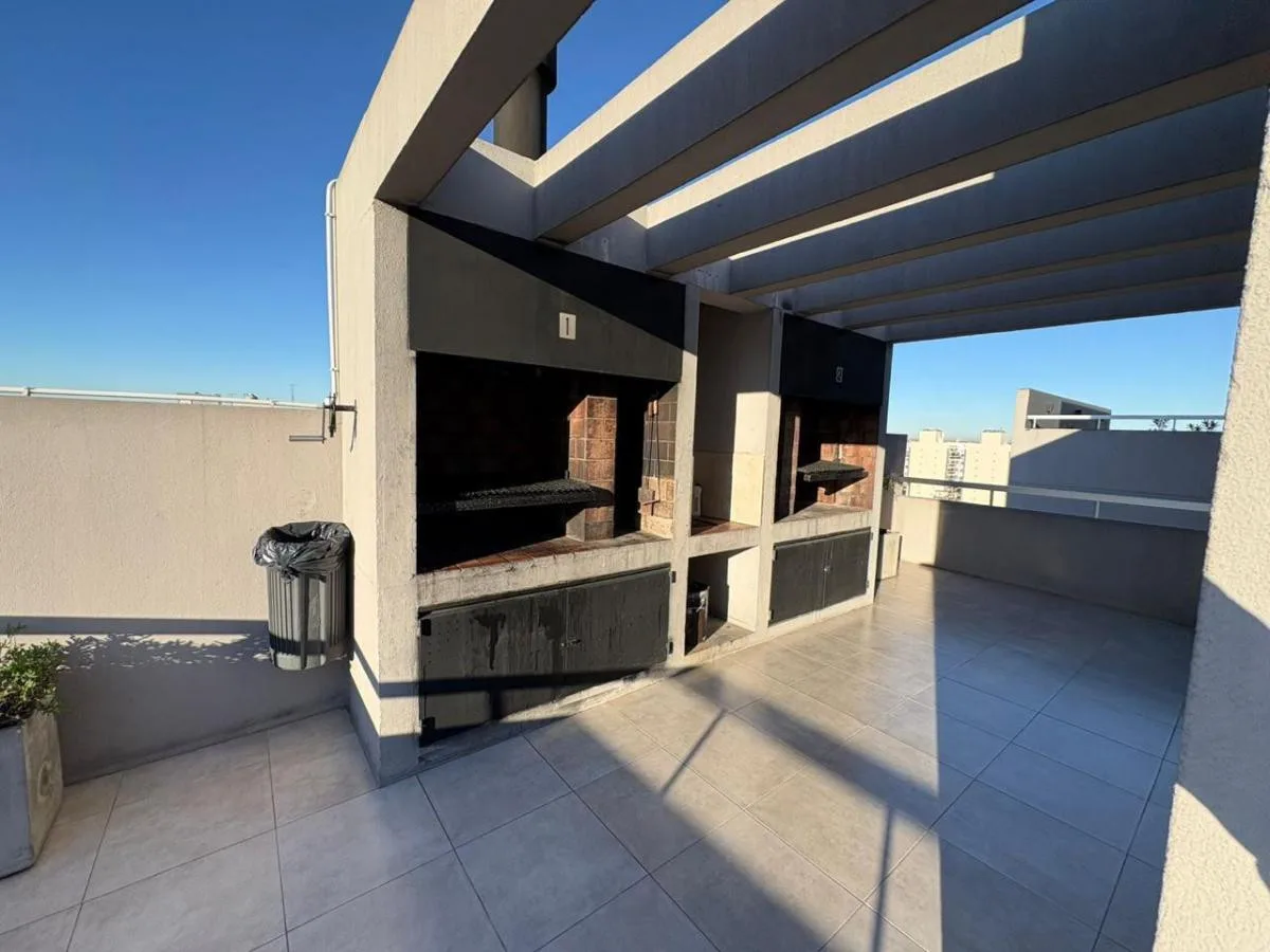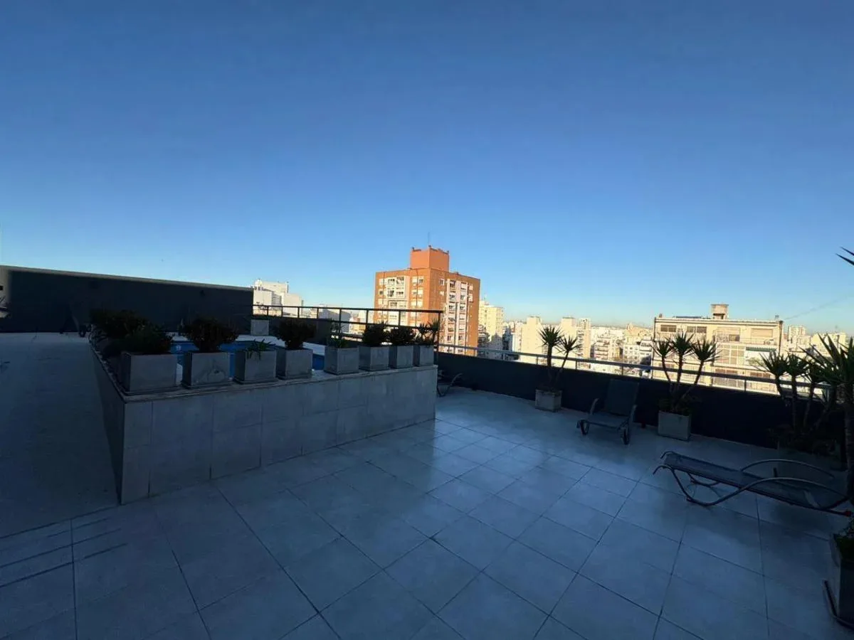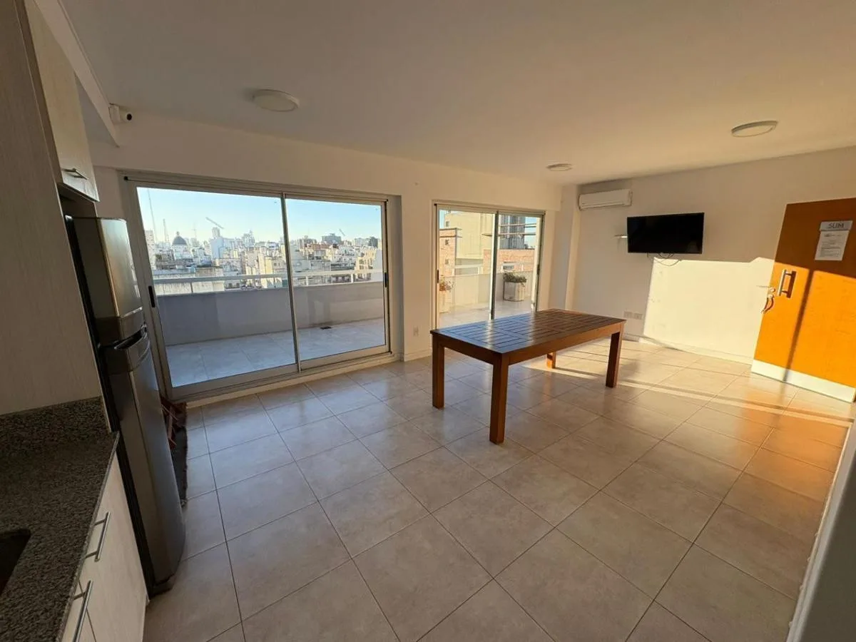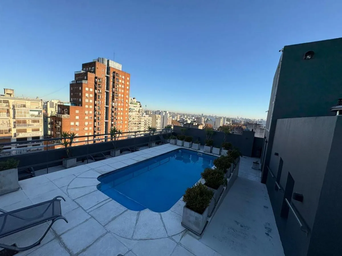 Divisible studio apartment in excellent condition on the 8th floor, courtyard-facing to the interior block courtyard (pulmón de manzana). It has a full bathroom, dressing area, and a kitchen with electric cooktop and oven. The unit includes hot/cold air conditioning and a large window. The building is a few years old and offers a communal room (SUM), pool and laundry. Building fees, utilities and internet are not specified in the listing; a rental guarantee bond (caución) is required along with