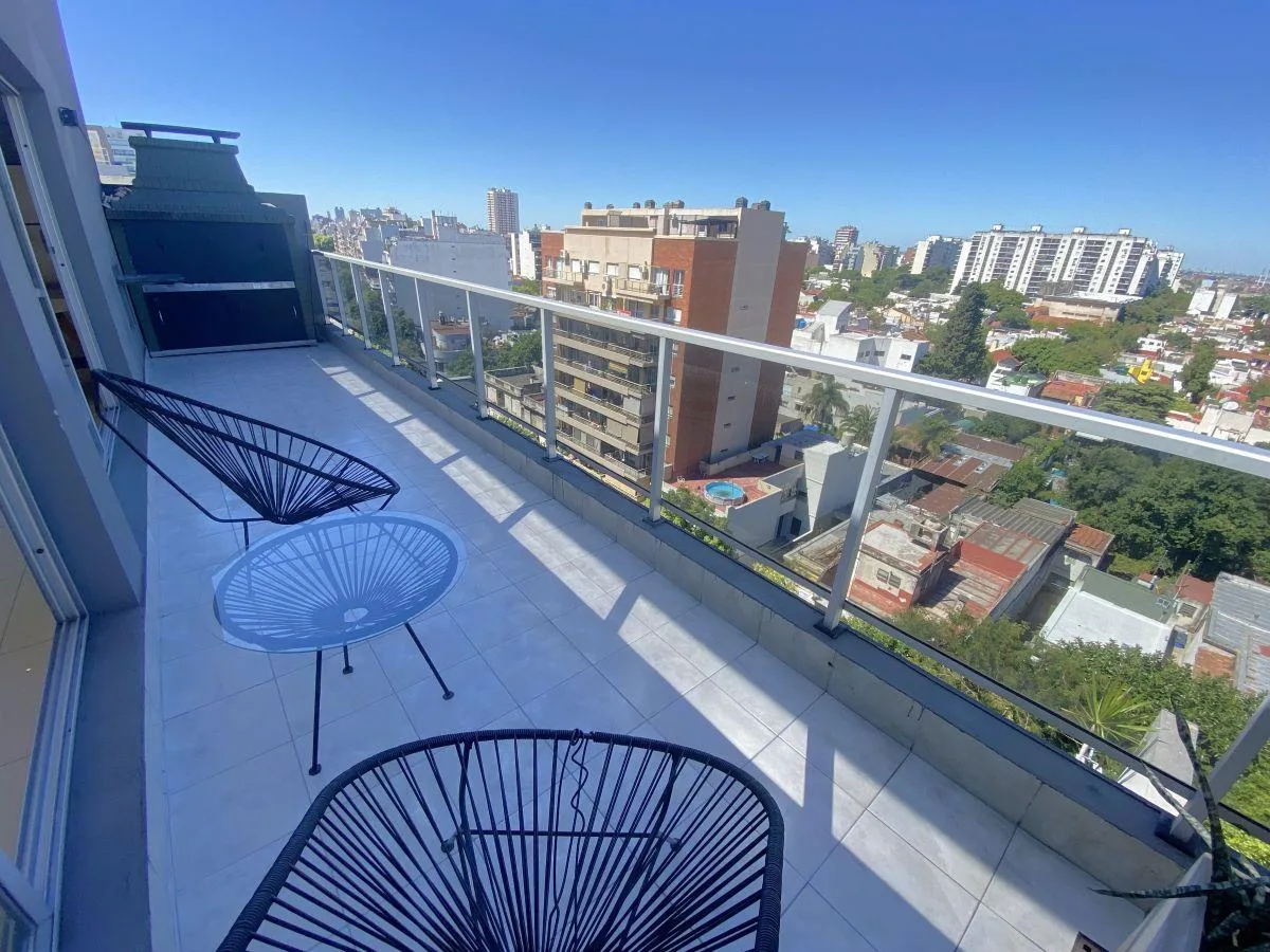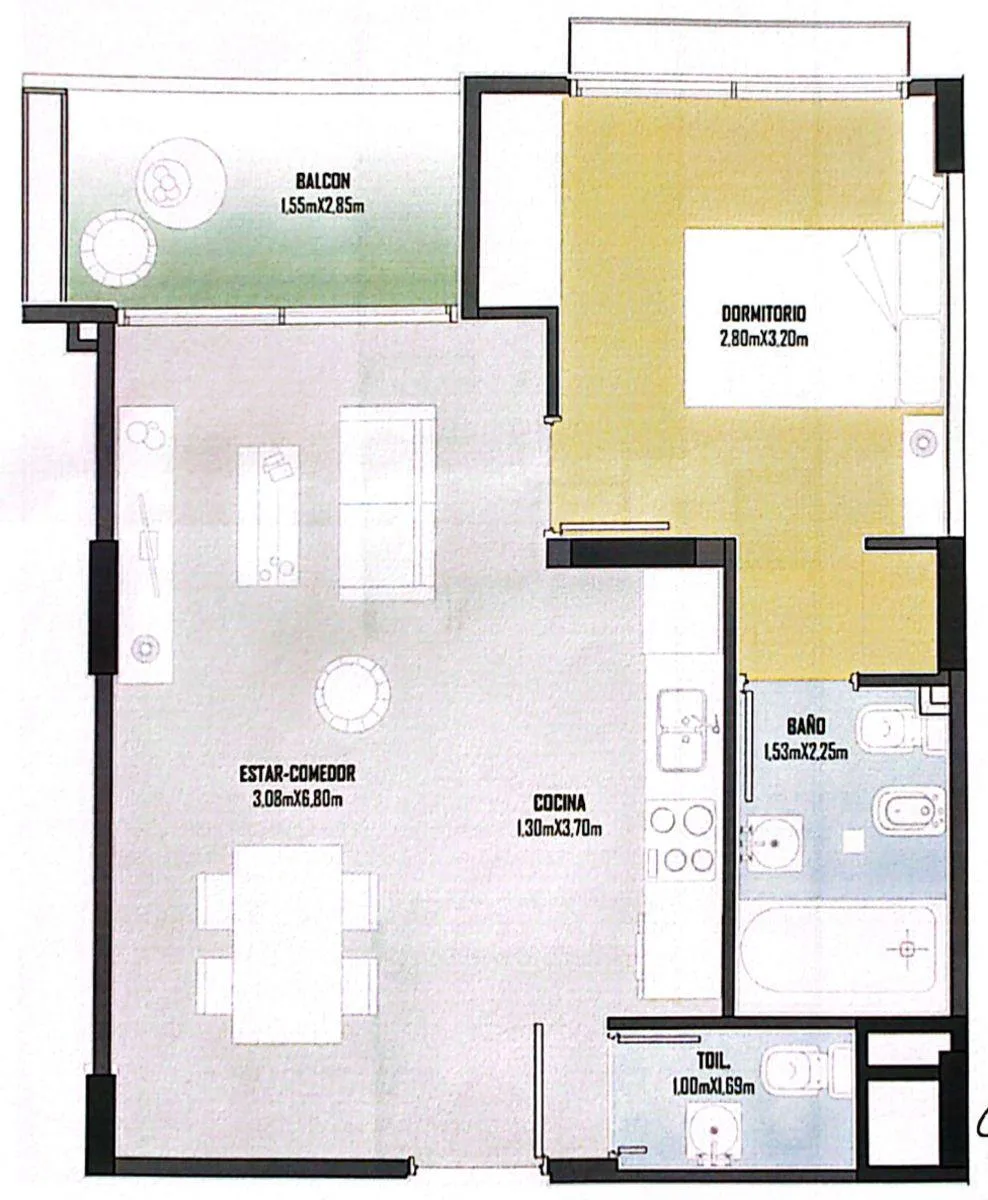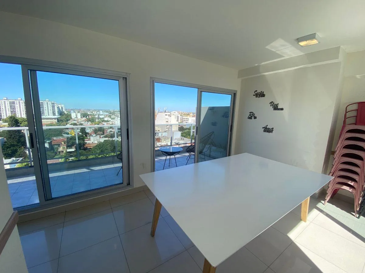 Two-room half-floor apartment totalling 50 m² in Flores, courtyard-facing. The unit has a living-dining room with access to a balcony-terrace, integrated kitchen and laundry, a guest toilet, and a suite bedroom with built-in wardrobes and a dressing area. Covered area is 45 m², with a 5 m² semi-covered balcony-terrace (2.85 x 1.55 m). The building is 9 years old and offers a fully equipped communal room (SUM) with a grill, plus accessibility access for people with reduced mobility and a generato