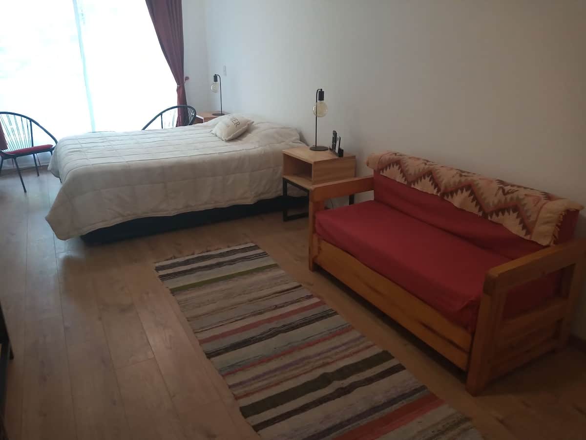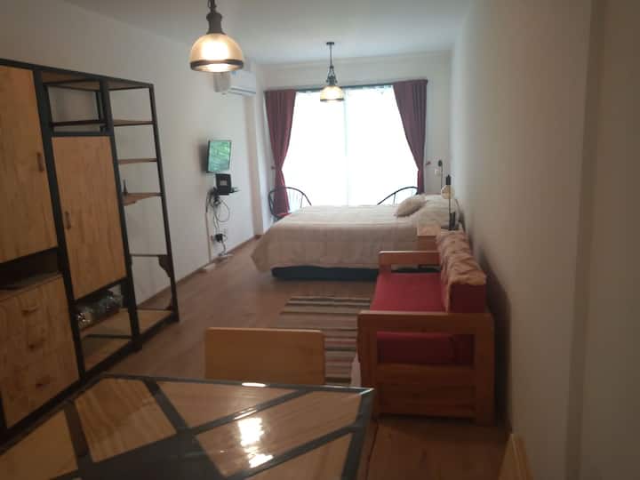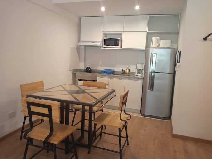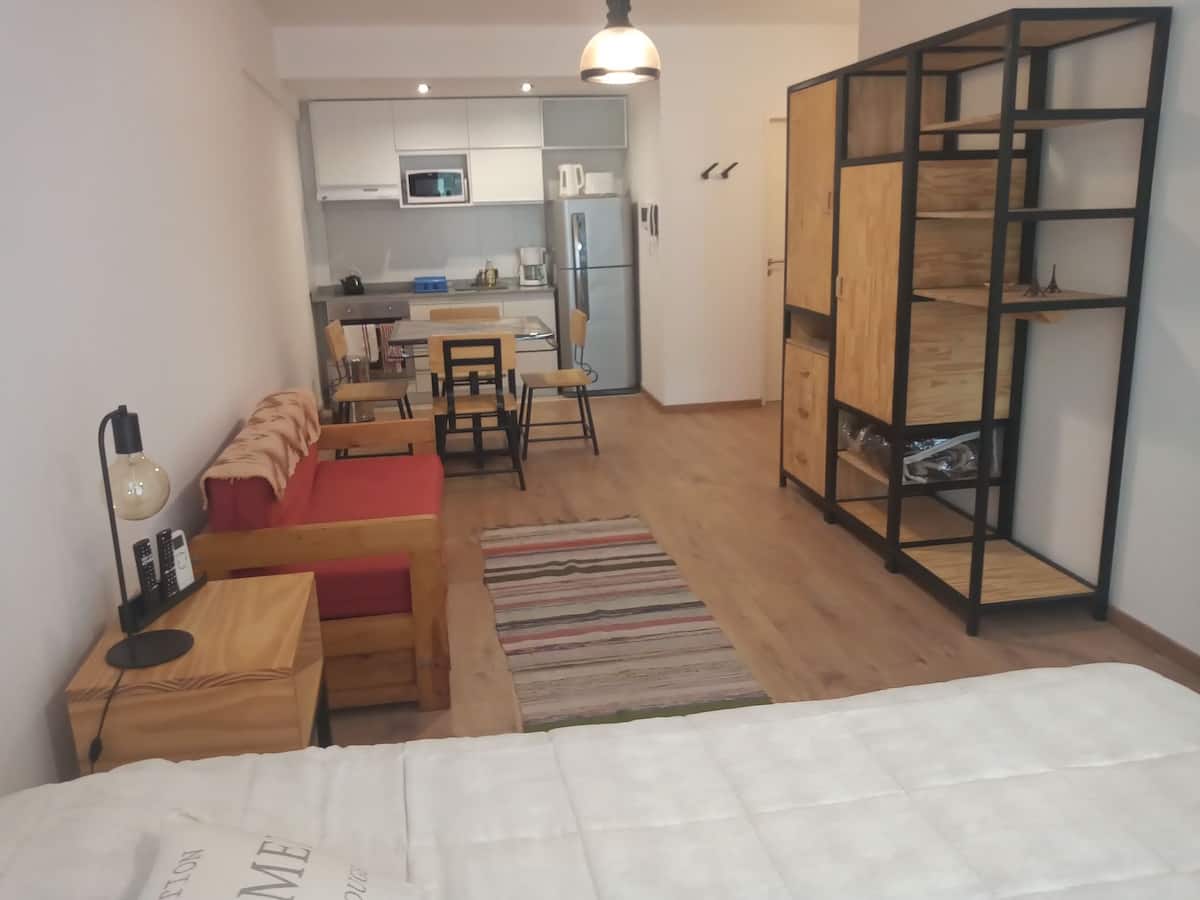 Studio apartment in a newly built building in Caballito. Street area is warm and quiet, one block from Av. Pedro Goyena and 4 blocks from Carabobo station (Line A) and Av. Rivadavia. Fully equipped, with a coffee shop on the ground floor and supermarkets and other grocery options within 200 metres.