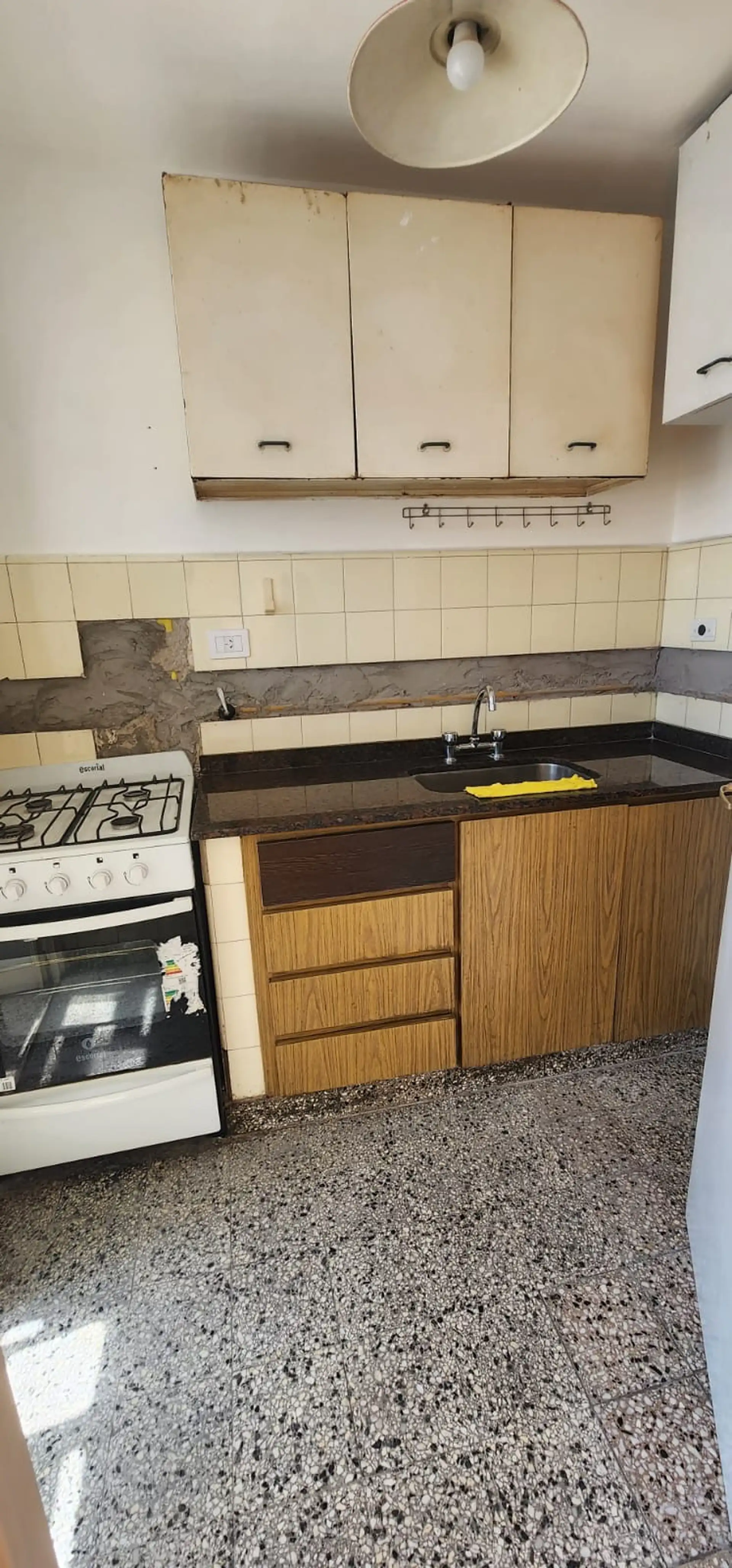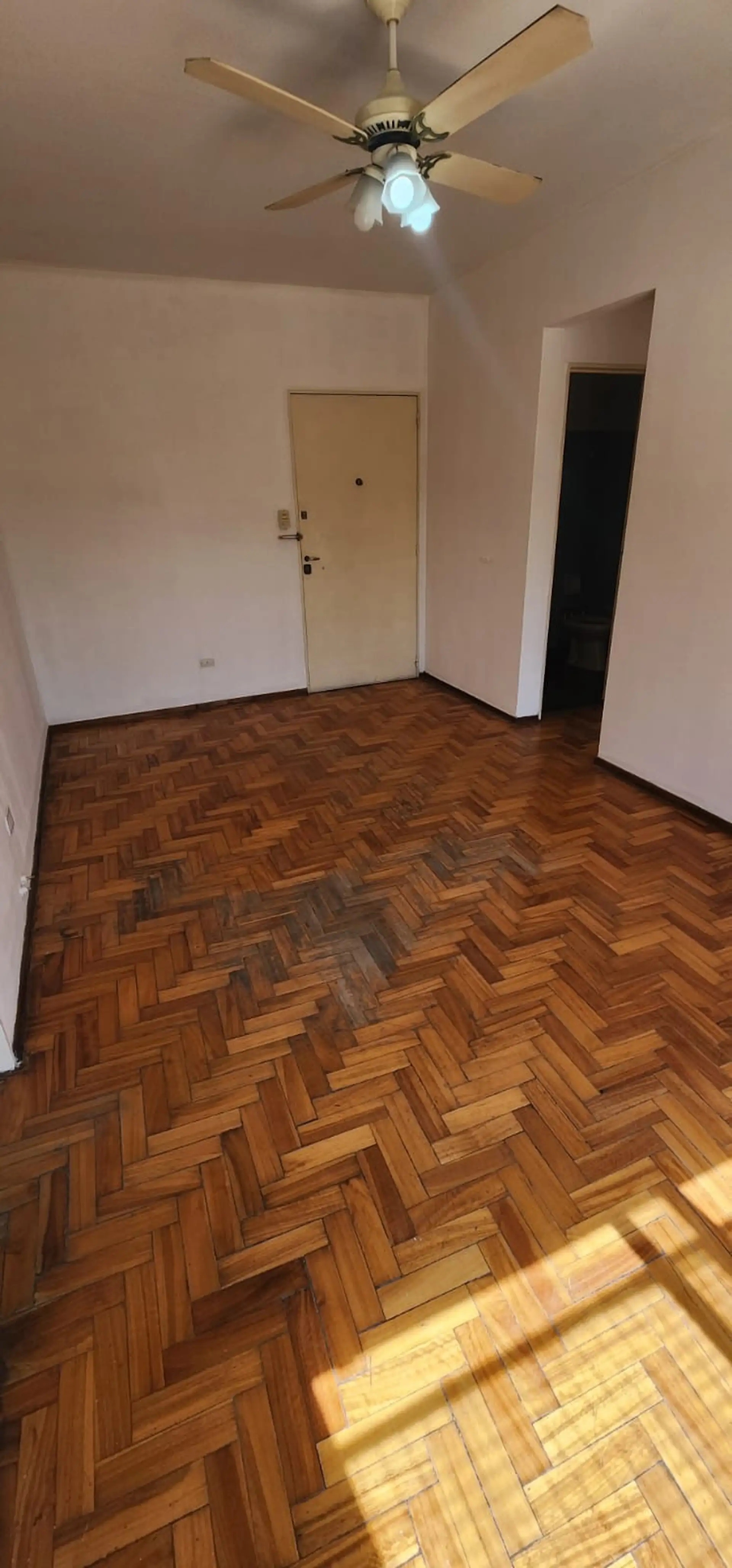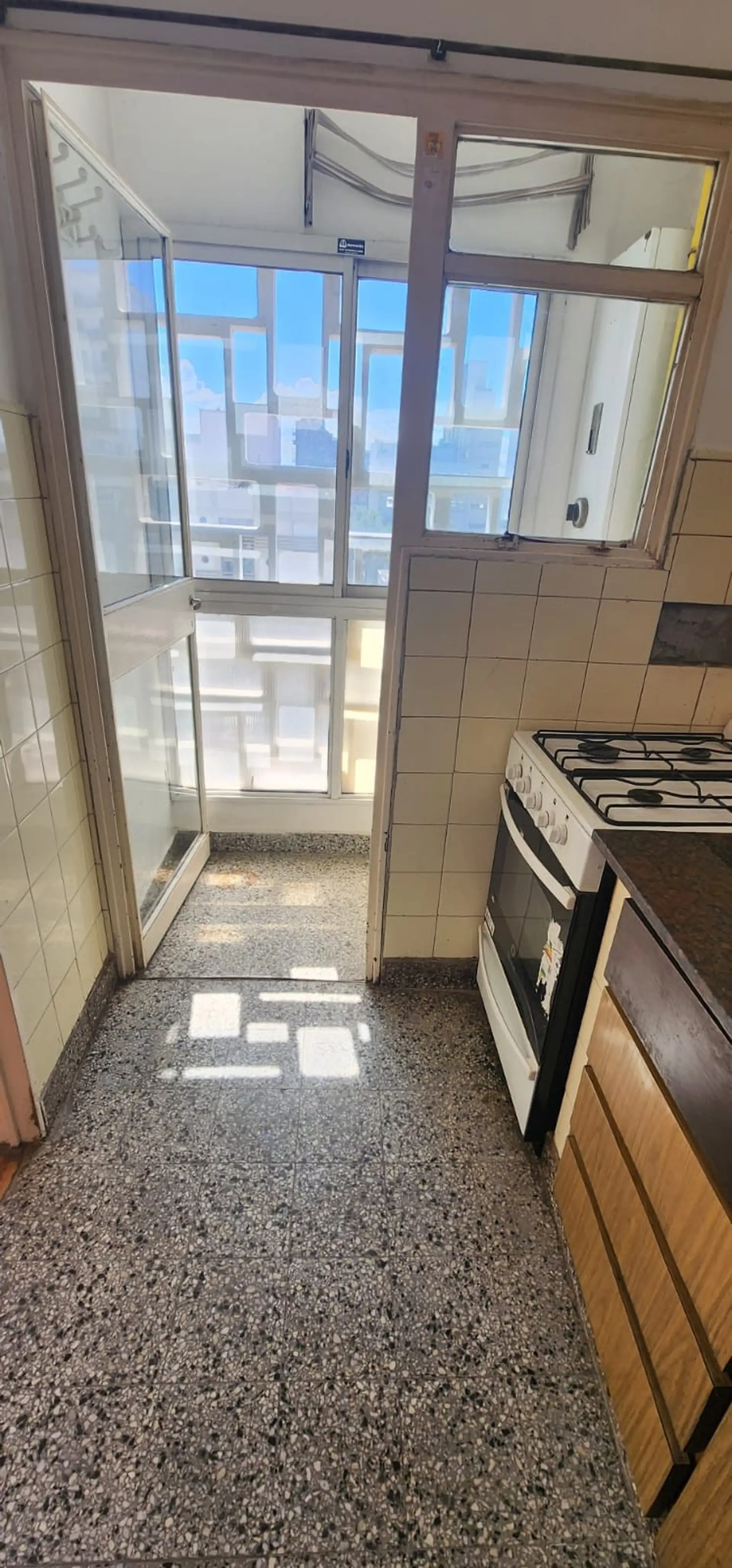 Two-room apartment in General San Martín Centro on 7th floor, between Belgrano and Moreno (Pellegrini 1921). It has 1 bedroom with a built-in wardrobe, a full bathroom, and a kitchen with upper and lower cabinets plus a separate laundry area, with a water heater. The living room includes a window, and the unit has heating via a calefón; building fees are described as low. Rental terms include a 2-year lease with quarterly rent increases by IPC, no pets, a rental guarantee bond or co-surety, fire