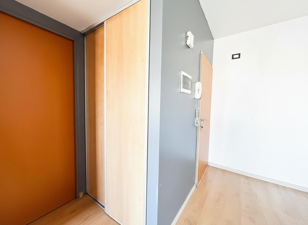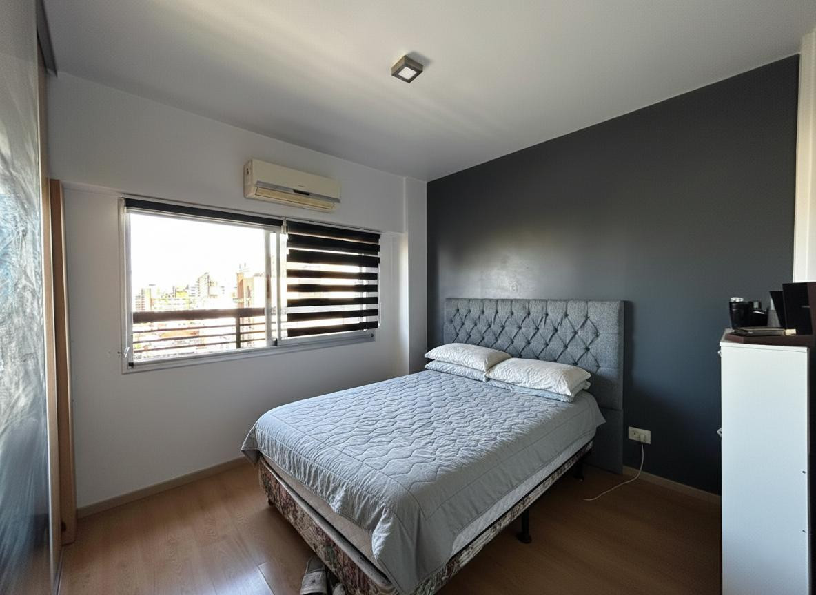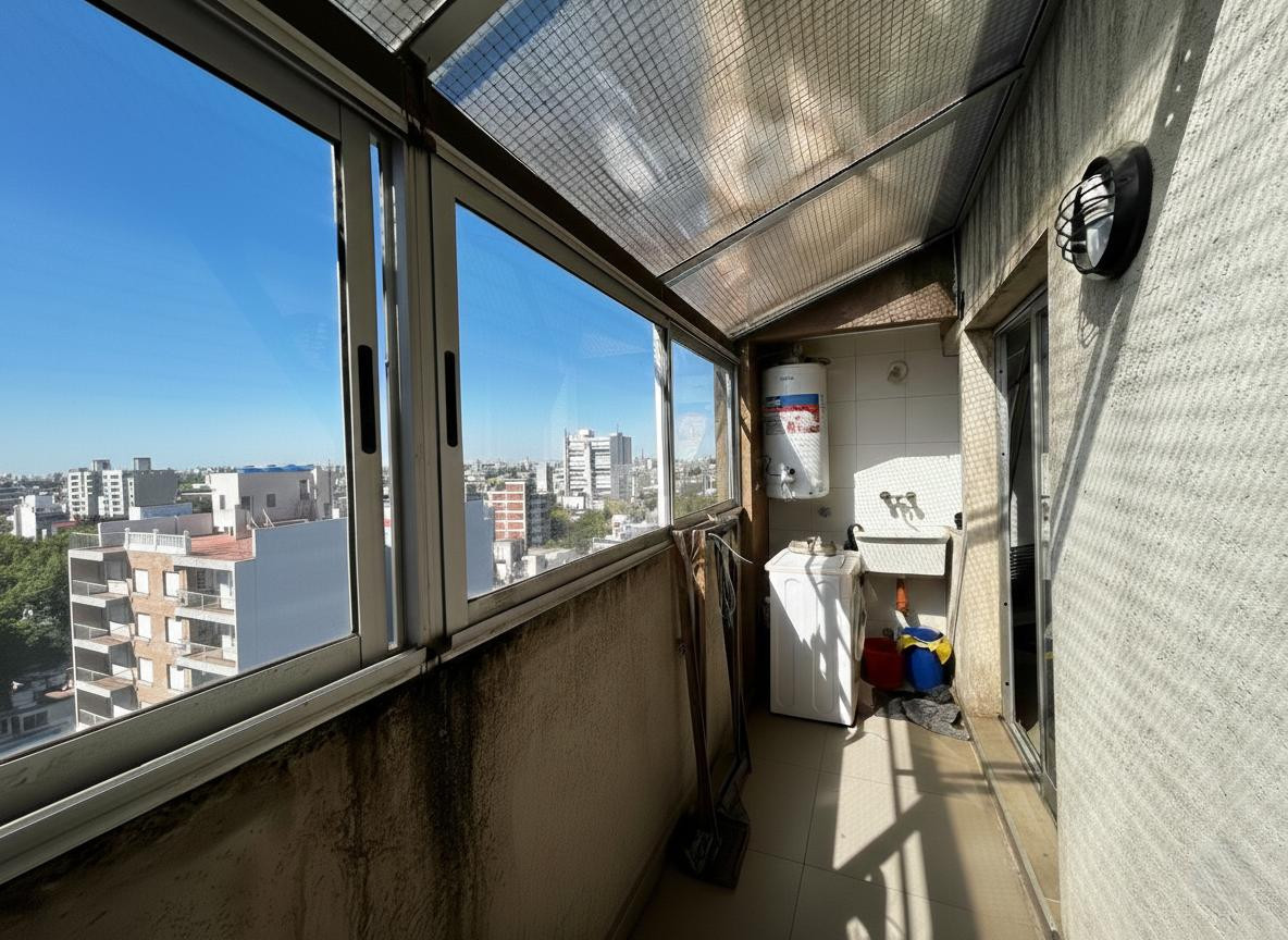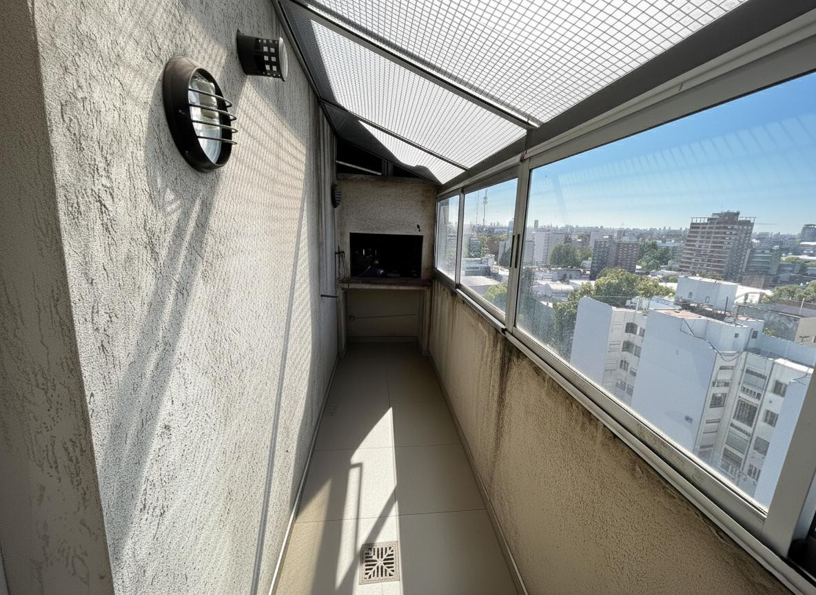 Two-room apartment on the 9th floor, street-facing in General San Martín. The unit has a living-dining area with floating floor, a separate fitted kitchen with base cabinets, pantry, a gas stove (spar), and space for a dishwasher, plus a front balcony with protective netting and a panoramic view. The bedroom includes an interior closet and floating floor, and there is a full bathroom with bathtub. There is also a balcony at the courtyard side with enclosed glazing, a laundry area, and a grill; t