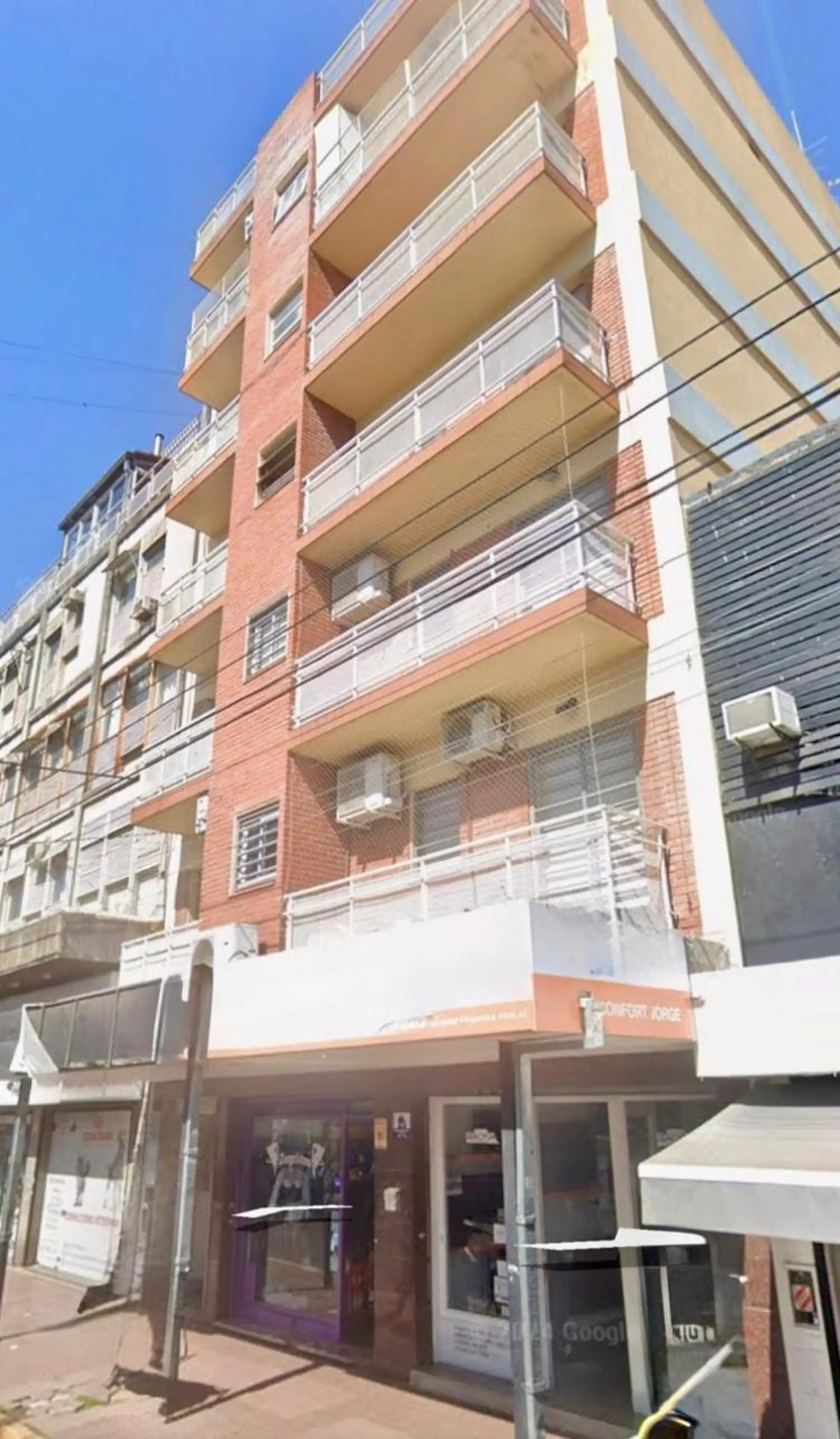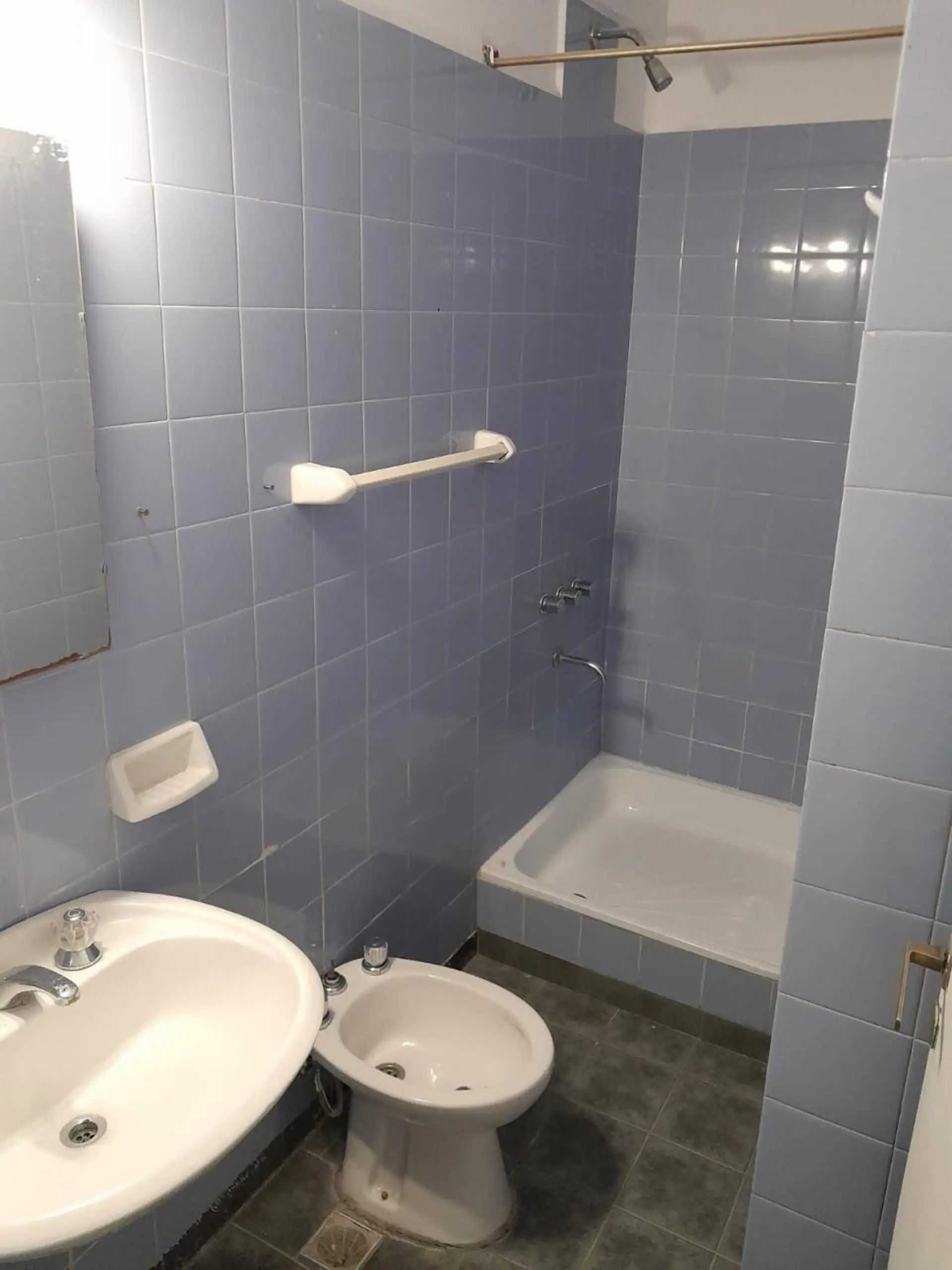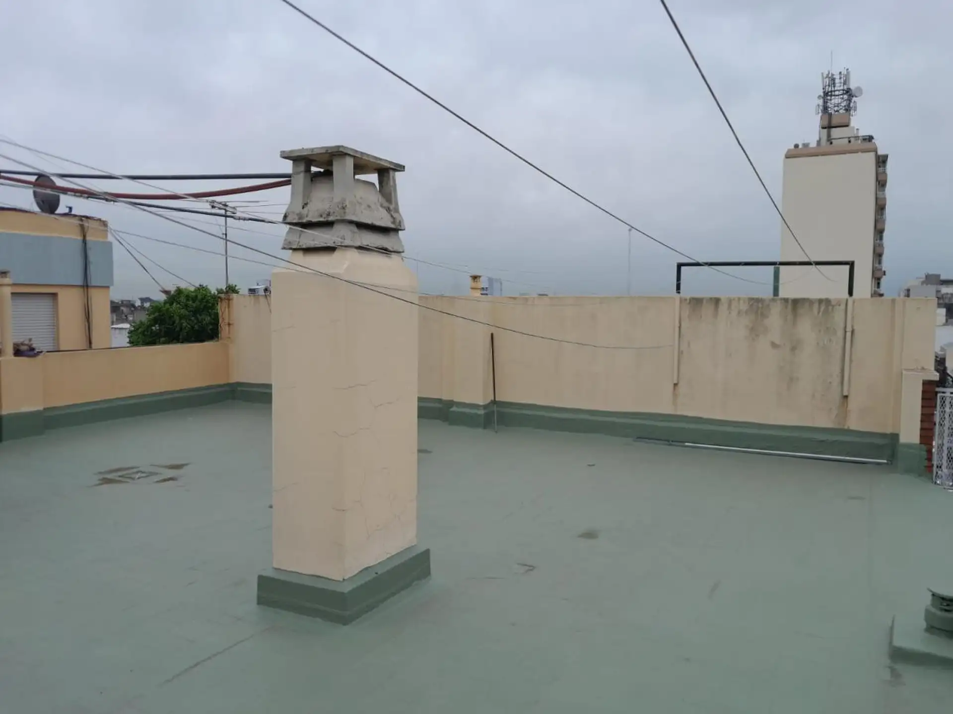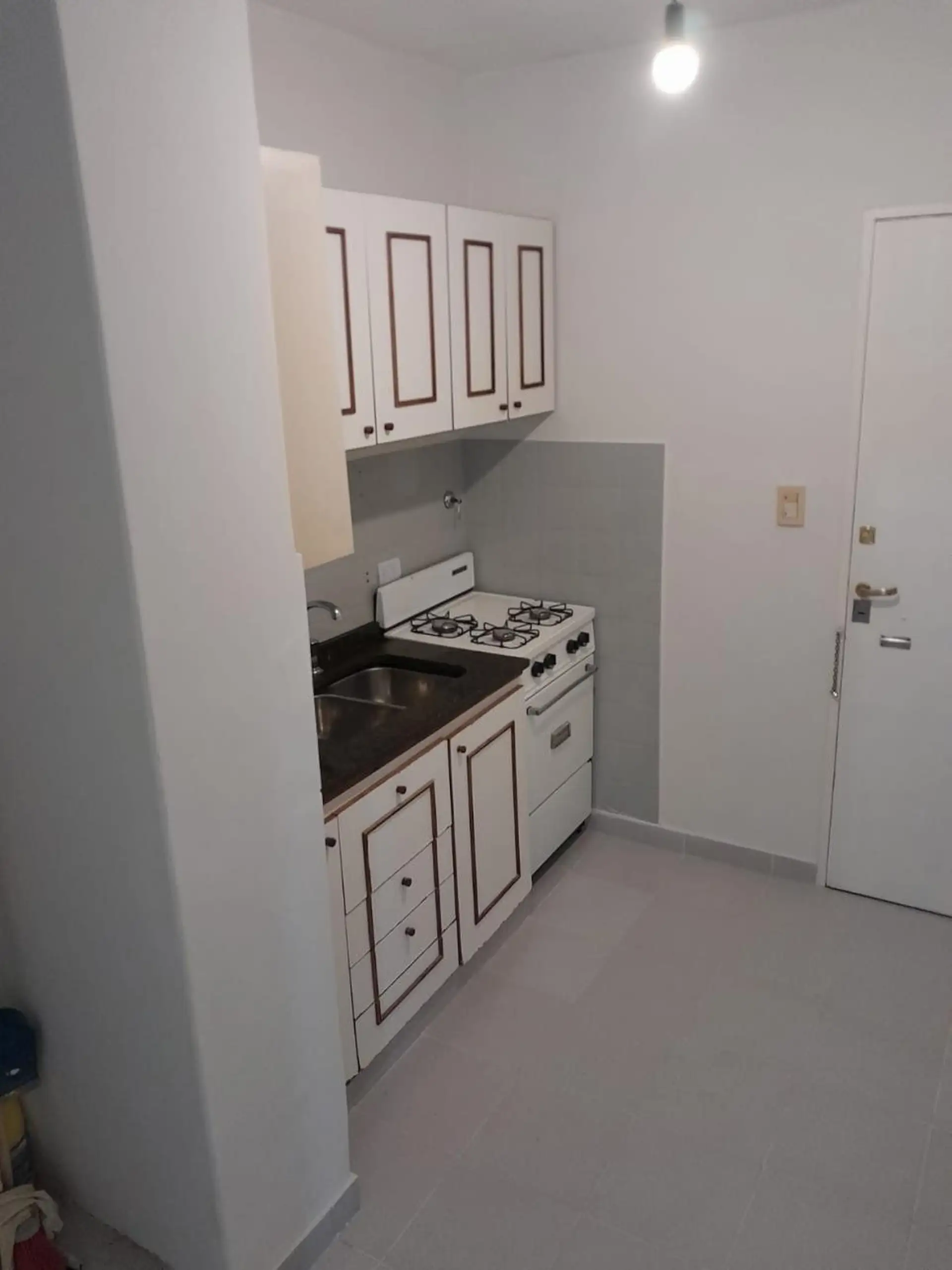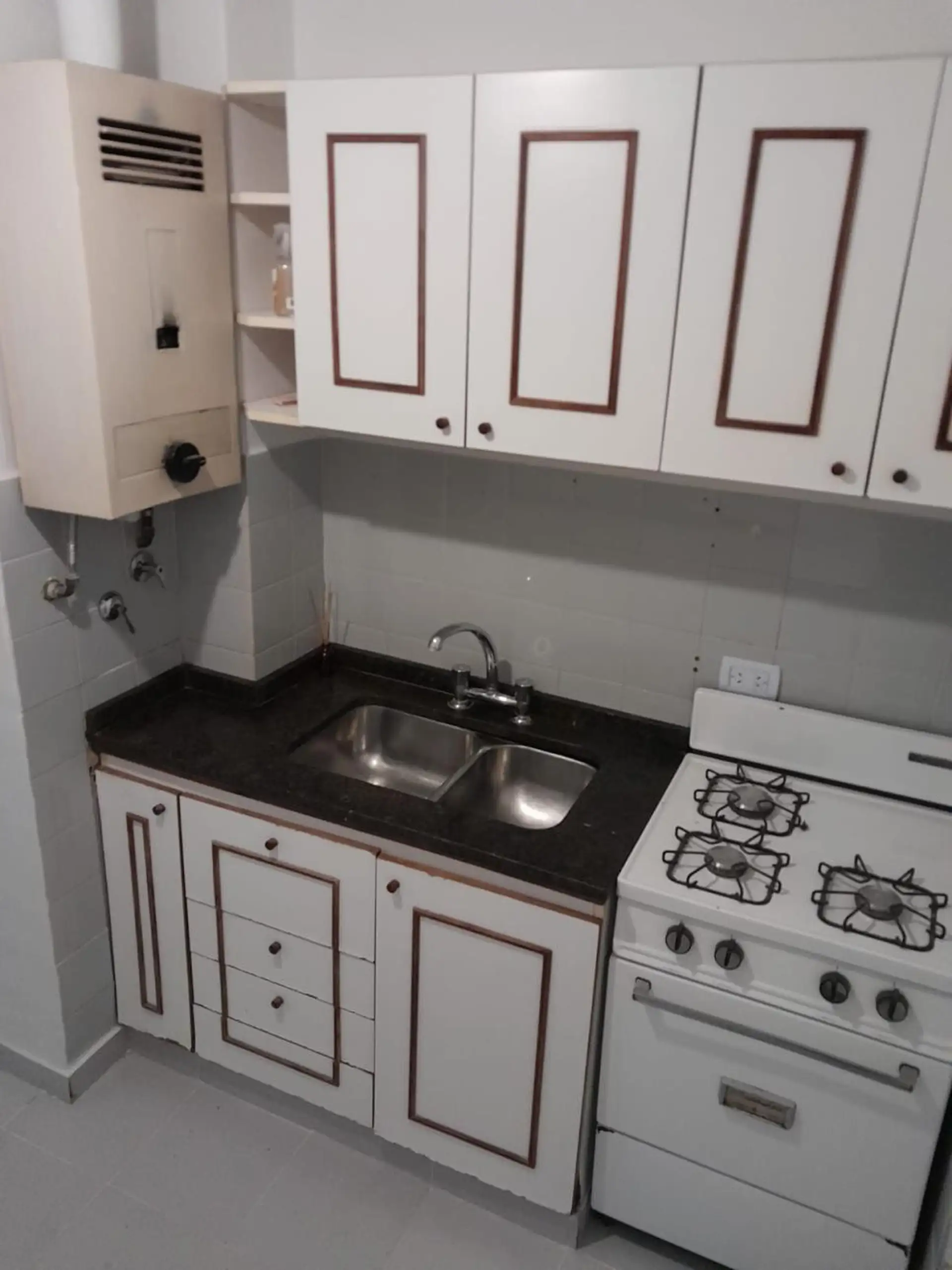 Unfurnished studio apartment in Villa Ballester, General San Martín, on the 4th floor (4° B), located between Av. Alvear and Pueyrredón. The studio is divided with a defined sleeping area, with a separate kitchen fitted with base cabinets and wall units, gas cooktop and water heater (calefón). There is a full bathroom with shower, built-in closet space, and no space for a washing machine; the building has a laundry area with sinks and a shared terrace. Rental term is 2 years with quarterly adjus