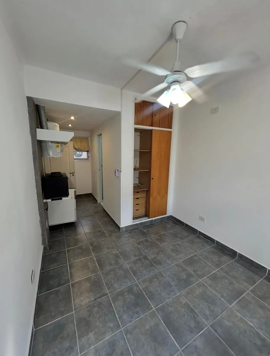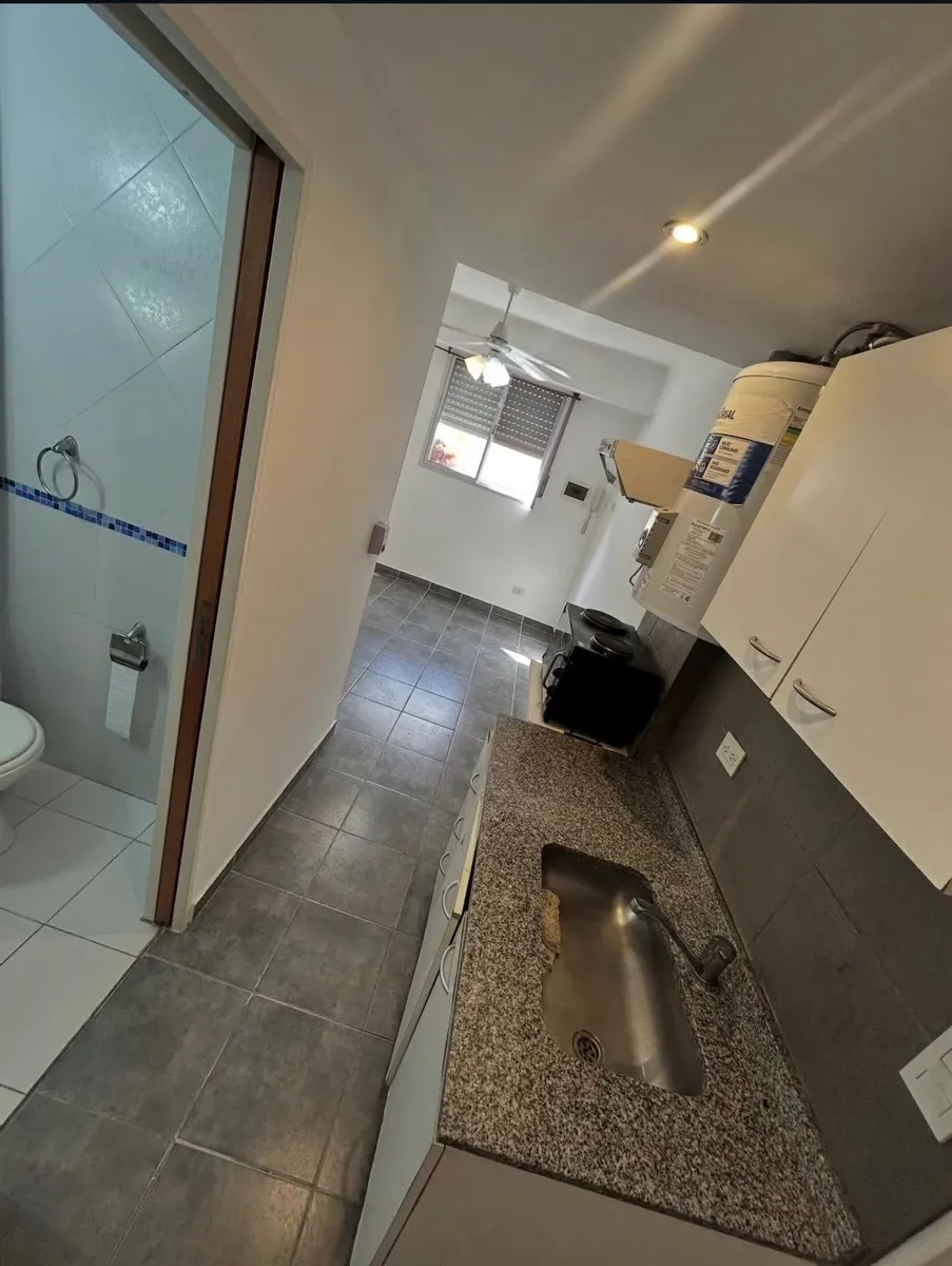 Apartment for rent with 45 m² total and covered area, comprising 1 bedroom and 1 bathroom. The kitchen includes base cabinets and an overhead cabinet. The bedroom has a built-in wardrobe and a window. The building has a shared outdoor area with grills and a space for meetings.