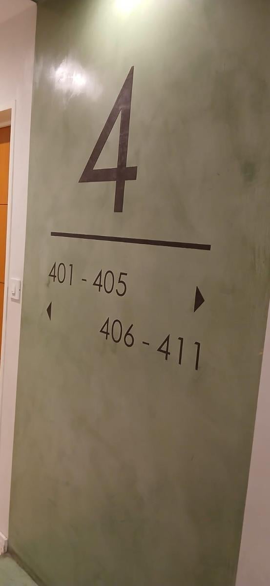 Two-room apartment on the 4th floor, street-facing with a balcony. 50 m² with a living room opening to an open kitchen, full bathroom plus a separate toilet, and a bedroom en suite with built-in wardrobes and a second balcony. Equipped with an electric hotplate and oven, and 2 heating/cooling air-conditioning units; building amenities include a pool on the 7th floor, laundry on the 7th floor, grills and a shared courtyard on the ground floor, an emergency generator and security totems, and 2 ele