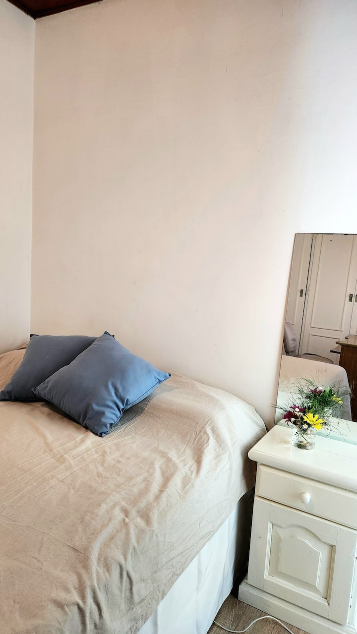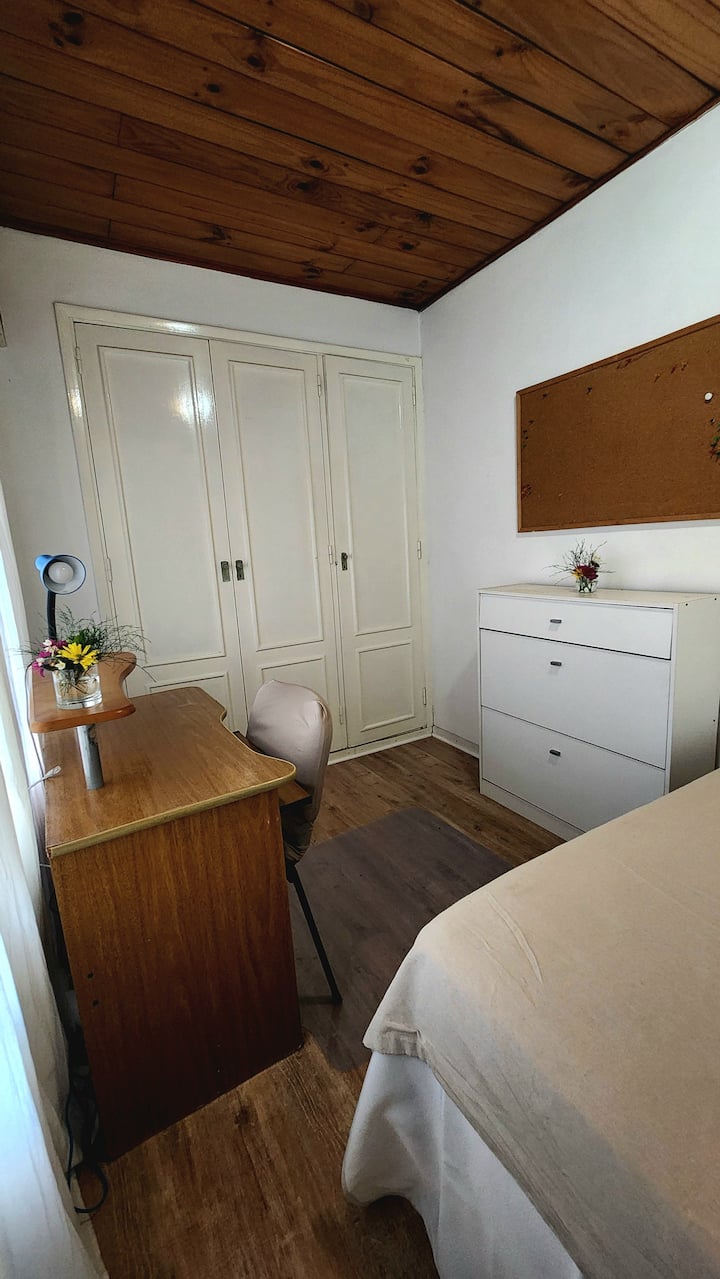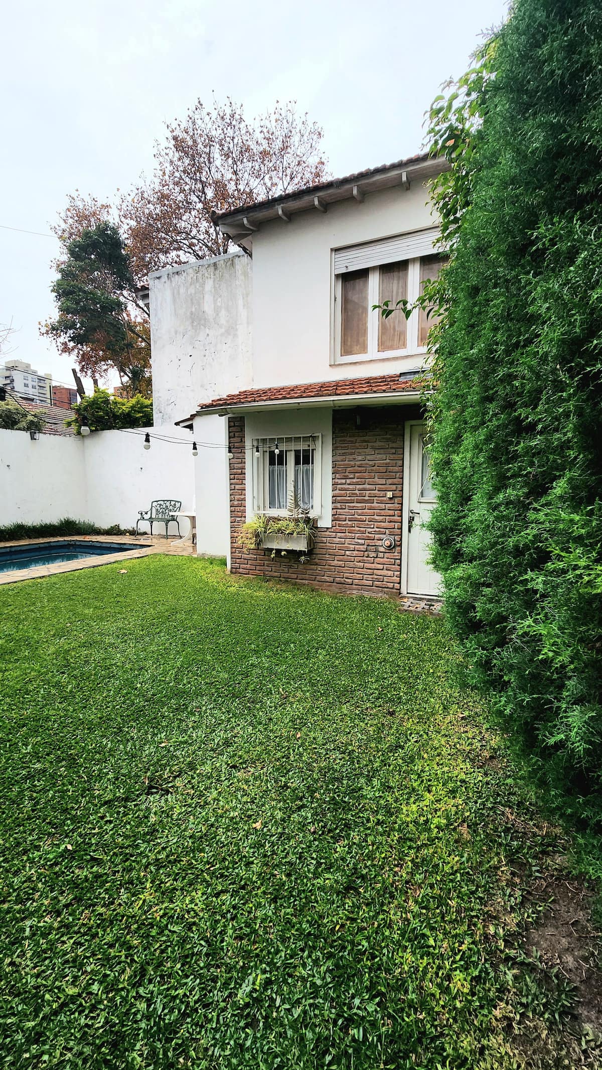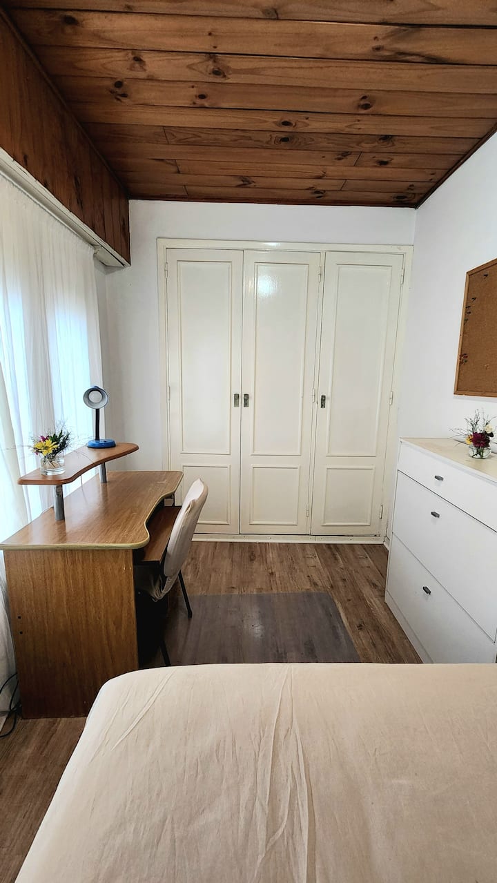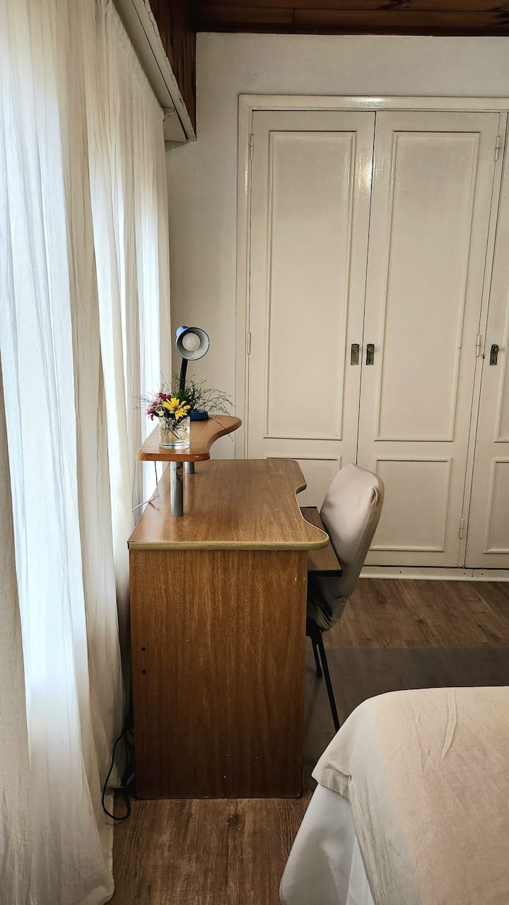 Two-storey cottage apartment of the “Garden House” type in La Lucila, accessed via a separate entrance. It includes a built-in kitchen with dining area and a private bathroom on the ground floor, and a bedroom on the second floor with wardrobes and a desk overlooking the garden. Guests have use of the garden, an outdoor pool and an external dining room, and there is reserved street parking in front of the white entrance gate.