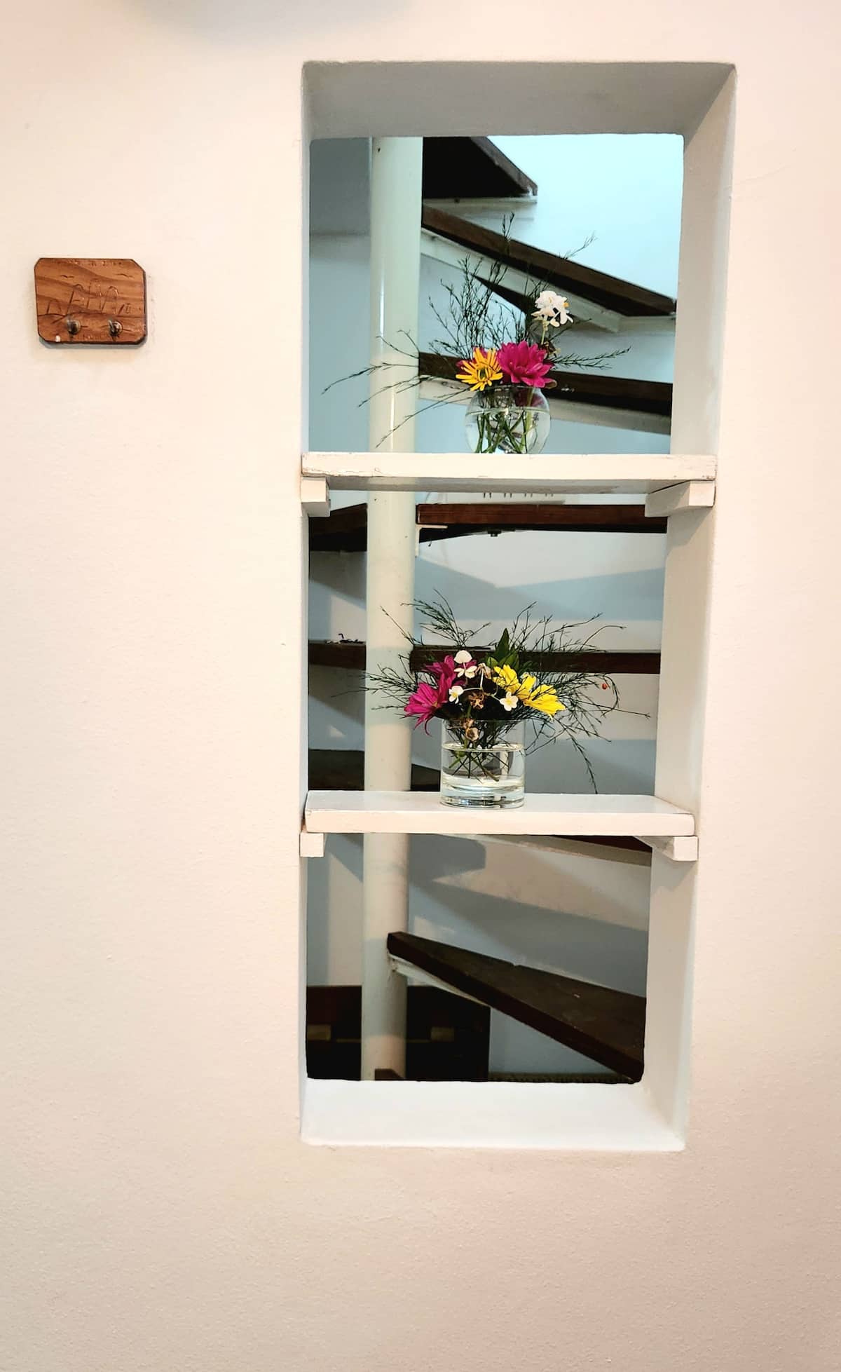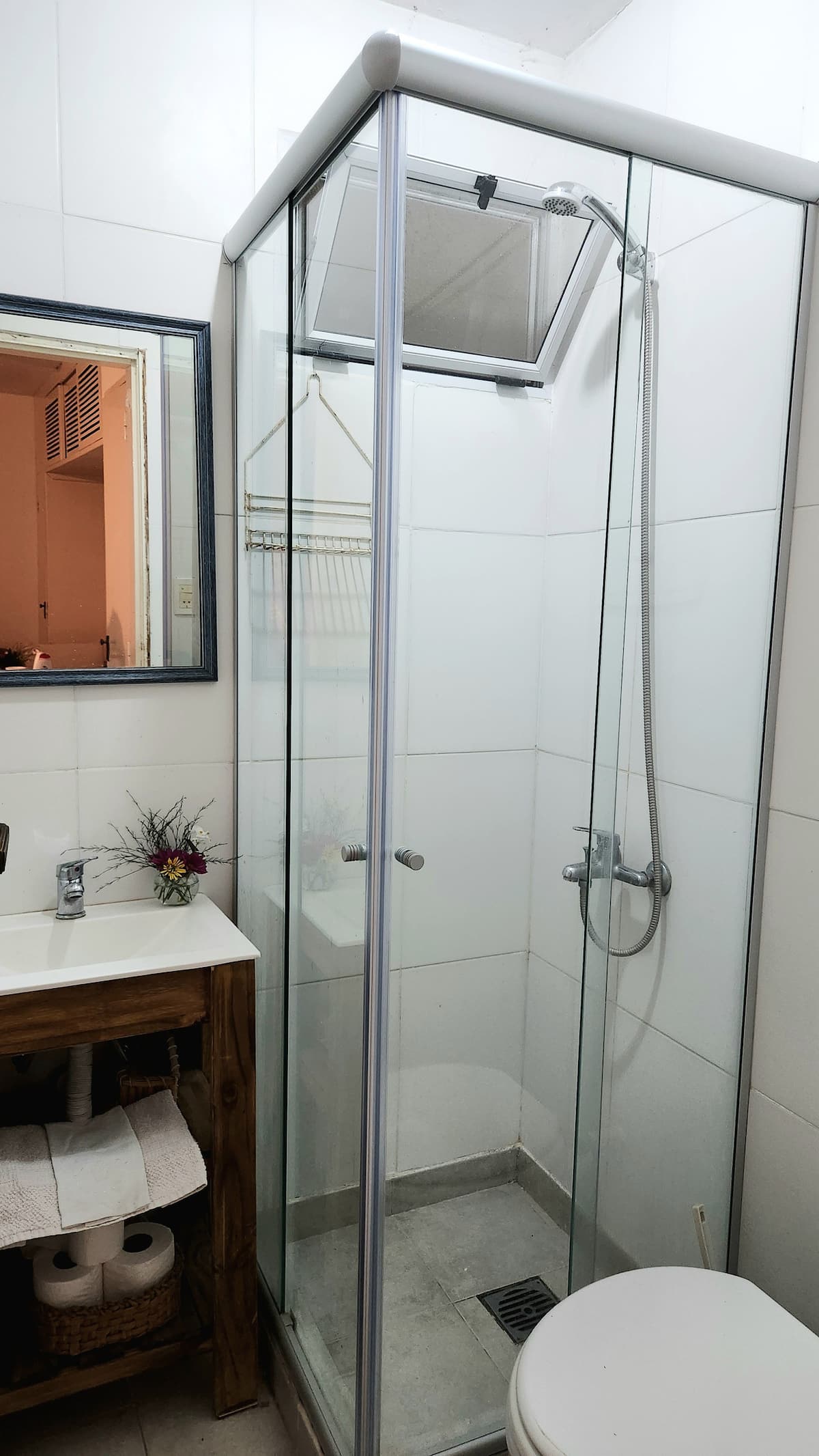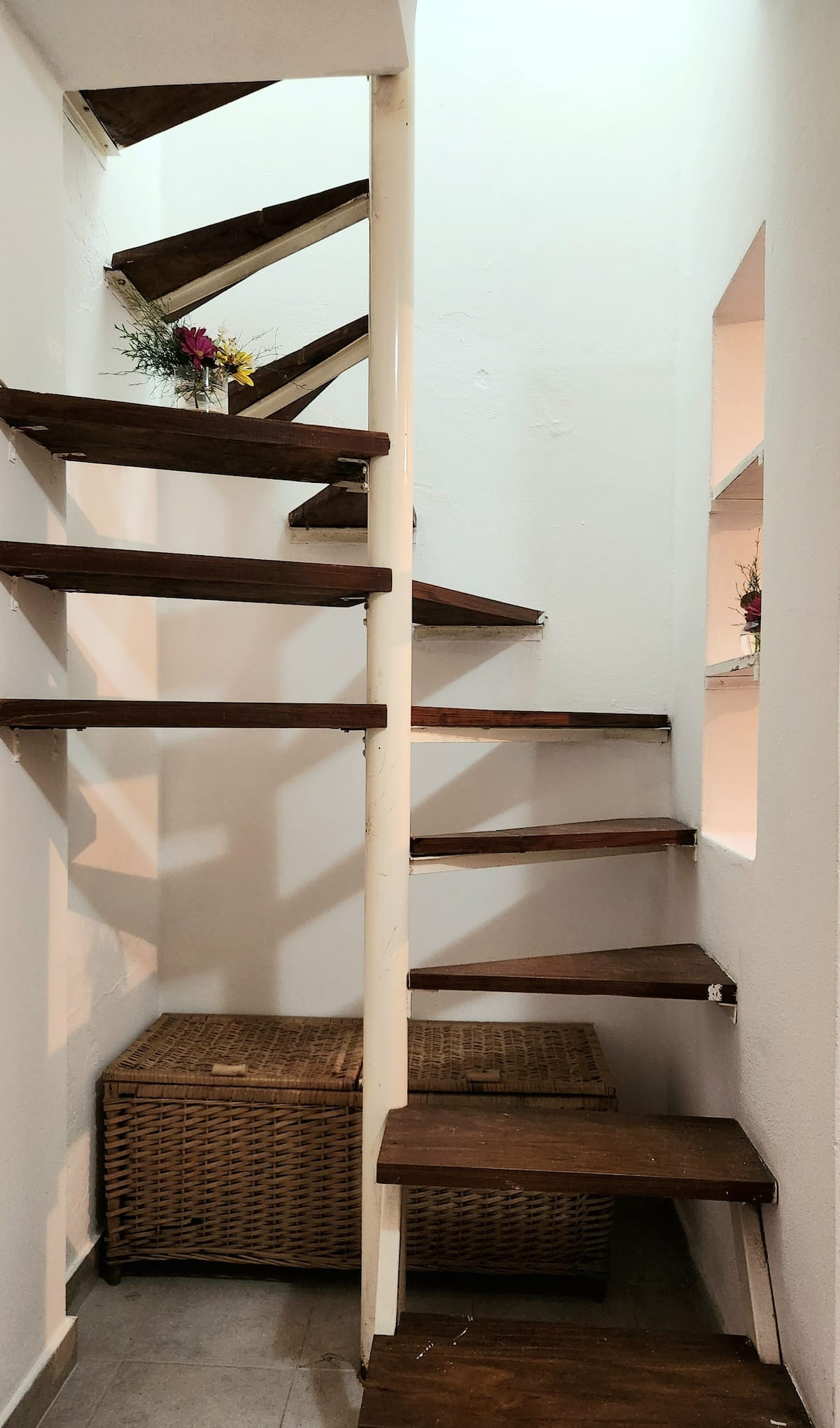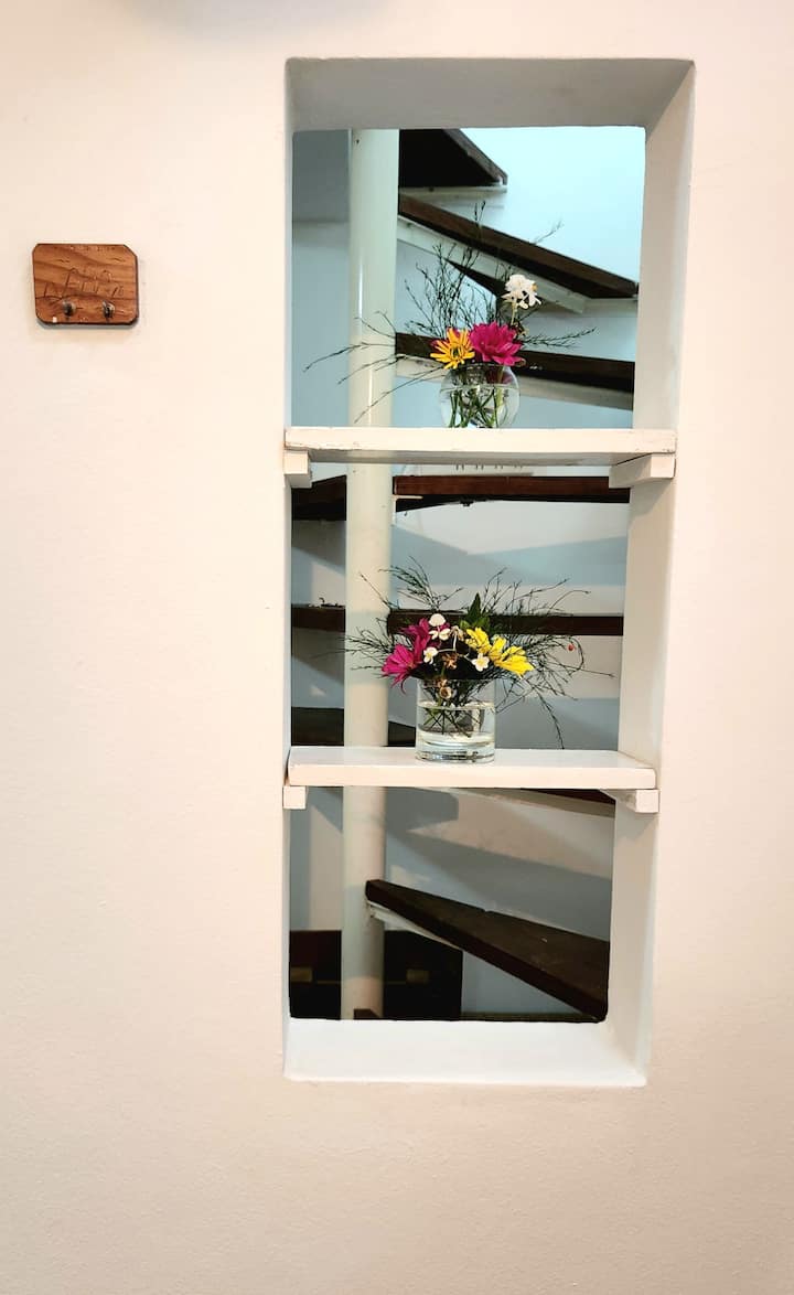 Two-storey cottage apartment of the “Garden House” type in La Lucila, accessed via a separate entrance. It includes a built-in kitchen with dining area and a private bathroom on the ground floor, and a bedroom on the second floor with wardrobes and a desk overlooking the garden. Guests have use of the garden, an outdoor pool and an external dining room, and there is reserved street parking in front of the white entrance gate.