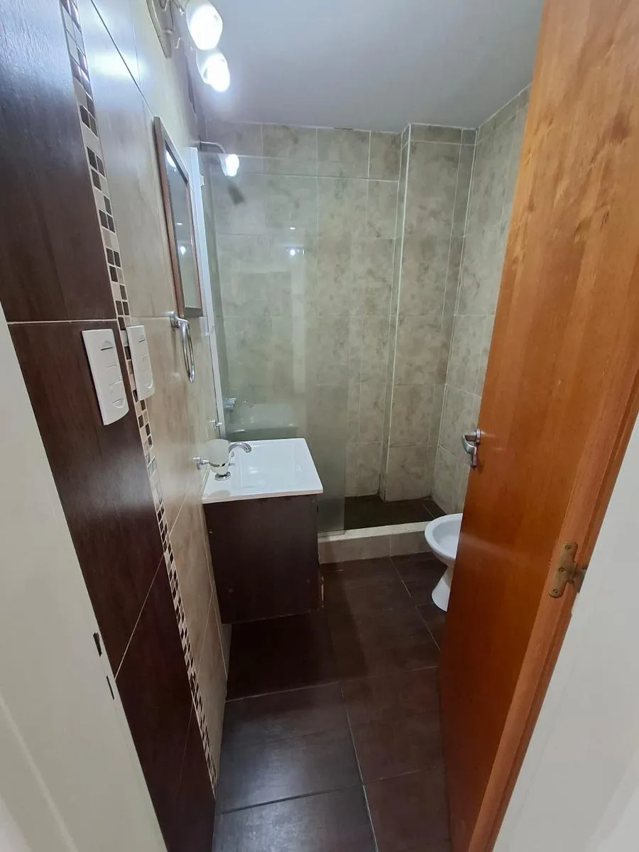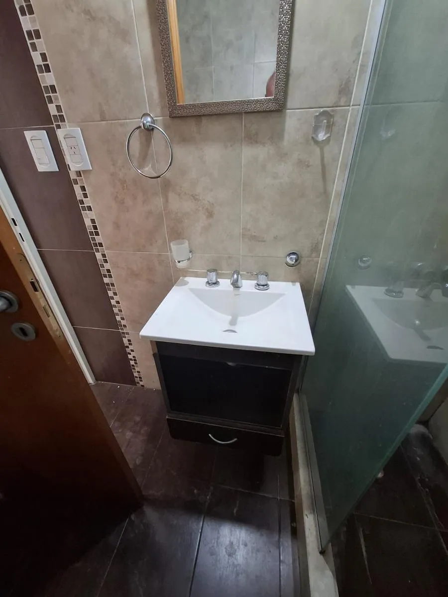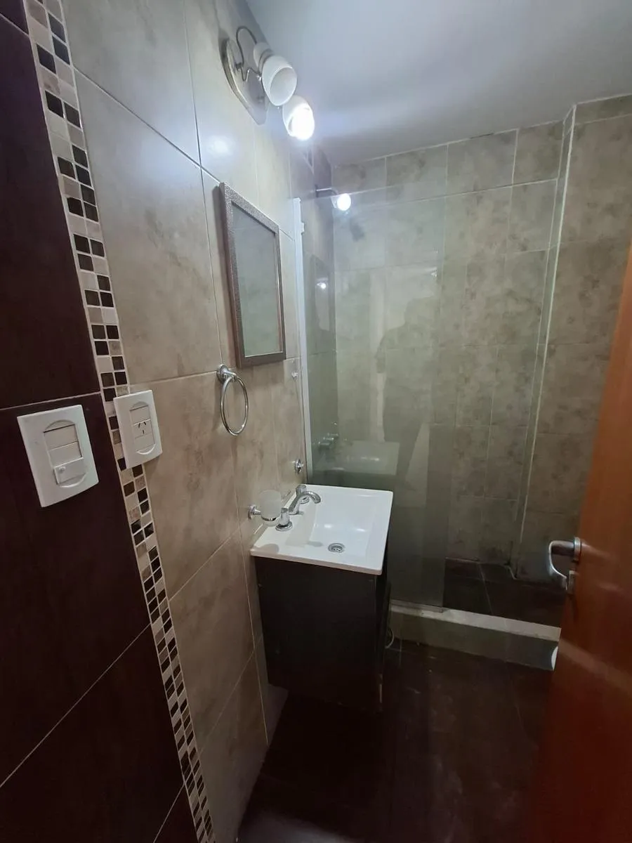 Two-room apartment with a balcony, street-facing, in Ramos Mejía. It has a living-dining room, kitchen, 1 bedroom and a full bathroom. The building has a lift and a pool on the ground floor at the rear.