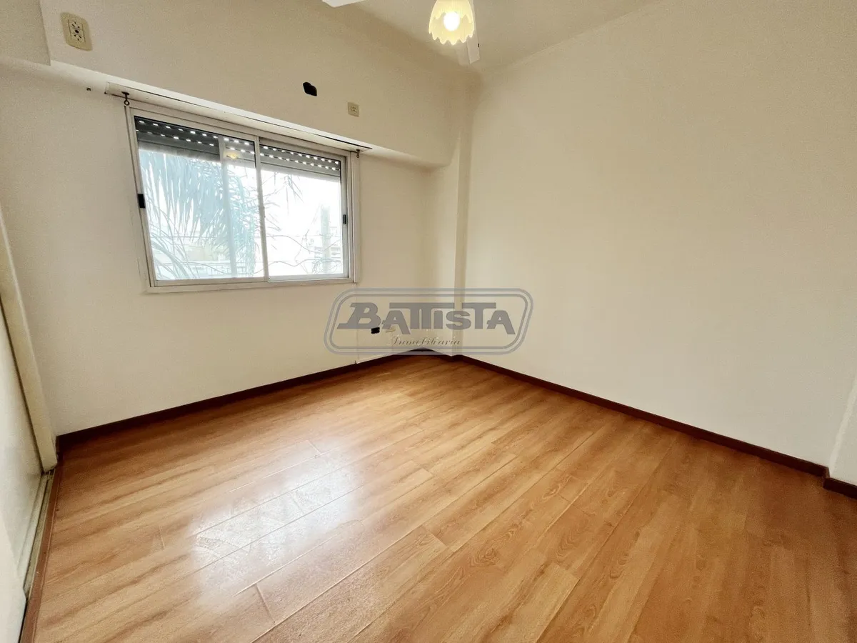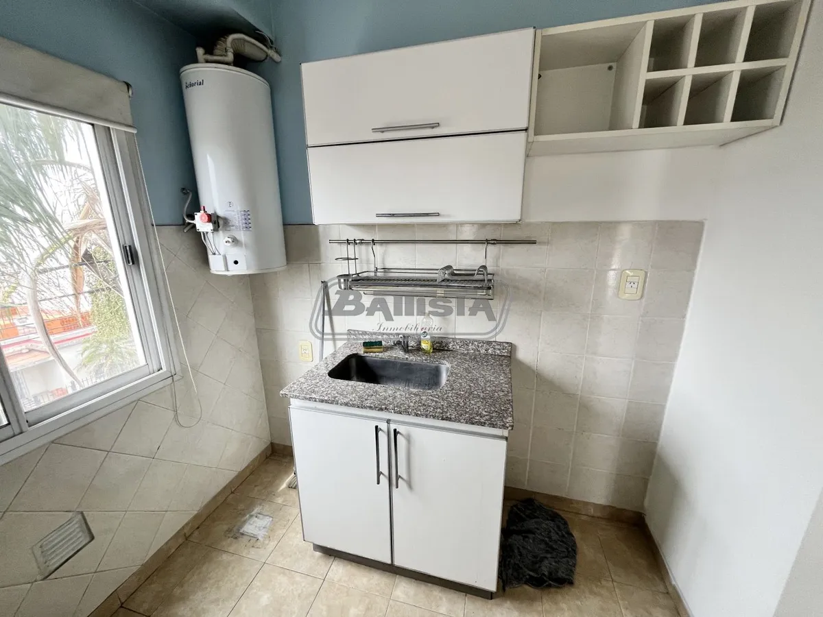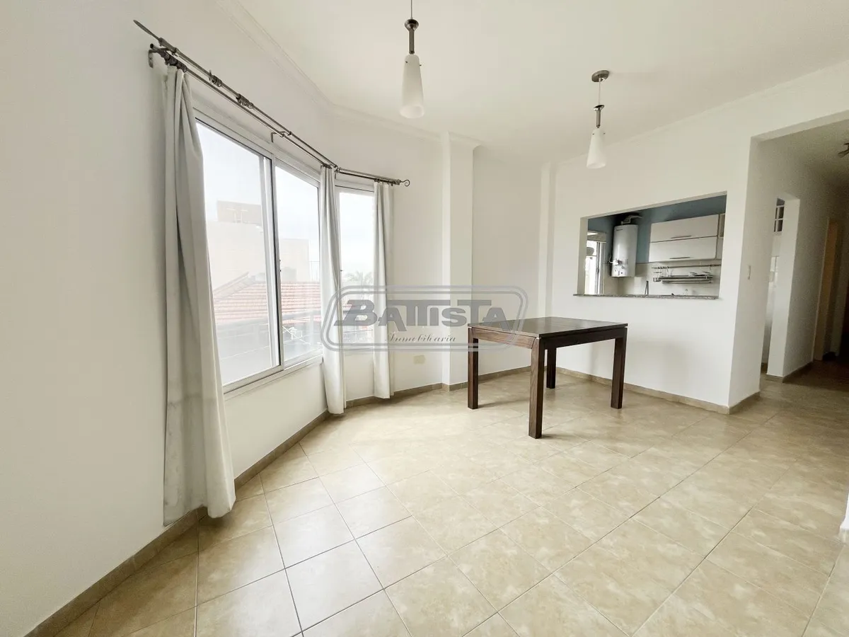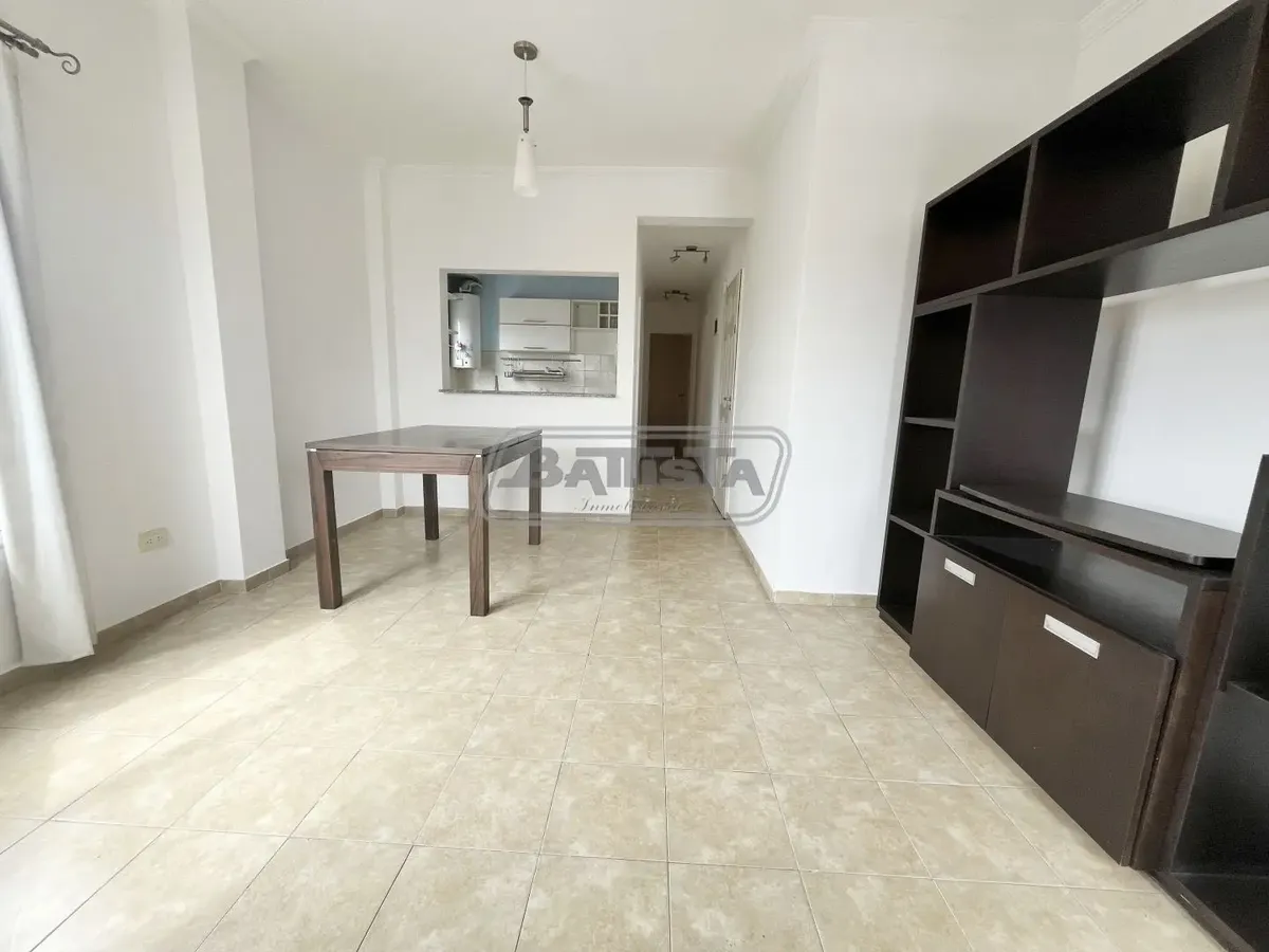 Two-room apartment with living-dining area street-facing with ceramic flooring and a balcony. Semi-integrated kitchen with base cabinets and pantry, plus a laundry space. Complete bathroom and front bedroom with floating floor and built-in wardrobe with interior fittings. In good condition.