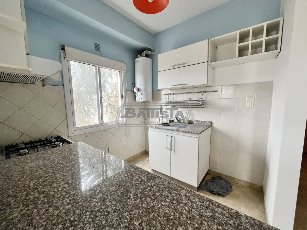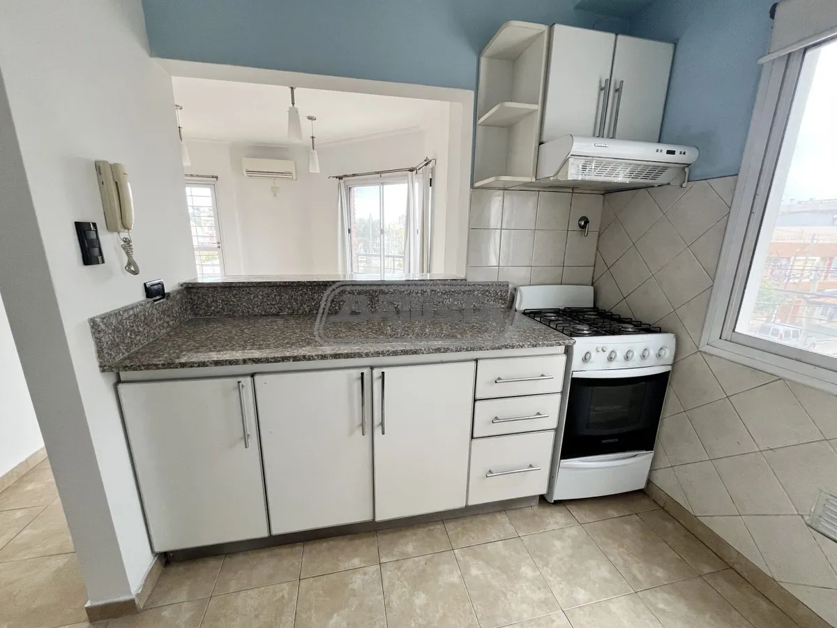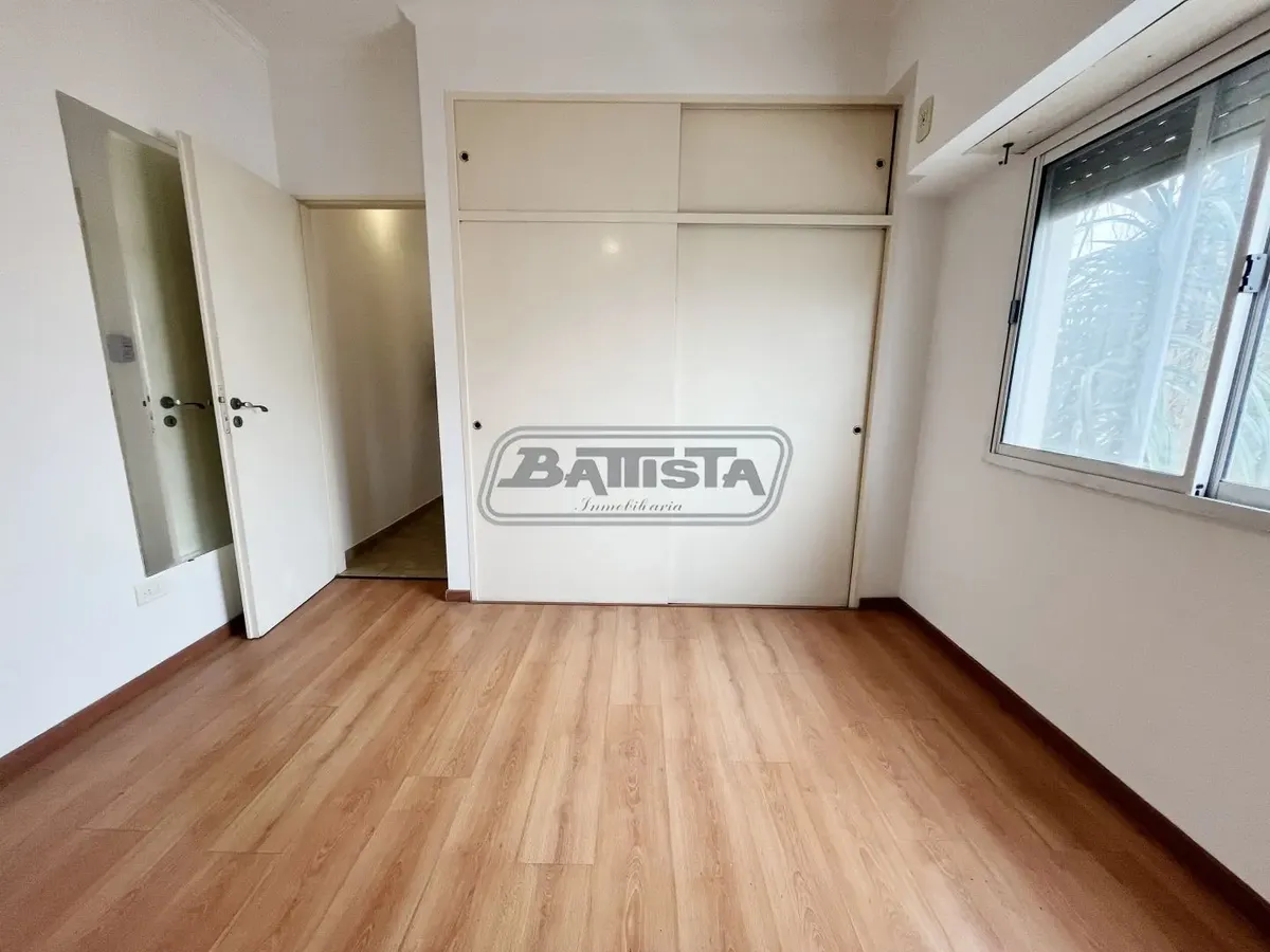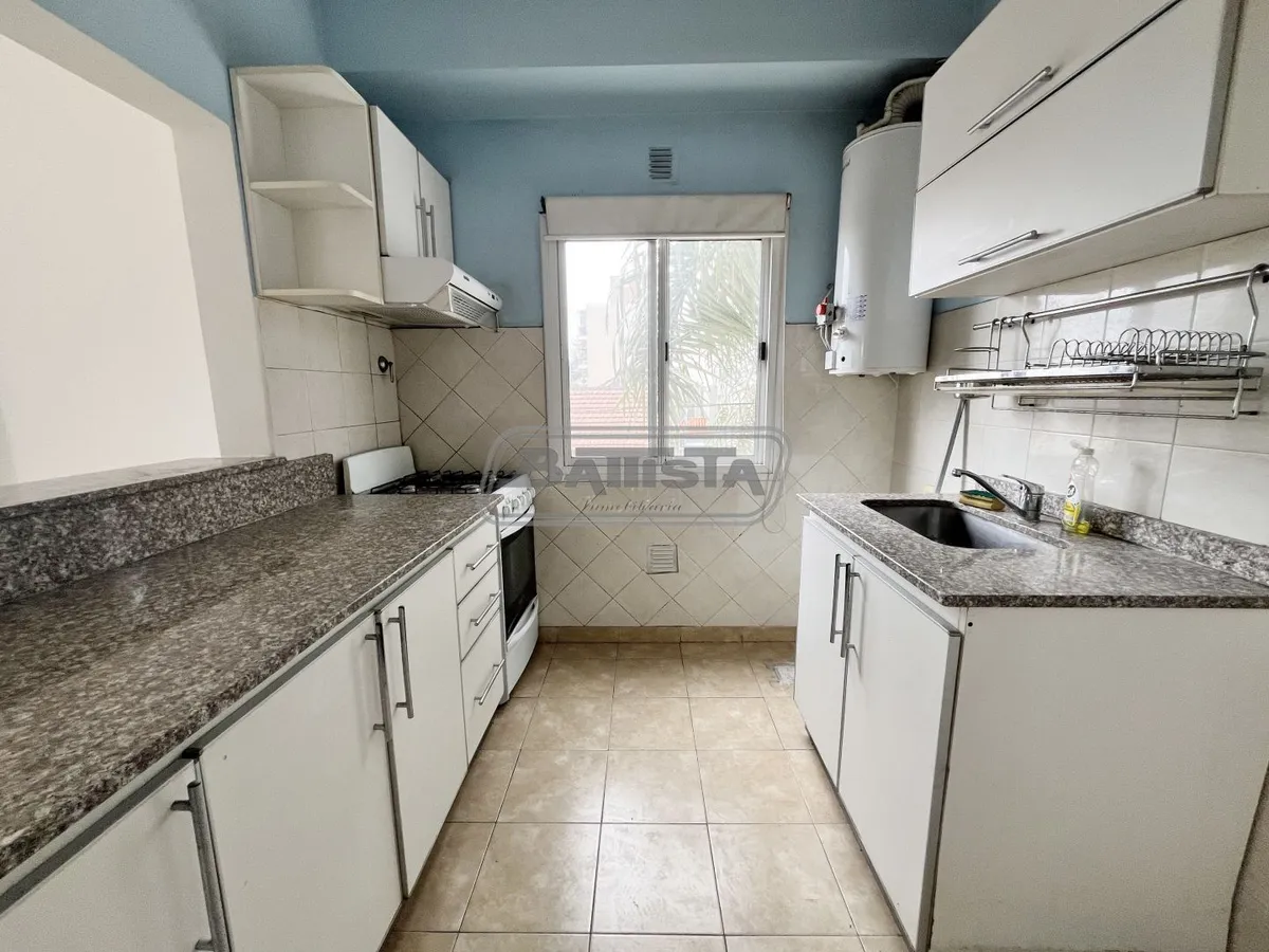 Two-room apartment with living-dining area street-facing with ceramic flooring and a balcony. Semi-integrated kitchen with base cabinets and pantry, plus a laundry space. Complete bathroom and front bedroom with floating floor and built-in wardrobe with interior fittings. In good condition.
