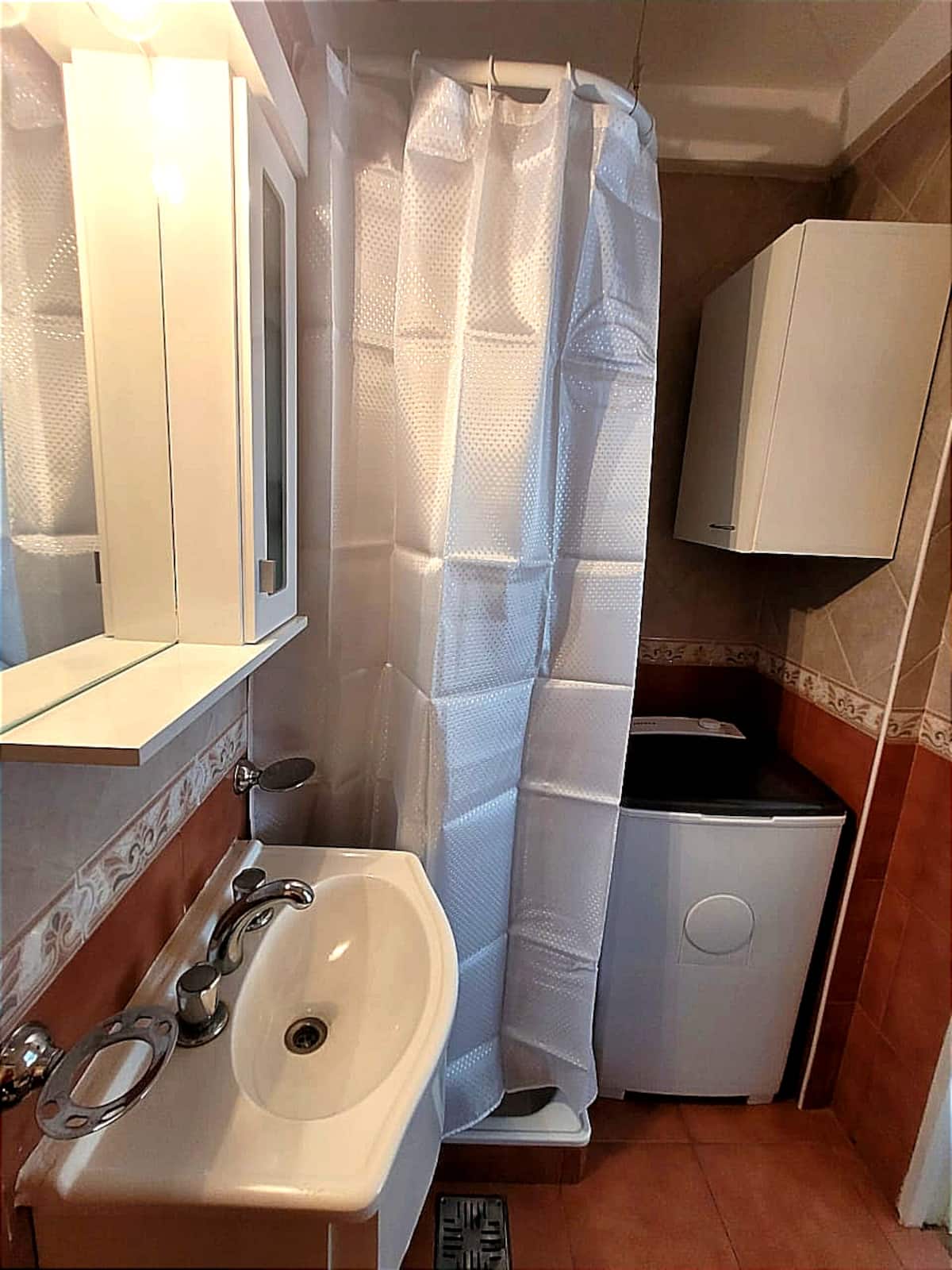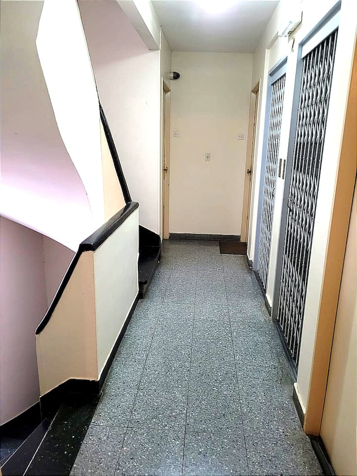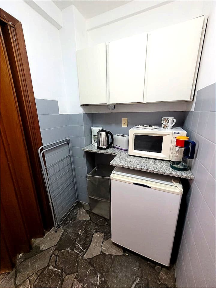 One-bedroom apartment with 42 m² on the 2nd floor. Living-dining room with a double sofa bed and a separate bedroom. Air conditioning in the living area, fully equipped kitchen, and a bathroom with WC, hand sink and shower. Washing machine is semi-automatic; gas oven. Two lifts and stairs in the building; about a 4-minute walk to the train station and under 10 minutes on foot to downtown.