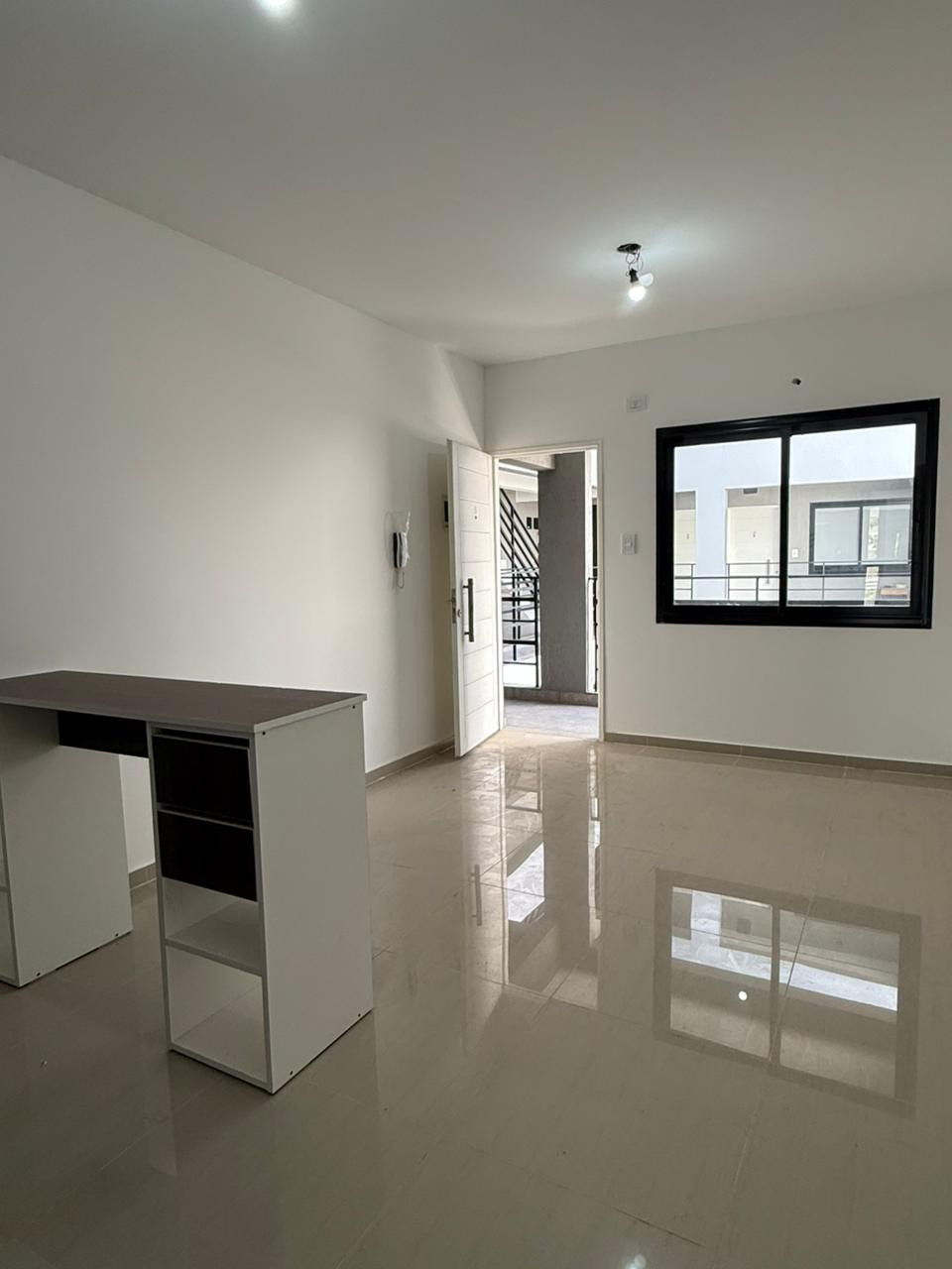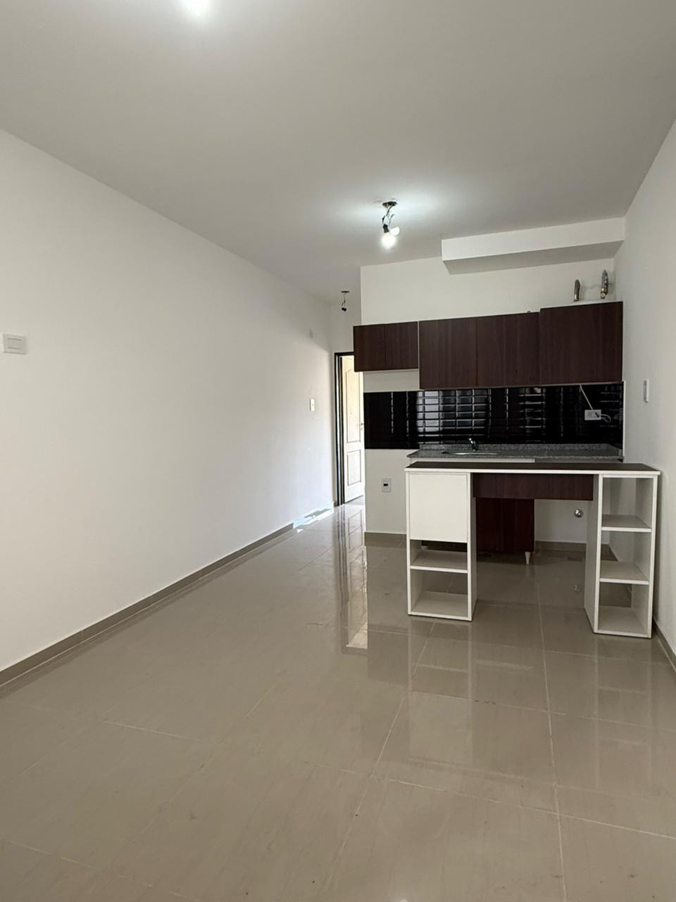 One-bedroom apartment on the 1st floor with an integrated kitchen, living-dining area, a bedroom with built-in wardrobe, and a bathroom. The unit includes an uncovered (non-assigned) parking space. Building has an elevator, and building fees include the municipal component.