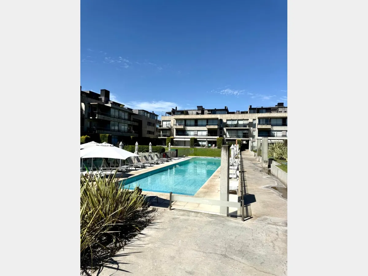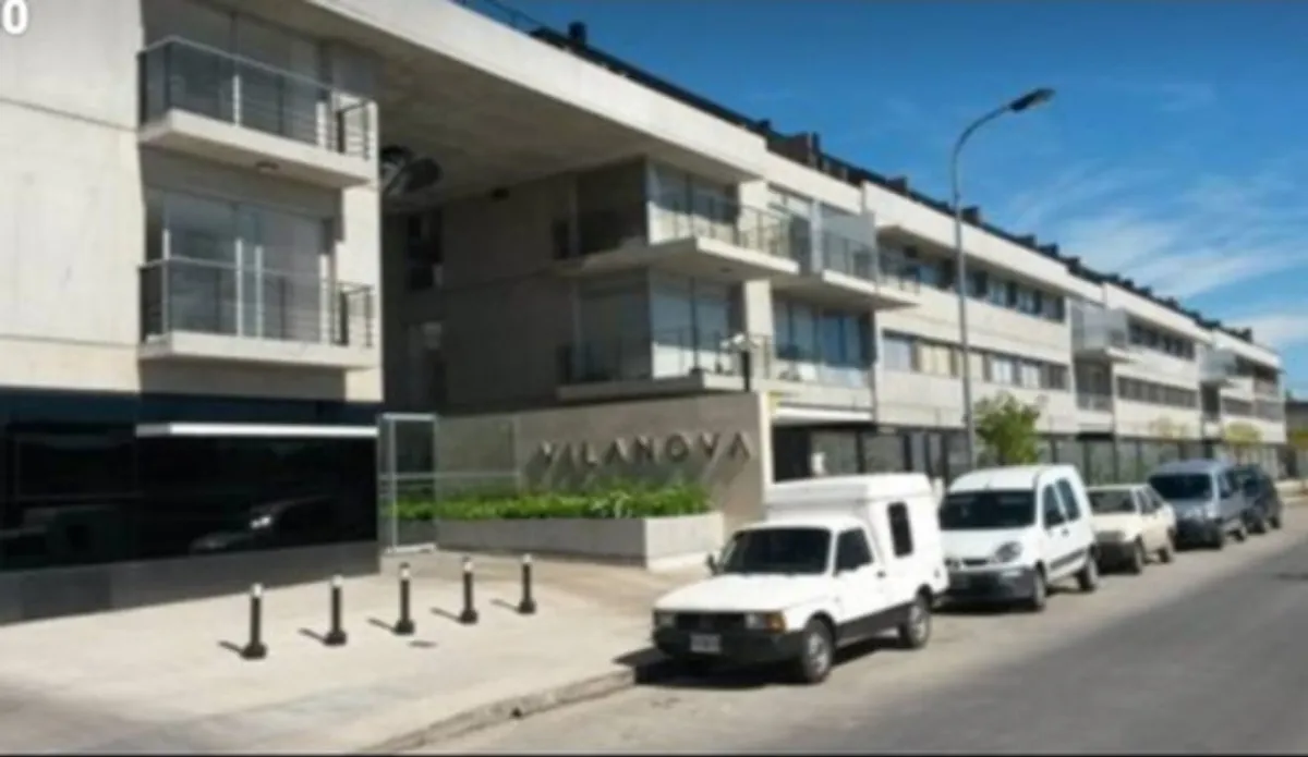 Studio apartment in the Vilanova complex, 35 m² on the ground floor with a front balcony and covered parking. The unit has air conditioning, fully equipped built-in furniture with countertop, and a bathroom with a bathtub. The building offers 24-hour security, pool, gym, micro-cinema, solarium, sauna, laundry facilities and changing rooms, and the rent increases quarterly based on IPC.