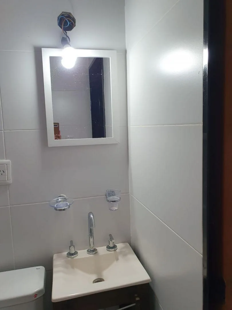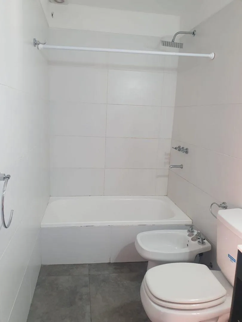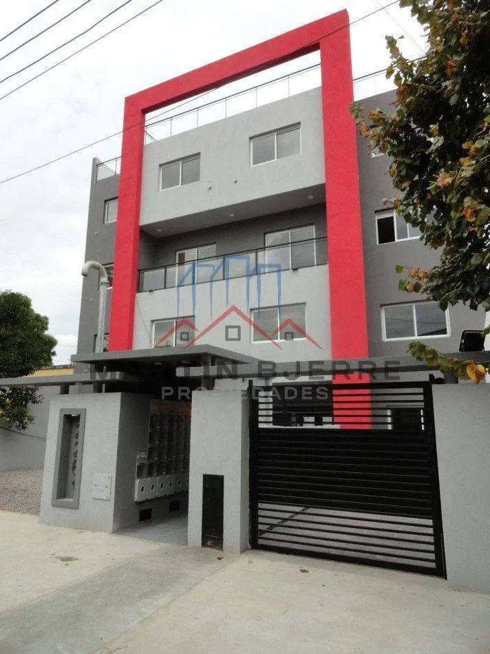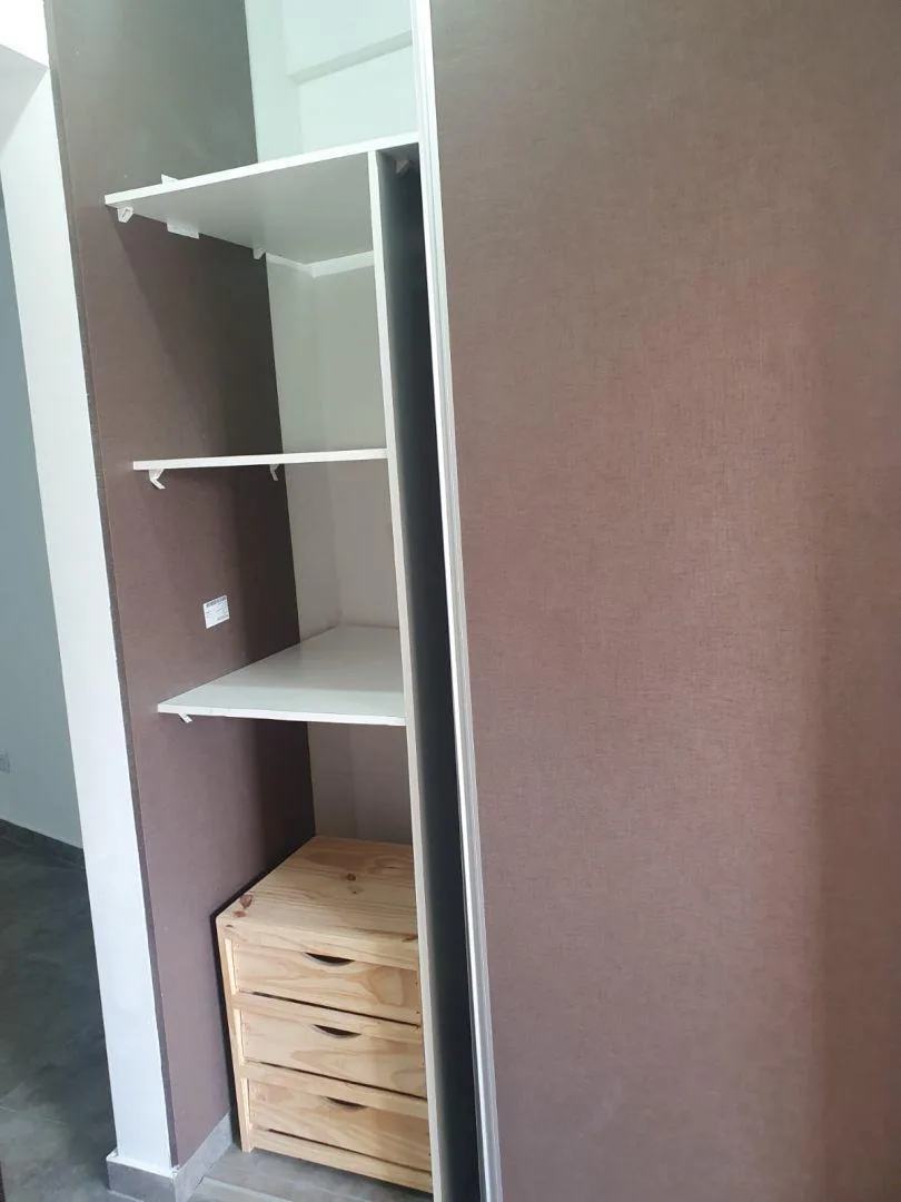 Two-room apartment for rent in Ciudad Evita, La Matanza, with street-facing layout and a balcony with open views. 43 m². Integrated kitchen with cooking appliance, water heater, and stainless-steel range hood; bedroom with built-in wardrobe. The building has a lift and automated gate. Terrace amenities include a fully equipped communal room (SUM) and grills. Building features include aluminium windows. No pets. Requirements include proof of income with at least 3 years of employment seniority or
