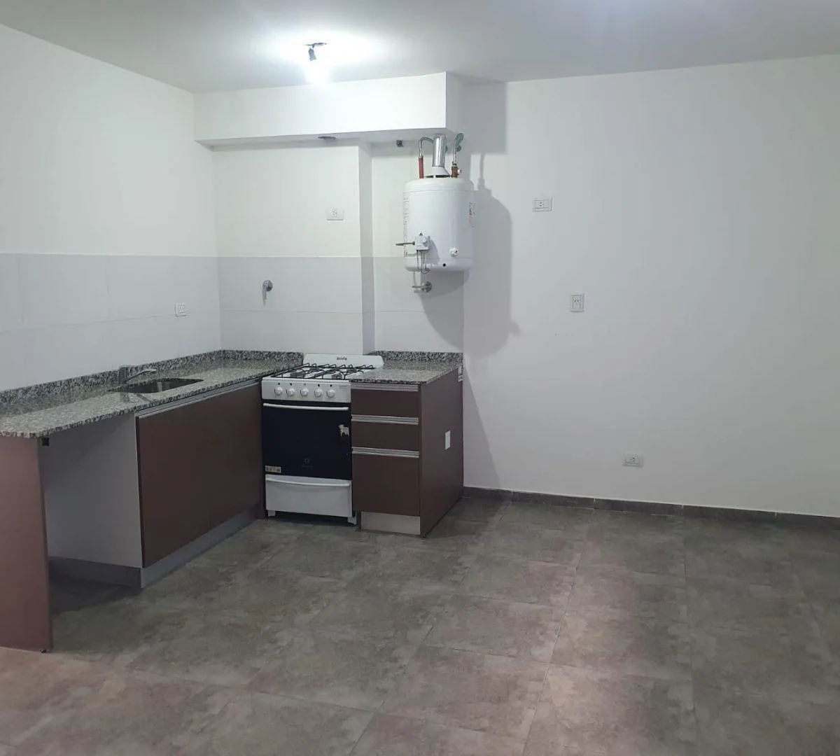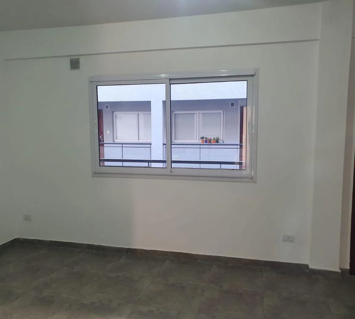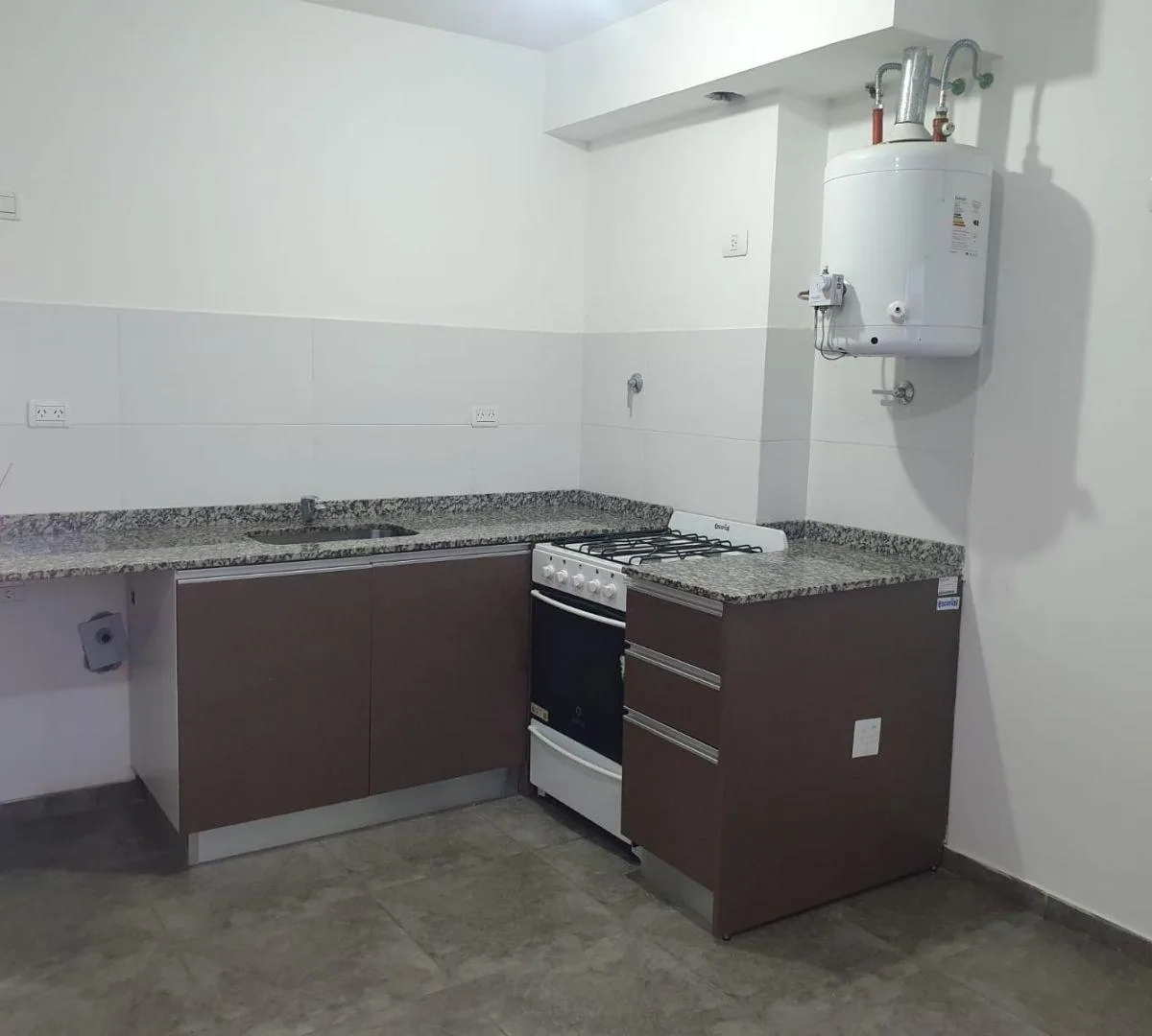 Two-room apartment for rent in Ciudad Evita, La Matanza, with street-facing layout and a balcony with open views. 43 m². Integrated kitchen with cooking appliance, water heater, and stainless-steel range hood; bedroom with built-in wardrobe. The building has a lift and automated gate. Terrace amenities include a fully equipped communal room (SUM) and grills. Building features include aluminium windows. No pets. Requirements include proof of income with at least 3 years of employment seniority or