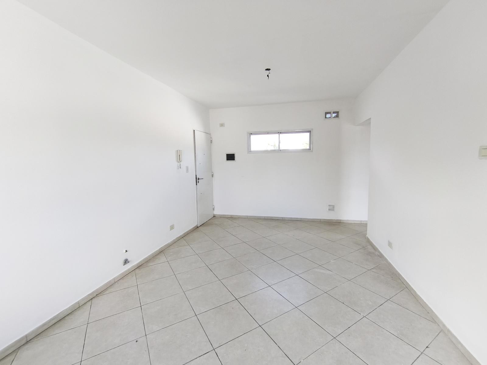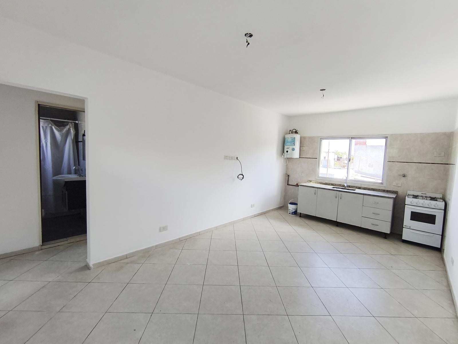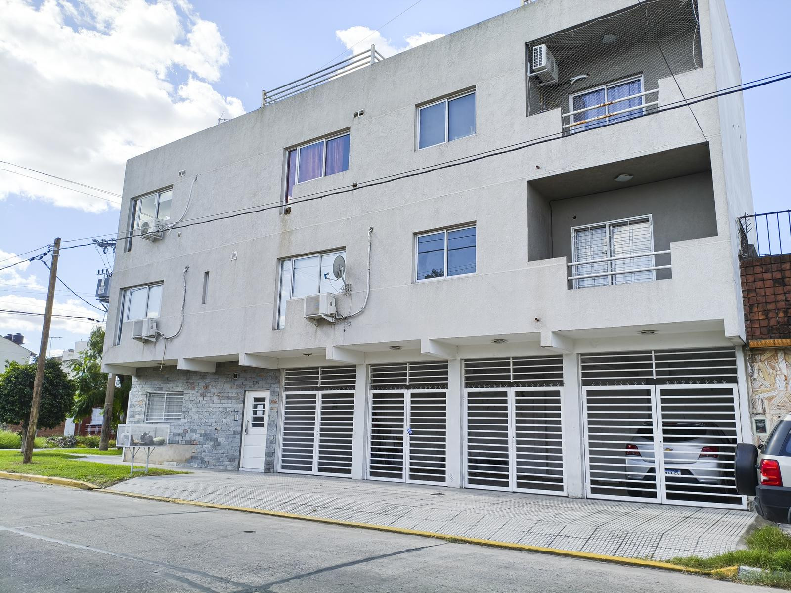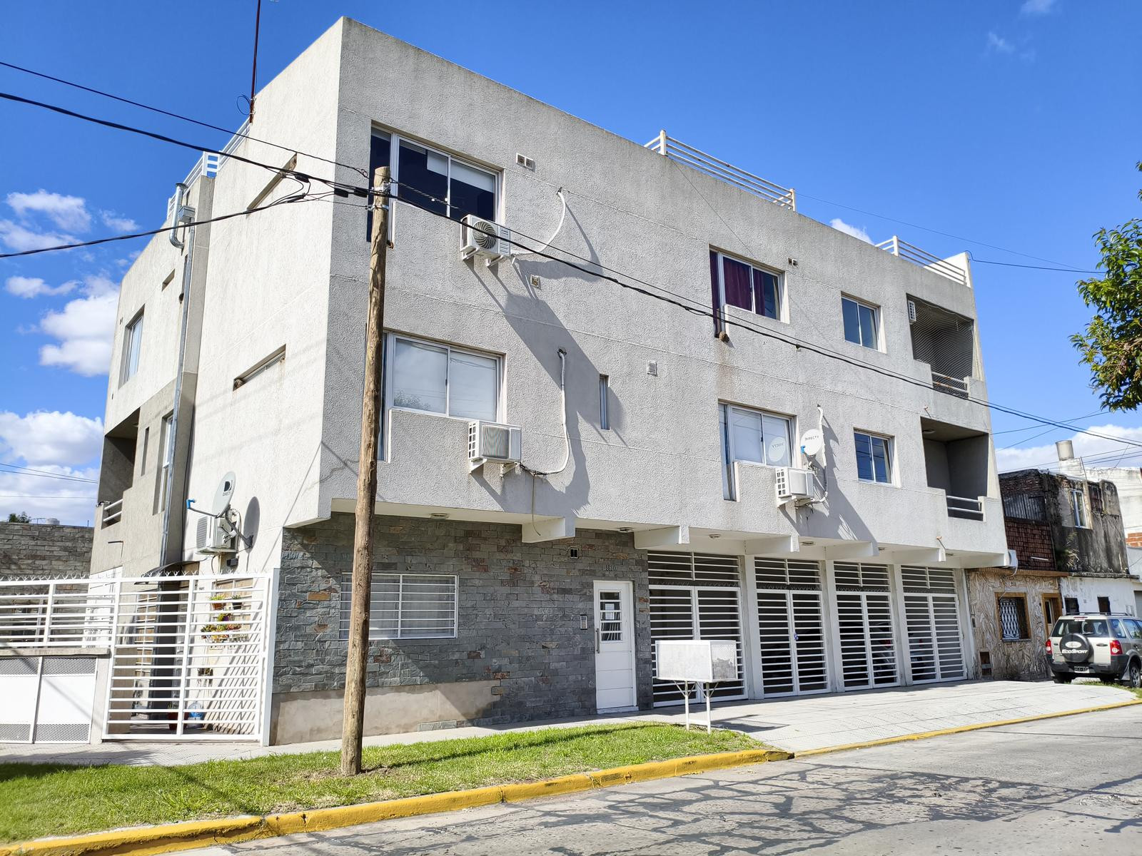 Two-room apartment with 1 bedroom, on the ground floor (first floor by stairs) in Villa Luzuriaga, La Matanza Partido. Includes a front-facing balcony and an (assigned) parking space. The building is 8 years old and the unit is described as in good condition.