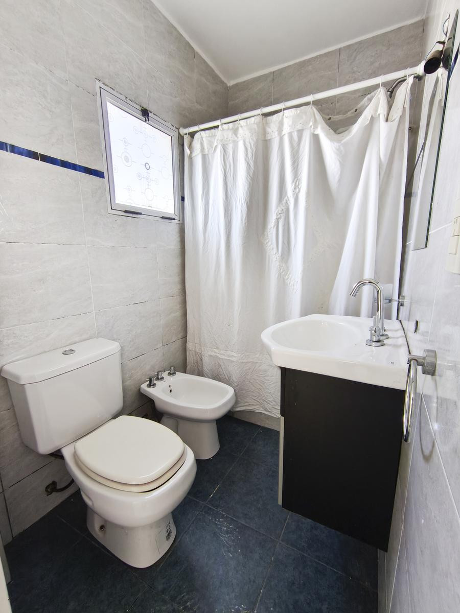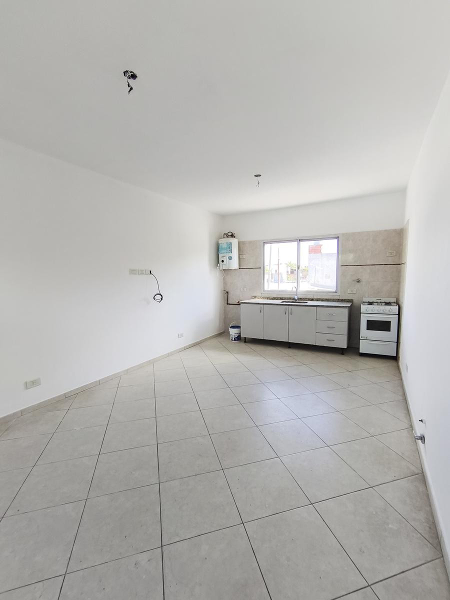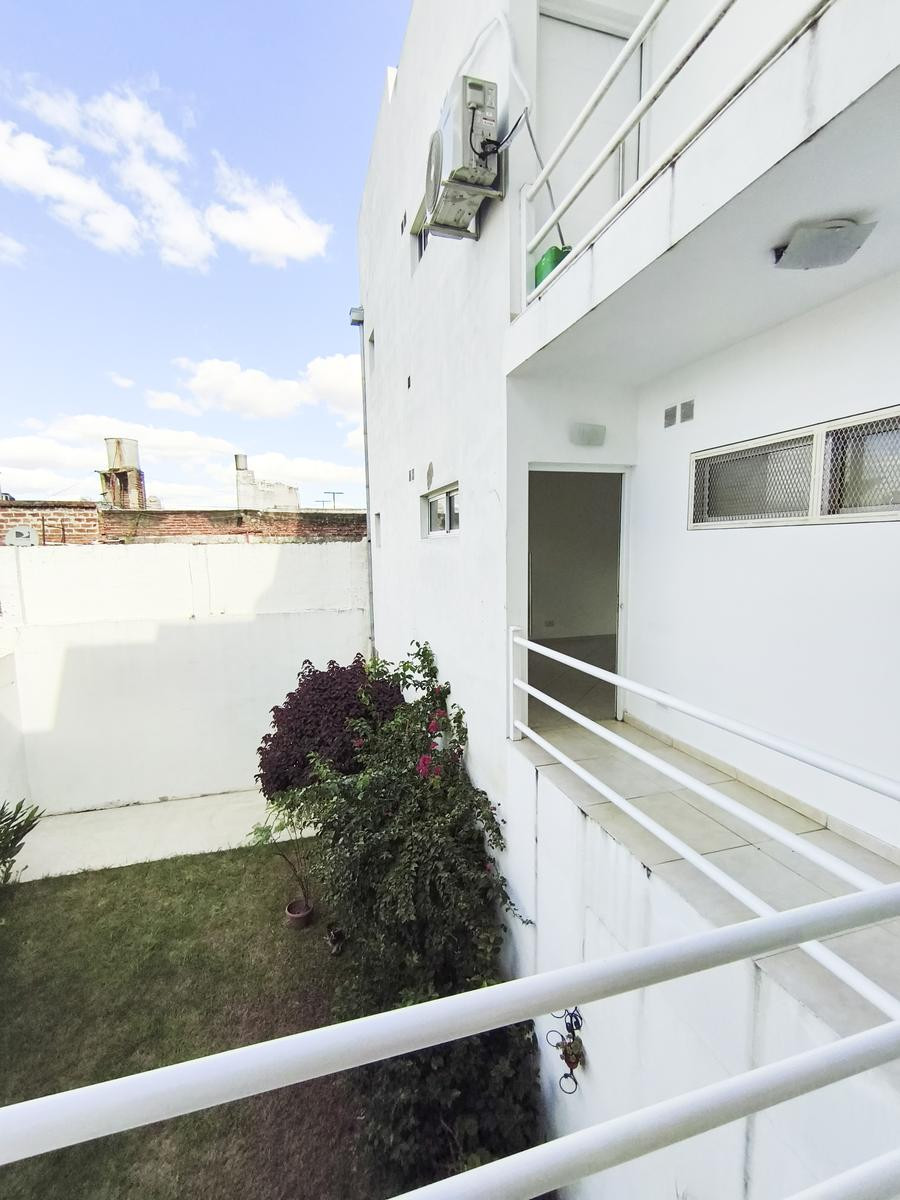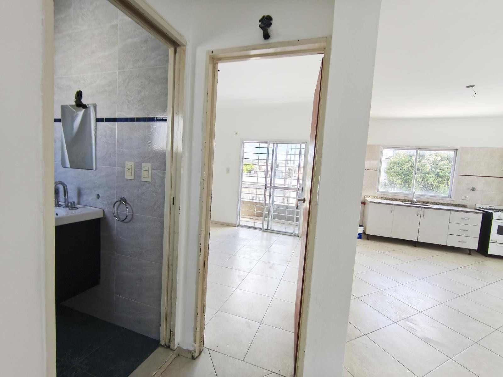 Two-room apartment with 1 bedroom, on the ground floor (first floor by stairs) in Villa Luzuriaga, La Matanza Partido. Includes a front-facing balcony and an (assigned) parking space. The building is 8 years old and the unit is described as in good condition.