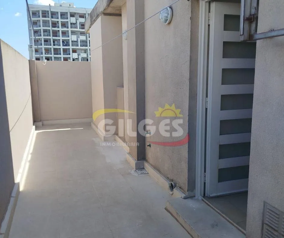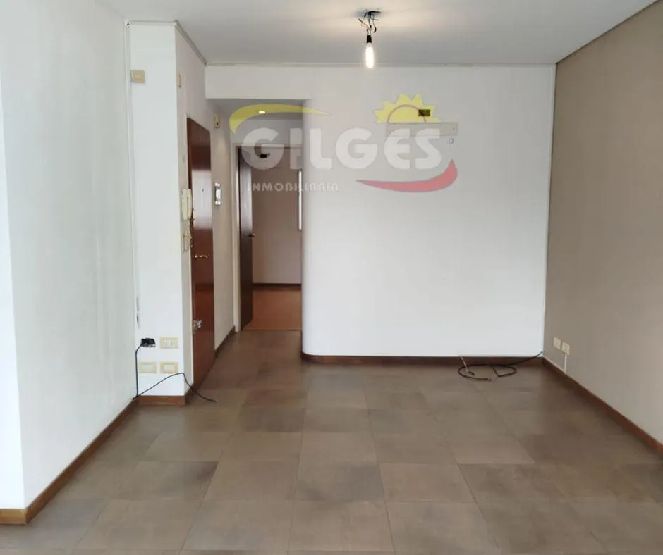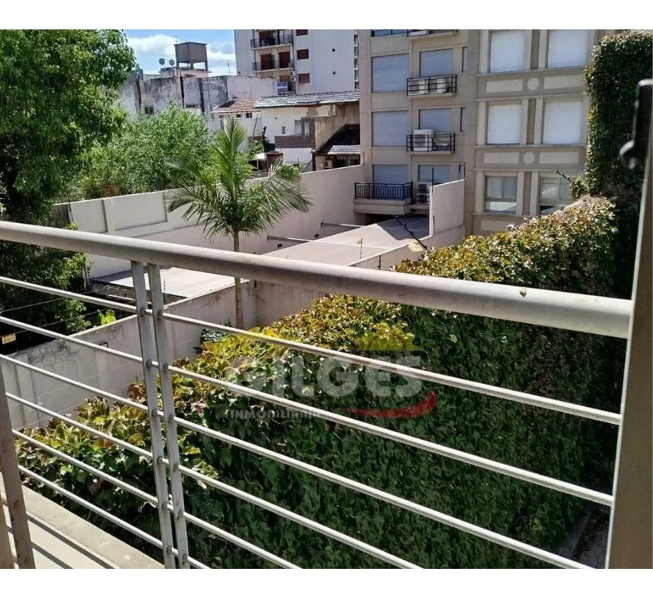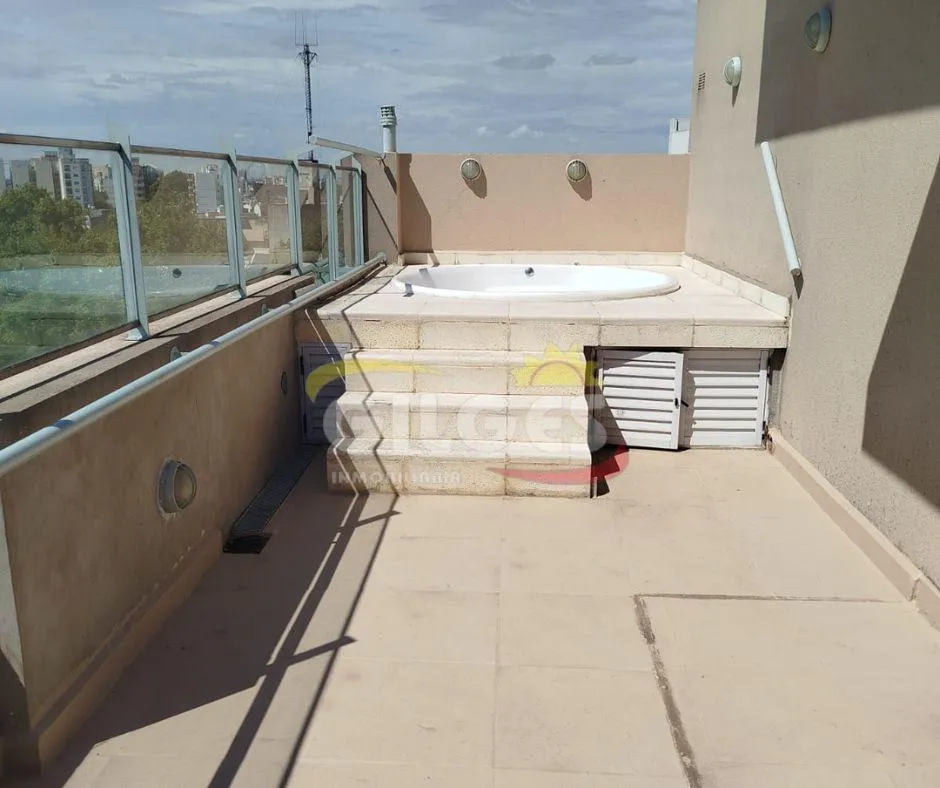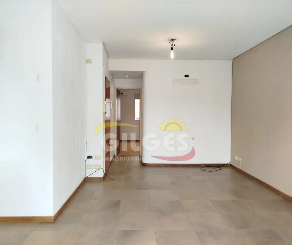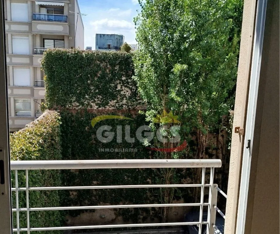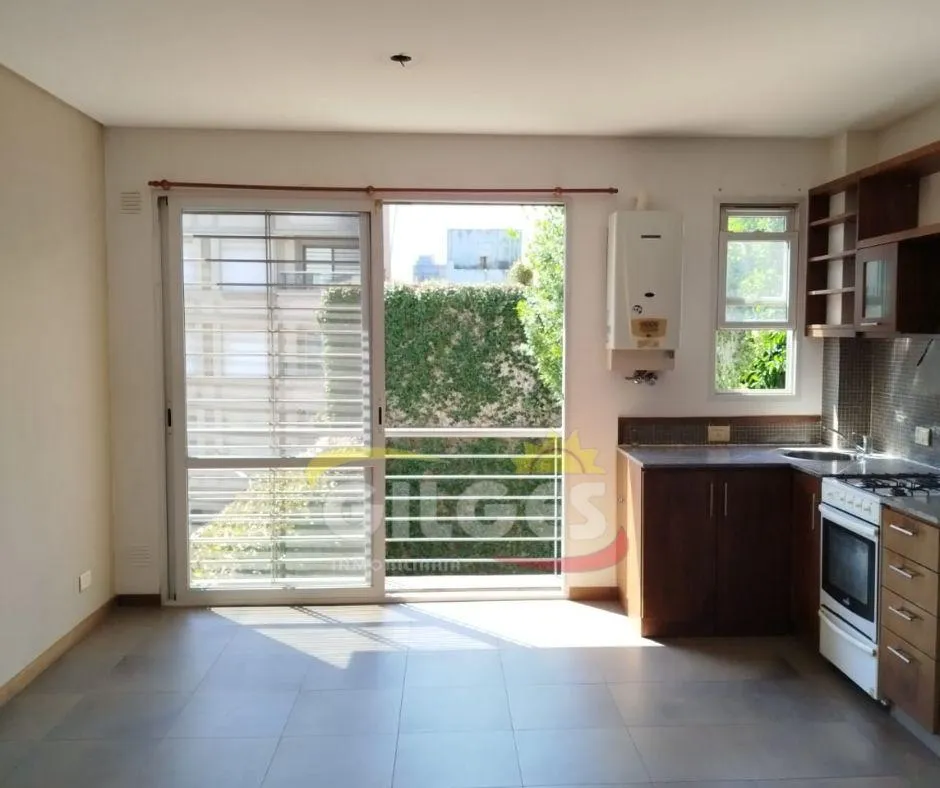 Two-room apartment at the back of the building (courtyard-facing), in good condition. The unit includes a living-dining area, an integrated kitchen with cooking appliances and space for a fridge, a French balcony, one bedroom with built-in floor-to-ceiling wardrobe, and a full bathroom with bathtub and vanity. Building amenities include a lift, a shared terrace with a grill and jacuzzi, and a shared laundry with a washing machine. Building fees include Aysa and municipal charges; a family proper