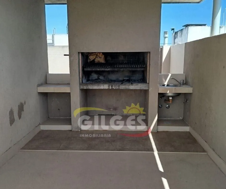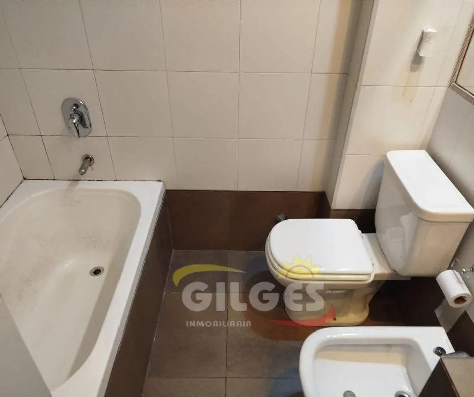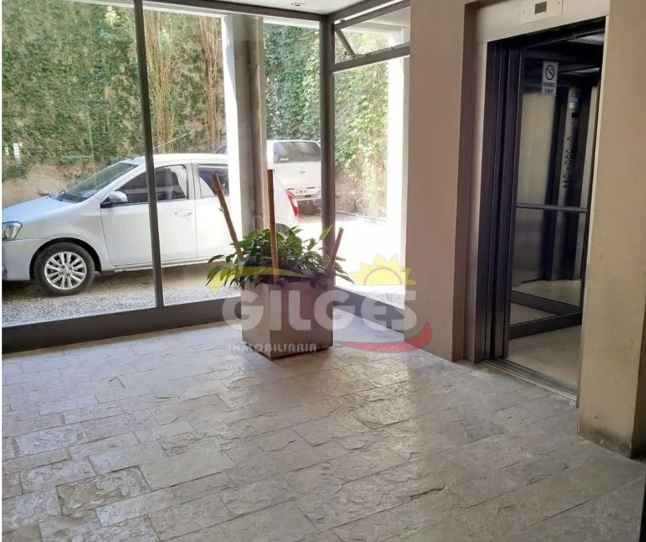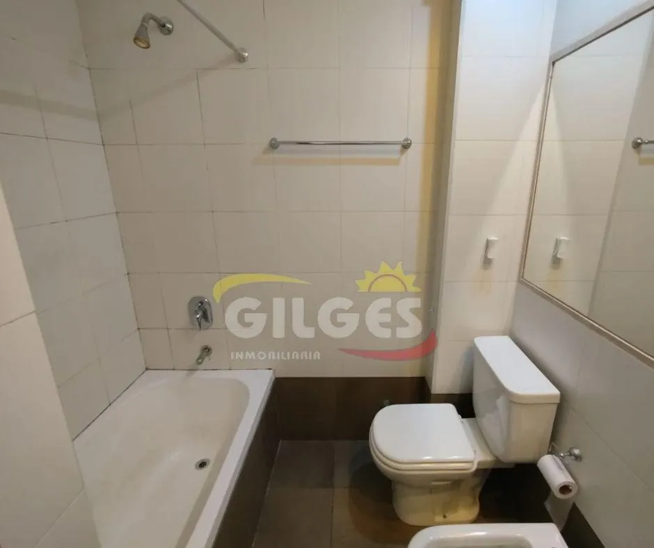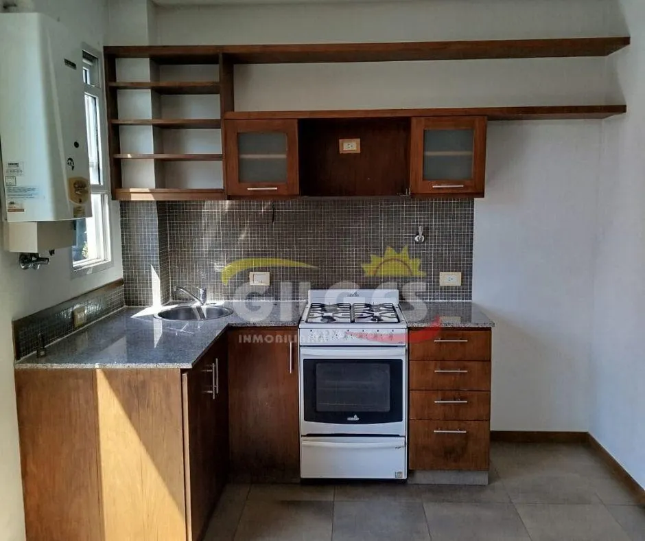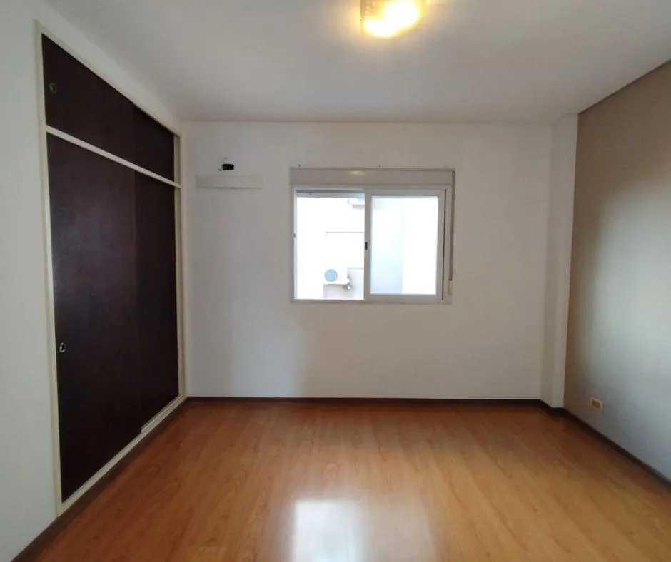 Two-room apartment at the back of the building (courtyard-facing), in good condition. The unit includes a living-dining area, an integrated kitchen with cooking appliances and space for a fridge, a French balcony, one bedroom with built-in floor-to-ceiling wardrobe, and a full bathroom with bathtub and vanity. Building amenities include a lift, a shared terrace with a grill and jacuzzi, and a shared laundry with a washing machine. Building fees include Aysa and municipal charges; a family proper