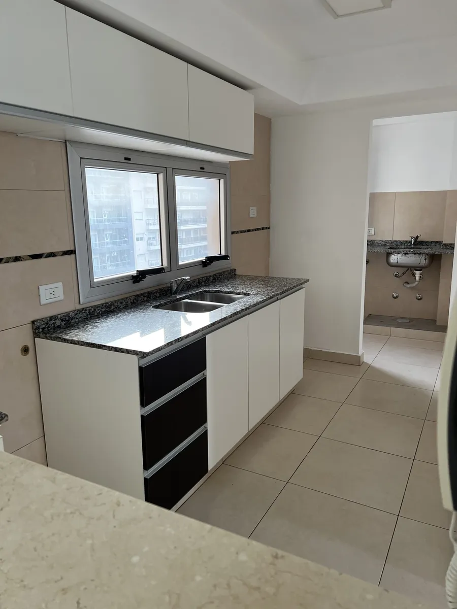 Two-room apartment for rent in Lanús Oeste, 2 blocks from Av. Hipólito Yrigoyen. The layout includes a living-dining area, an integrated kitchen separated by a marble breakfast bar, a full bathroom and a bedroom with built-in wardrobes with sliding doors and drawers. Building fees are described as low and include ABL, Edesur and AYSA.