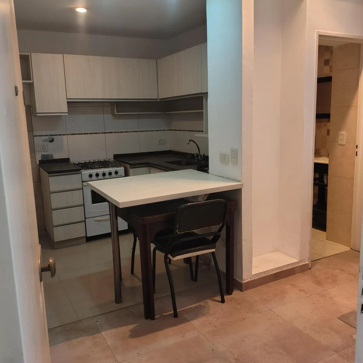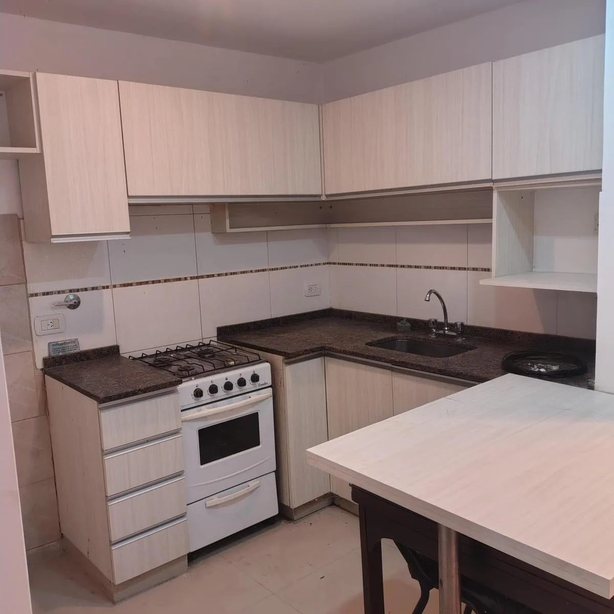 PH apartment with a modern bathroom and a fitted kitchen with overhead cabinets, base units and a built-in breakfast bar, brand new. Space for a washing machine and a bedroom with a built-in wardrobe with mirror, plus a TV deck and a hanging cabinet (optional). Deck is mentioned as part of the unit, and the listing states all services (water, gas and electricity). Located 1 block from Av.