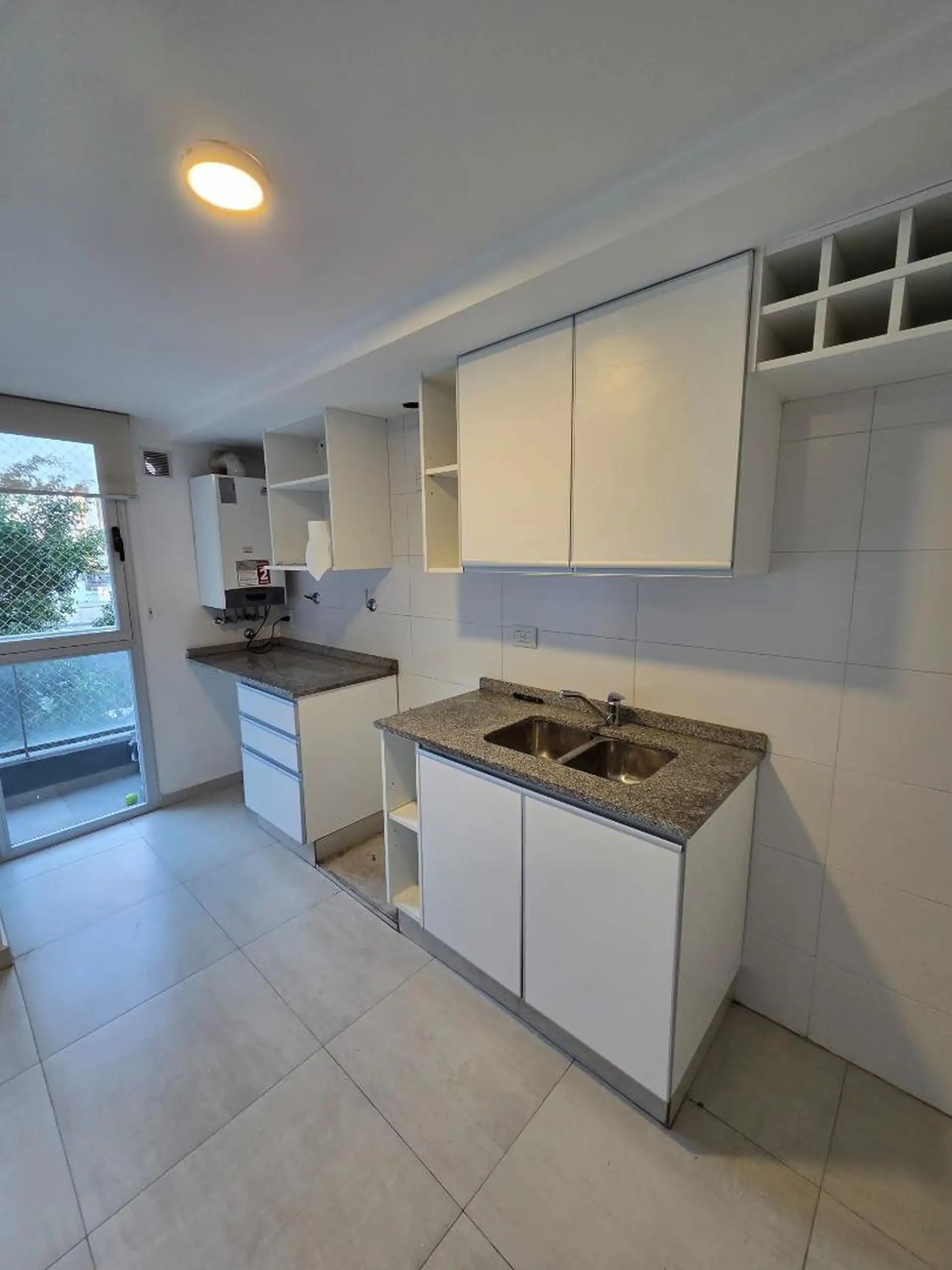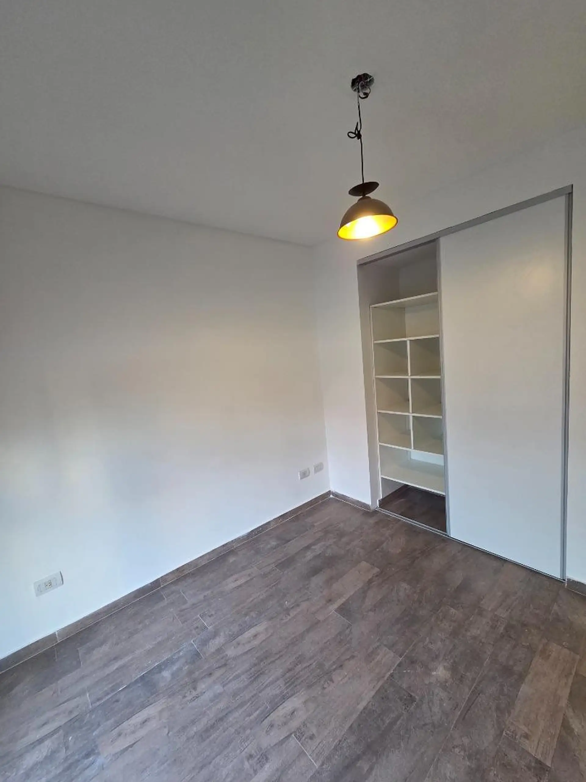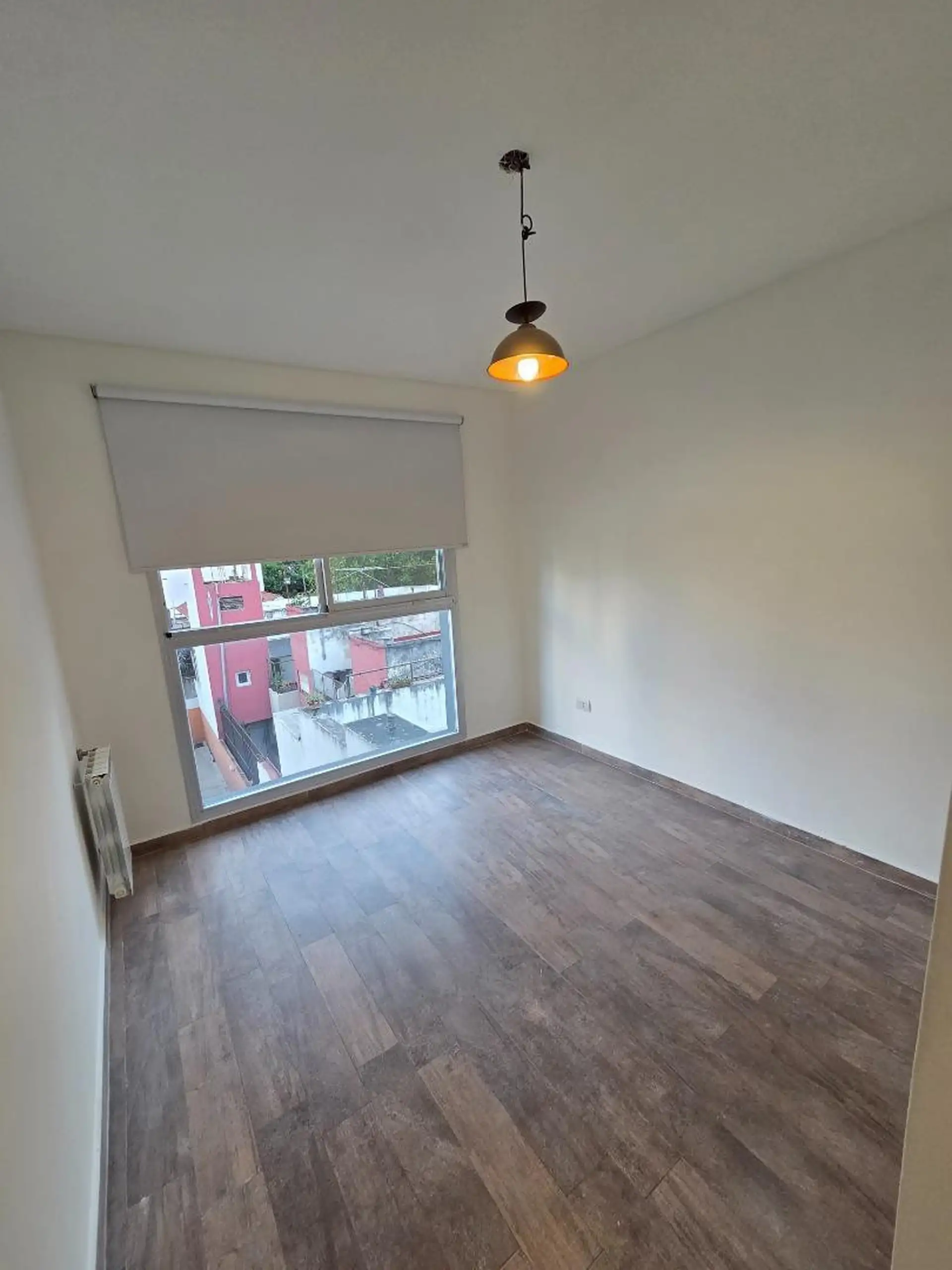 Two-room apartment in Lomas de Zamora with a balcony at the front. It includes a living-dining room with porcelain-tile floors, an integrated kitchen with lower and upper cabinets, and a dual-boiler heating system. The bedroom has floating floors and a built-in wardrobe; the full bathroom has a bathtub and vanity. Rent is advertised at $110,000 plus building fees and services (cloacas and gas), with a two-year contract and quarterly updates based on ICL; income proof and three guarantors are req