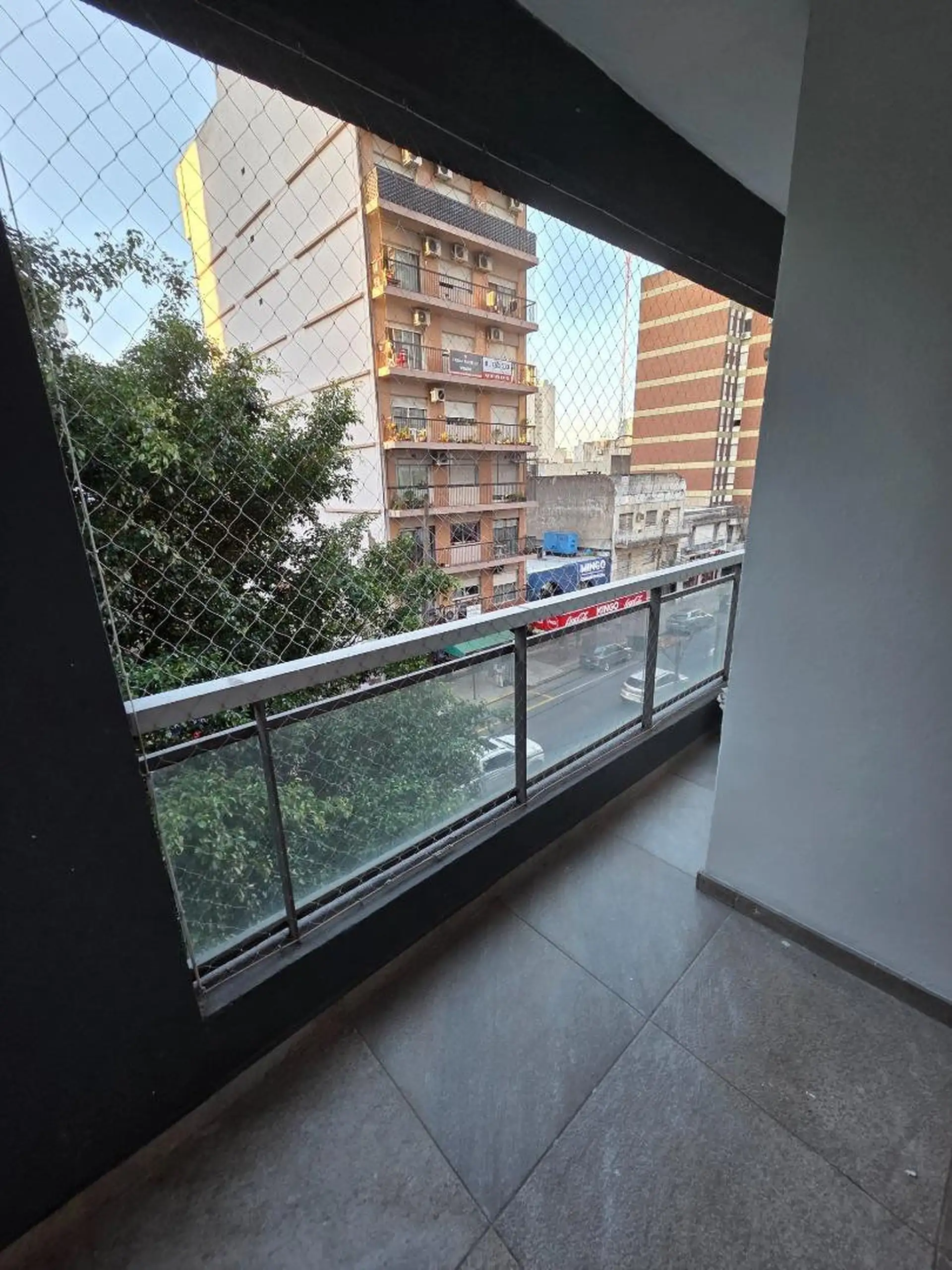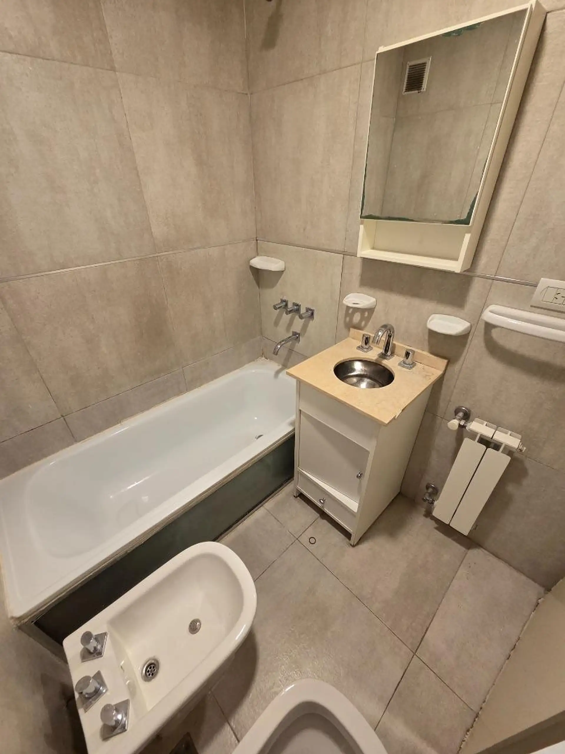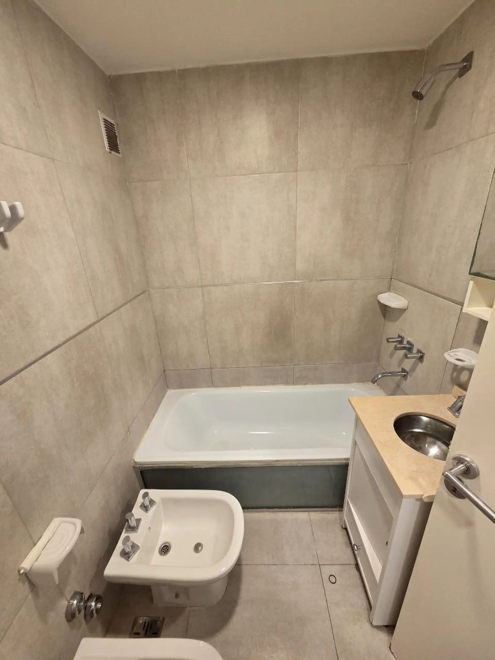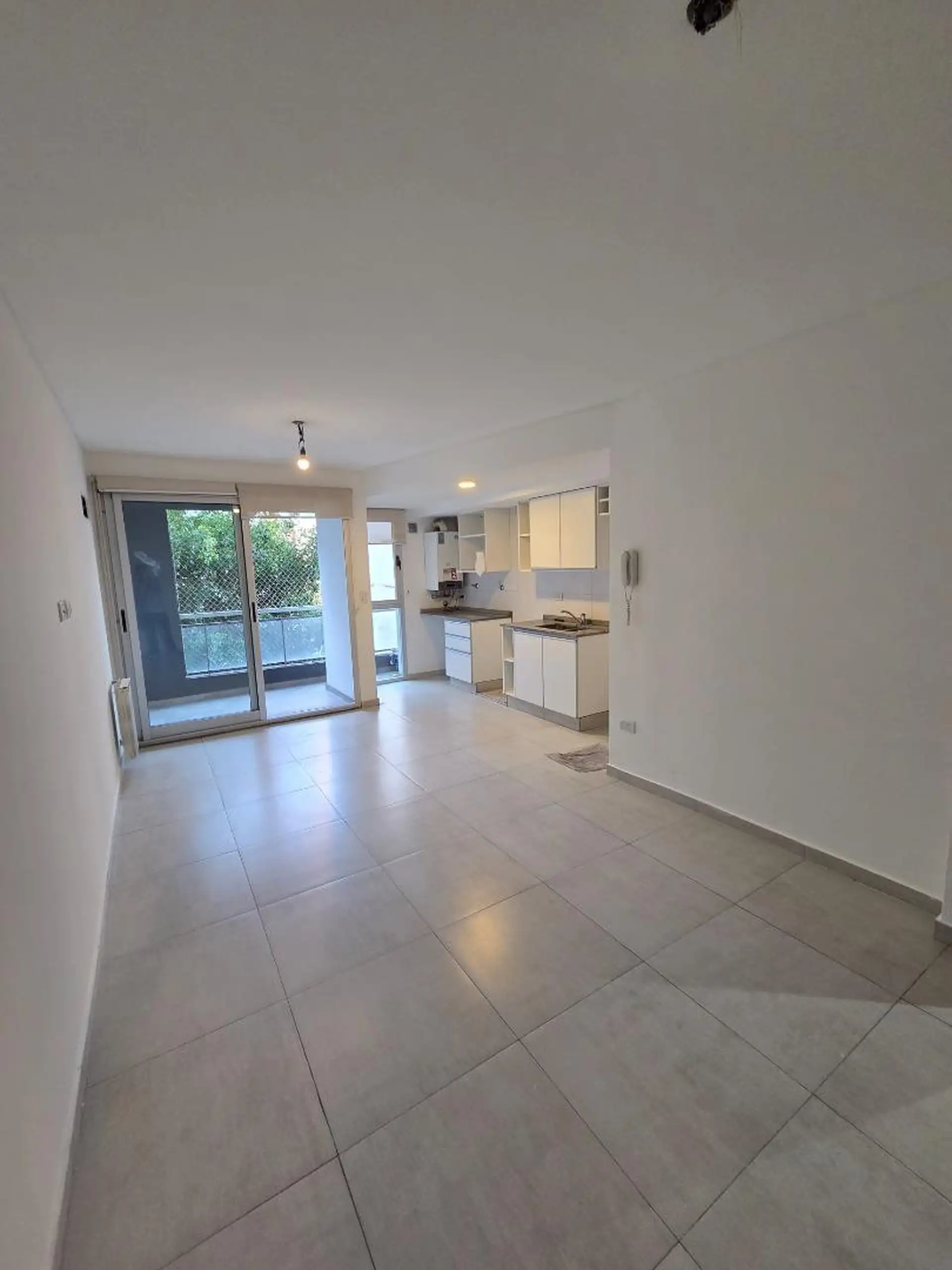 Two-room apartment in Lomas de Zamora with a balcony at the front. It includes a living-dining room with porcelain-tile floors, an integrated kitchen with lower and upper cabinets, and a dual-boiler heating system. The bedroom has floating floors and a built-in wardrobe; the full bathroom has a bathtub and vanity. Rent is advertised at $110,000 plus building fees and services (cloacas and gas), with a two-year contract and quarterly updates based on ICL; income proof and three guarantors are req