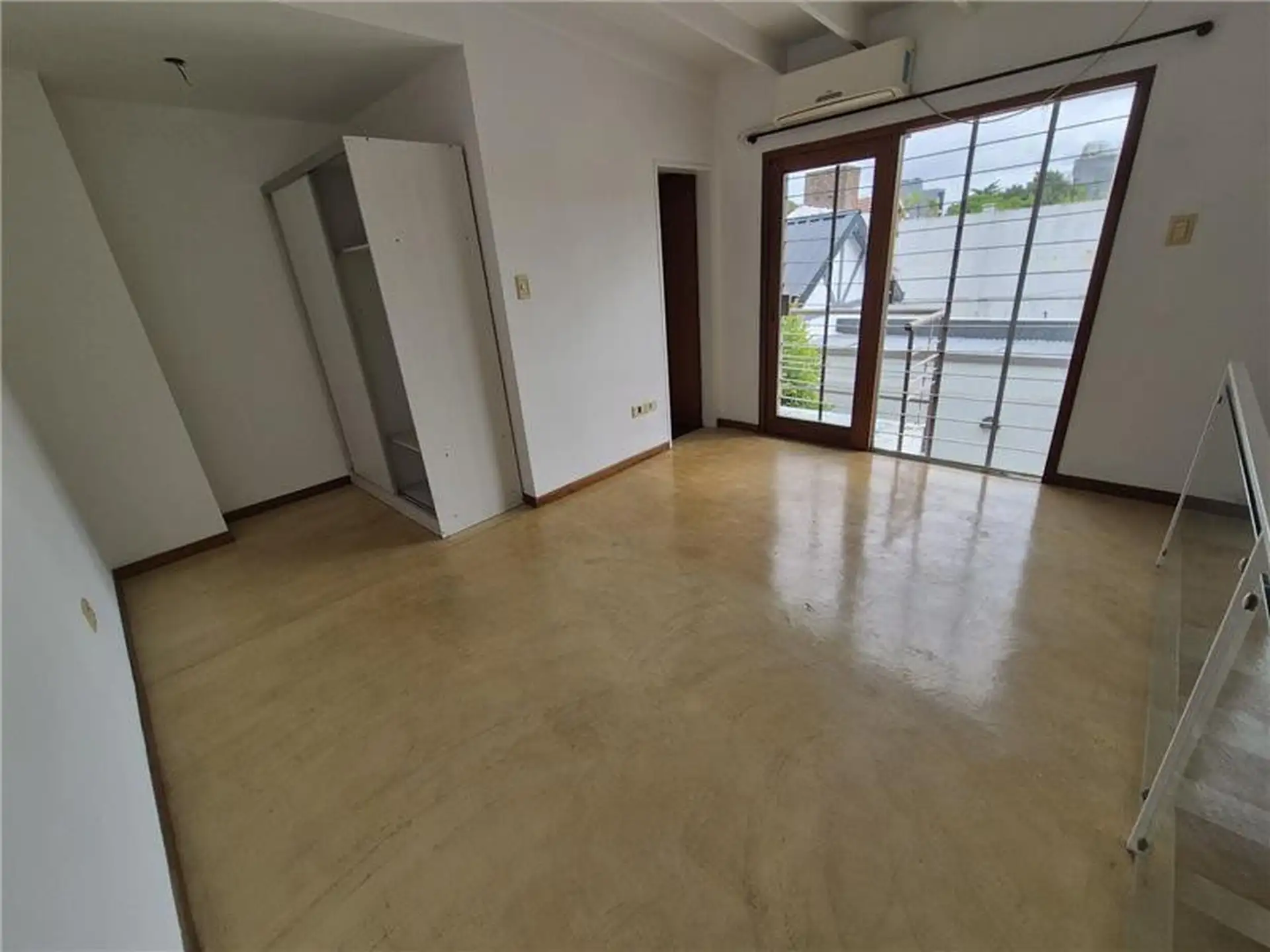 Duplex two-room apartment in Banfield Este, Lomas de Zamora, with no building fees. Total area for private use is 52 m². Ground floor has a living area with ceramic flooring, a kitchen with upper and lower cabinets, and a toilet; the upper level has a bedroom with smooth cement flooring, a wardrobe, cold-heat split air conditioning, a gas heater, a full bathroom, and a small balcony. Heating is via gas radiators (picos de gas). The rental contract is for 2 years with quarterly increases based on
