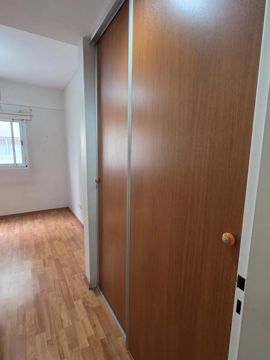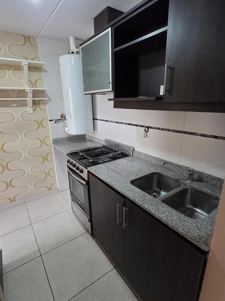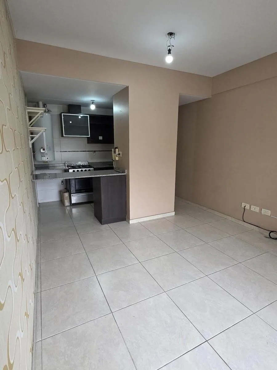 Two-room, studio apartment of approximately 40 m² on the first floor, courtyard-facing (contrafrente), with an open view. The unit has a kitchen with a breakfast bar, gas stove and water heater, plus built-in under-counter cabinets and overhead storage. The living-dining area has ceramic floors and direct access to a private balcony. The bedroom has wood-effect floating floors, a built-in wardrobe and a large exterior window; the bathroom includes a bathtub and a separate vanity area. The apartm