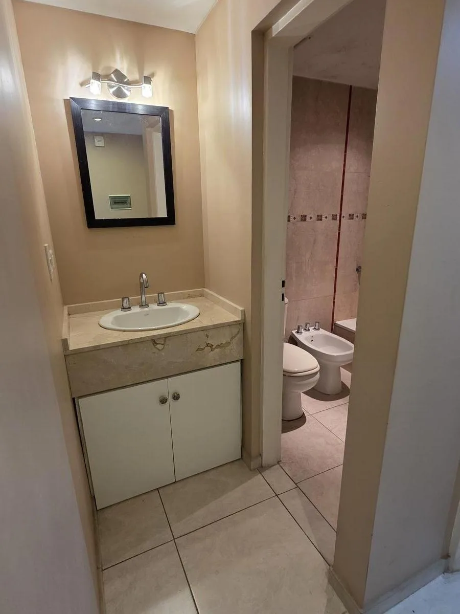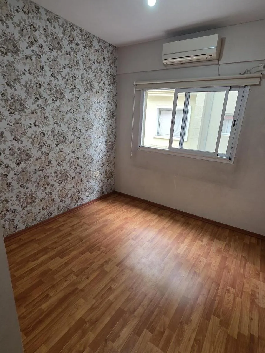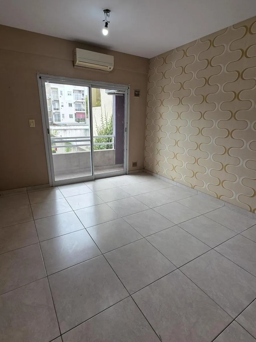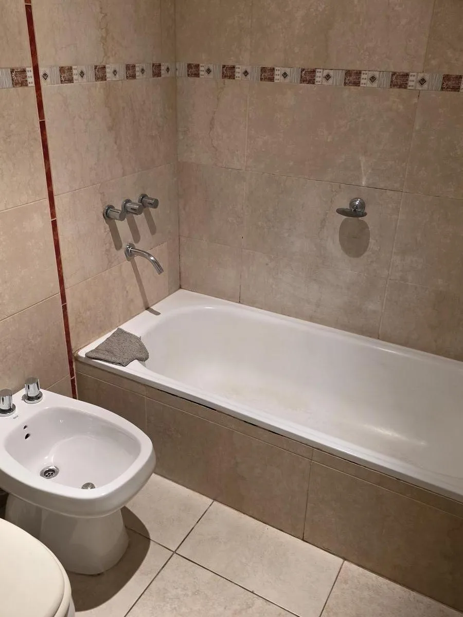 Two-room, studio apartment of approximately 40 m² on the first floor, courtyard-facing (contrafrente), with an open view. The unit has a kitchen with a breakfast bar, gas stove and water heater, plus built-in under-counter cabinets and overhead storage. The living-dining area has ceramic floors and direct access to a private balcony. The bedroom has wood-effect floating floors, a built-in wardrobe and a large exterior window; the bathroom includes a bathtub and a separate vanity area. The apartm