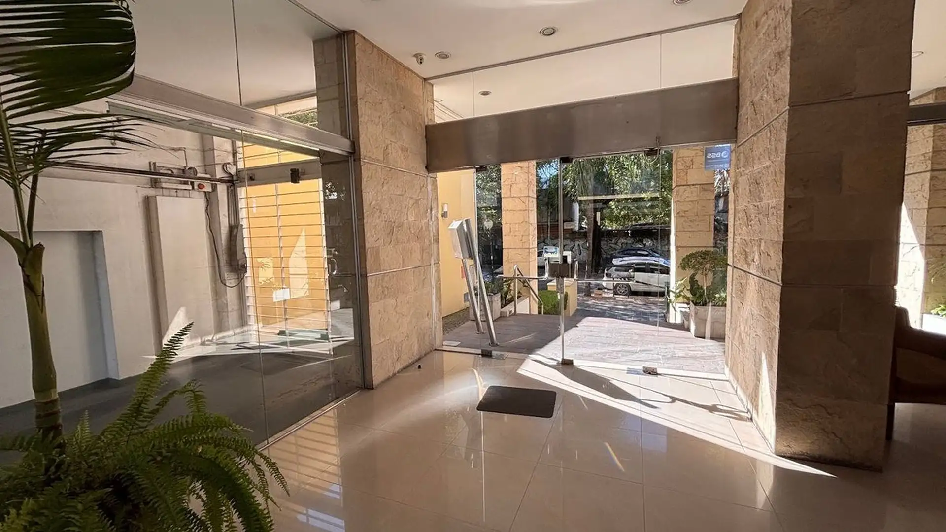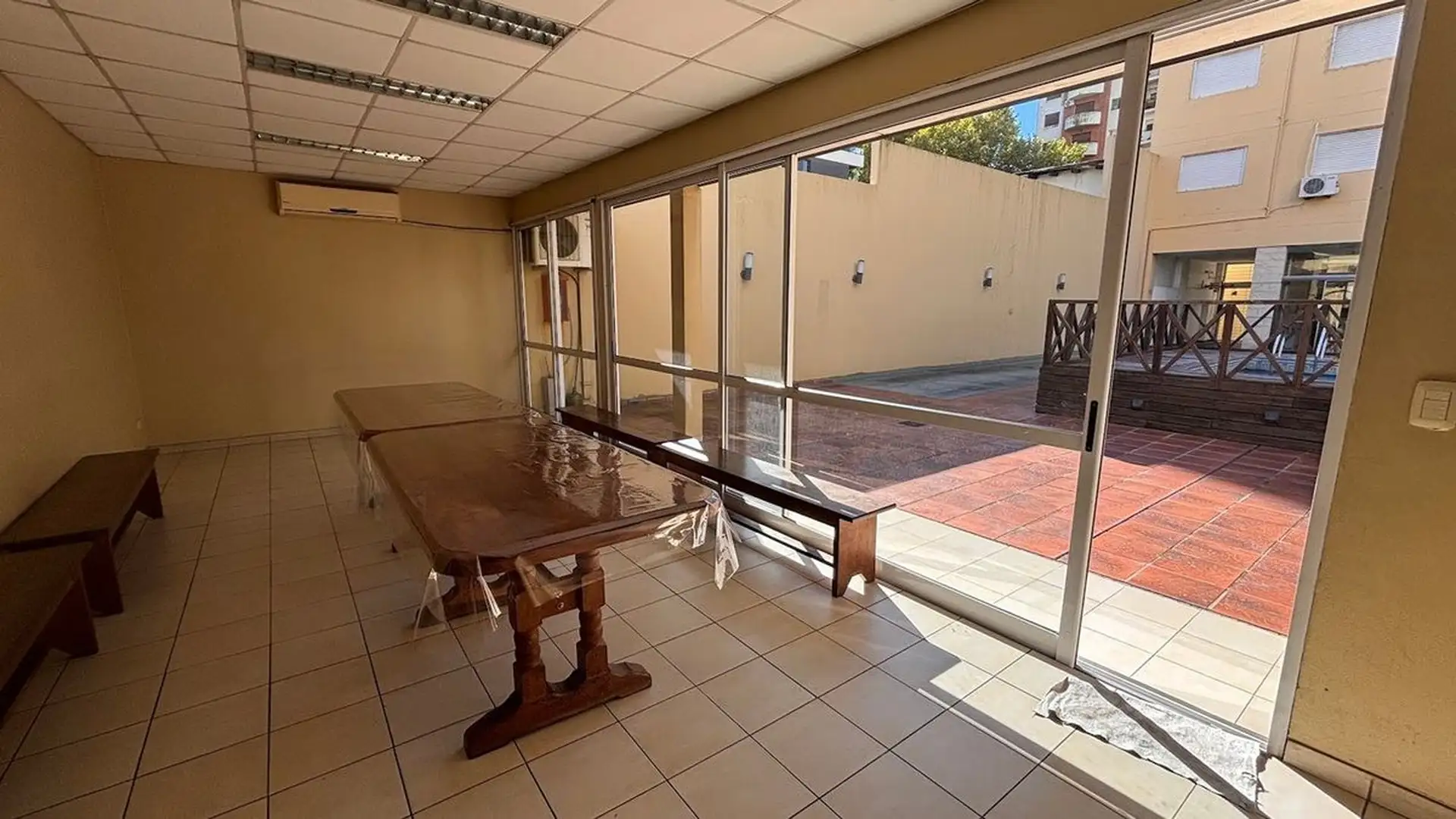 Two-room apartment on the 3rd floor, street-facing with a balcony, on Pellegrini 200, Lomas de Zamora. The unit has a living-dining room with double-glazed window and access to the balcony, a separate kitchen with storage space, one bedroom with window and built-in closet, and a full bathroom with tub. Building facilities include a doorman, one elevator, pool, communal room (SUM), grill, and shared bathrooms and tableware; pets are not accepted.