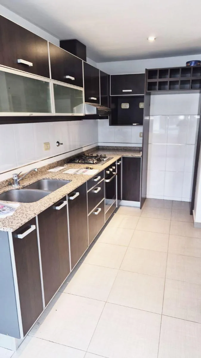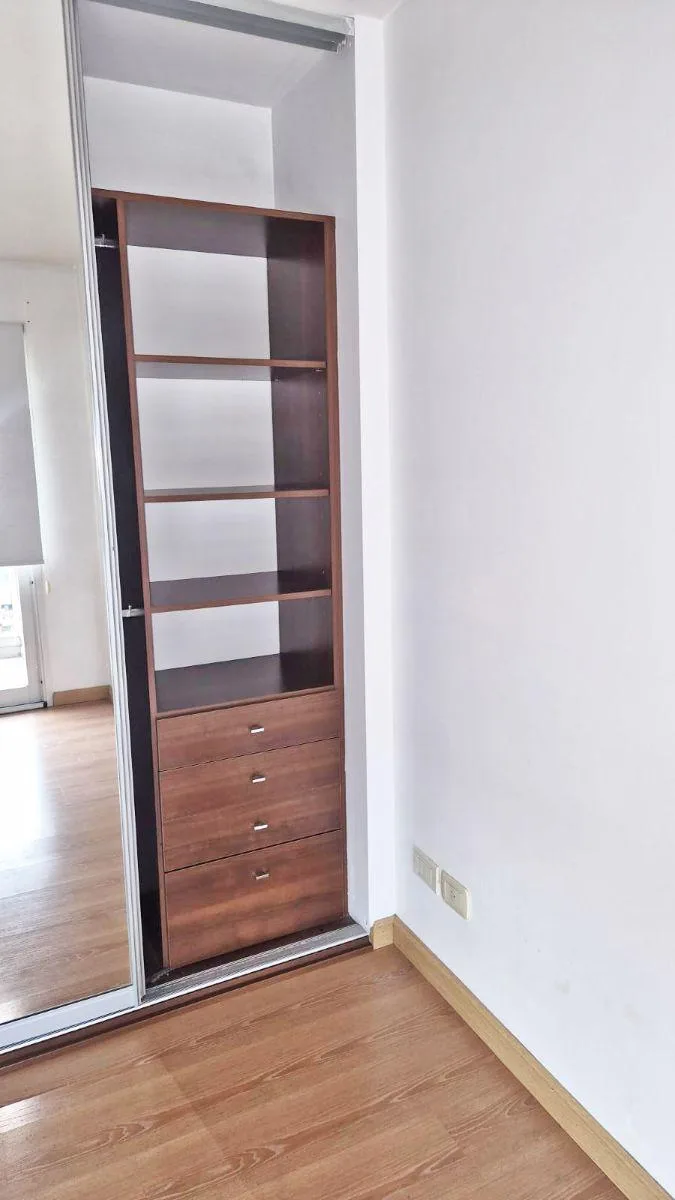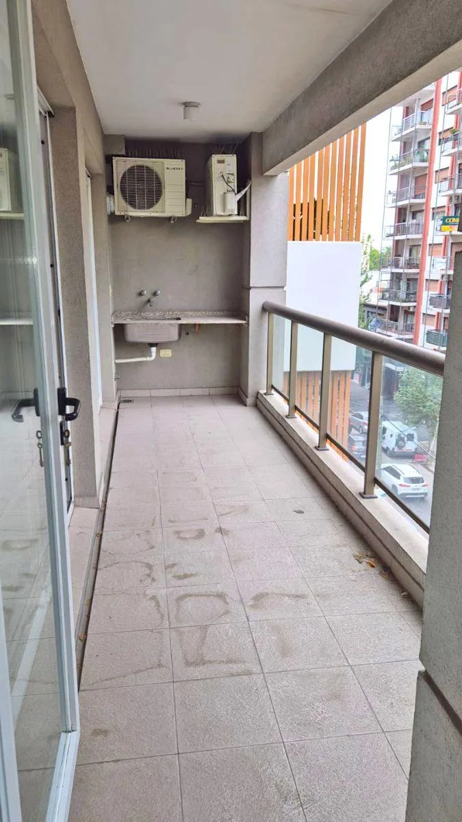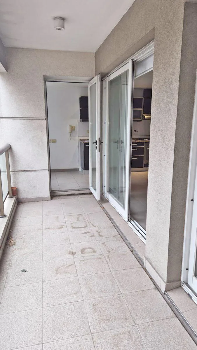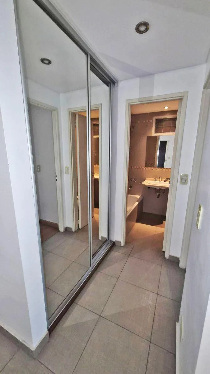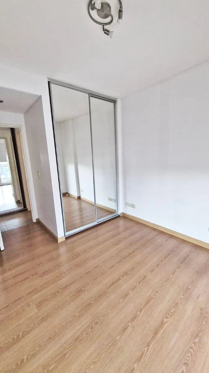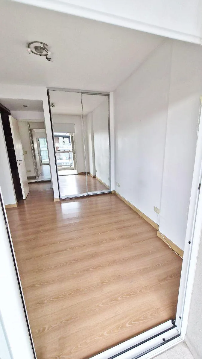 Street-facing two-room apartment in Lomas de Zamora, metres from Avda H Yrigoyen. The living room measures 7x3 m² and has a long balcony. The layout includes a kitchen with under- and upper-cabinet storage, a full bathroom, a distributor hall with a mirrored closet, a bedroom with a large mirrored-front closet and access to the balcony. The building has covered parking, a communal room (SUM) and 24-hour security.