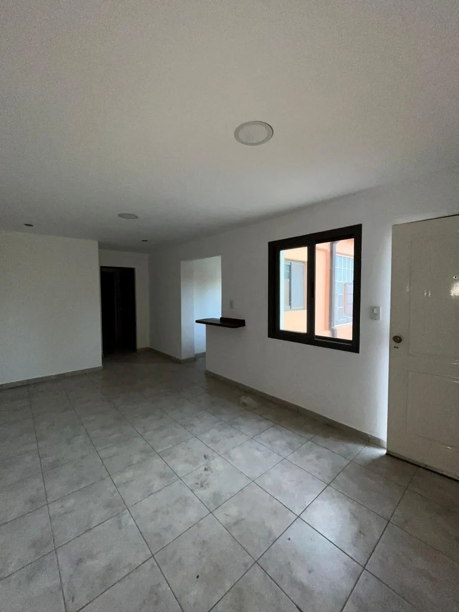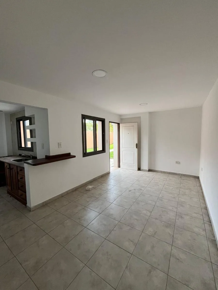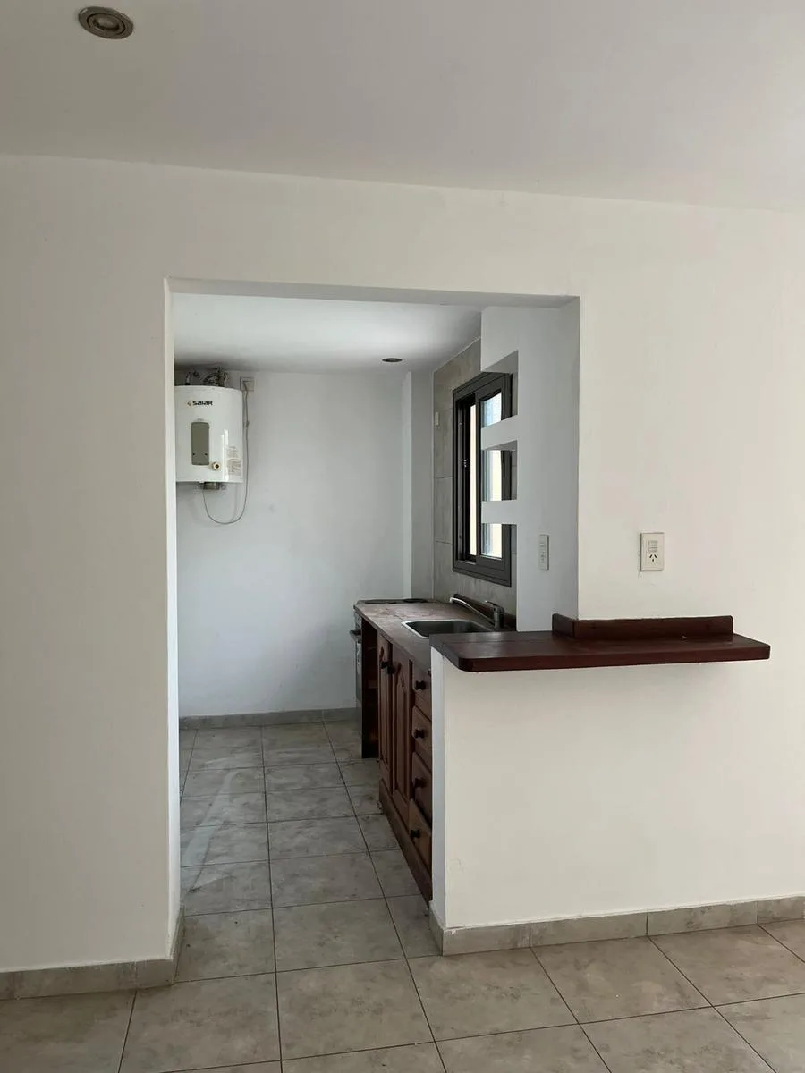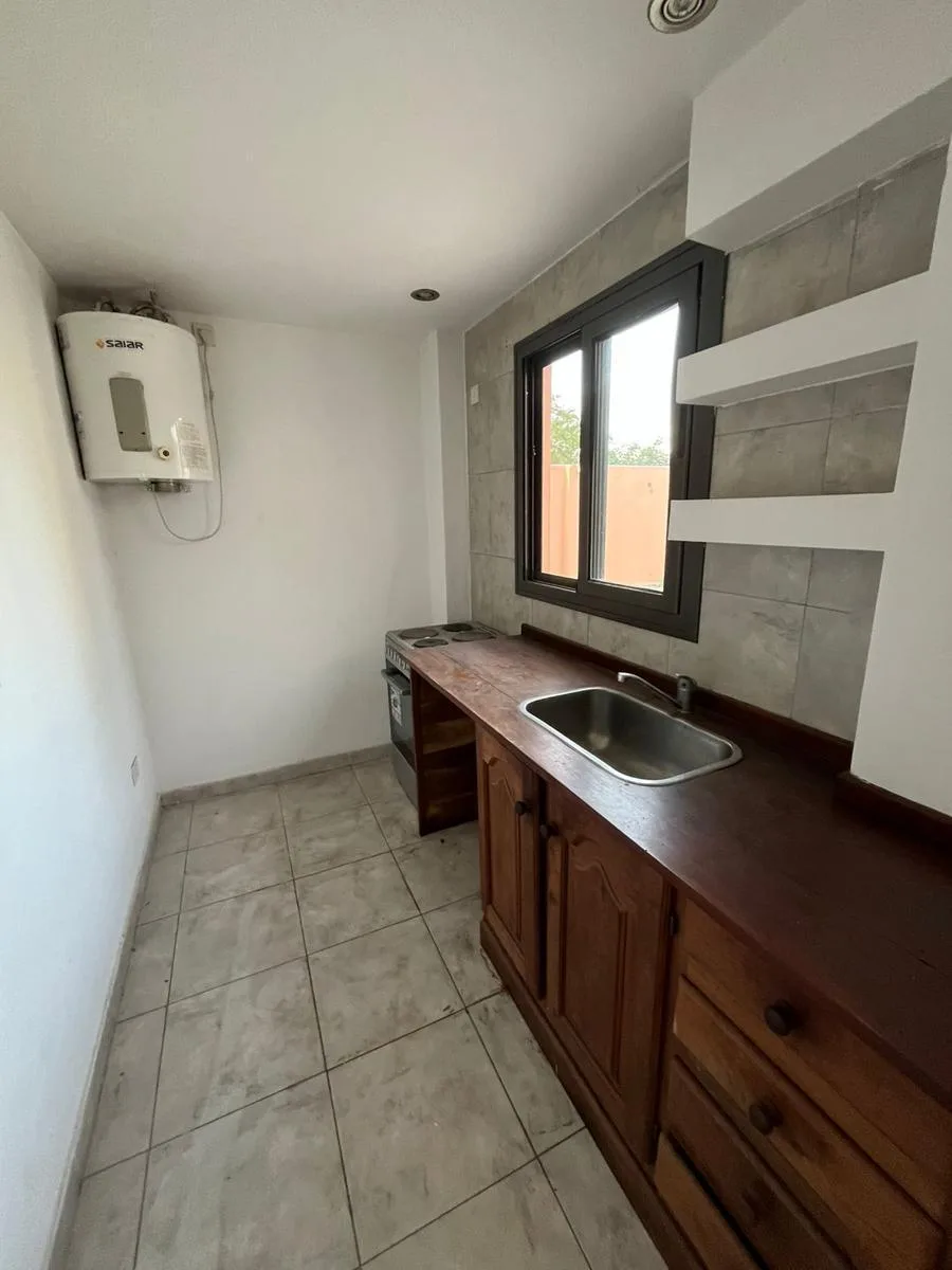 Two-room apartment in a residential area of Luján, on Calle Sarmiento, within a three-apartment complex. It has a bedroom with built-in wardrobe, kitchen, living-dining room, full bathroom, and a patio with a shared grill. Electric service only, no natural gas; building fees are about $30,000. Rental contract for 24 months with a quarterly adjustment based on ICL.