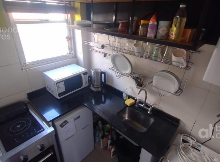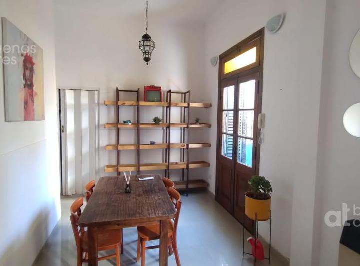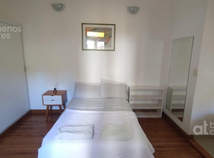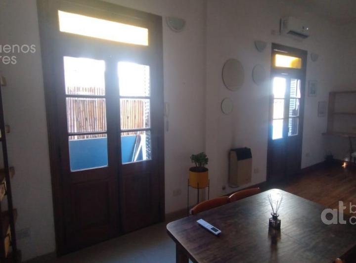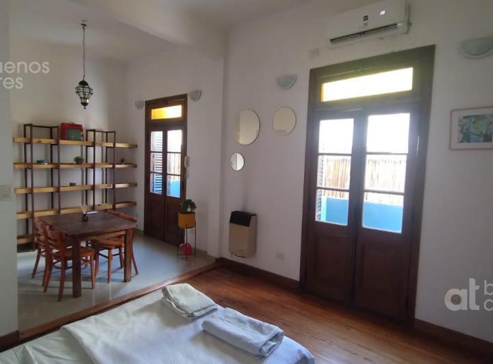 One-bedroom apartment available from 6/4/2026 on the ground or upper unit with private entrance, accessed via stairs in a historic townhouse in San Telmo. Double-height ceilings, two balconies on the courtyard-facing side, and air conditioning. Separate full kitchen with a washing machine; double bed and a built-in wardrobe; fully refurbished bathroom. The published rent is plus services paid by the tenant. Move-in requirements: 1 month in advance, 1 month deposit, and administrative fees.