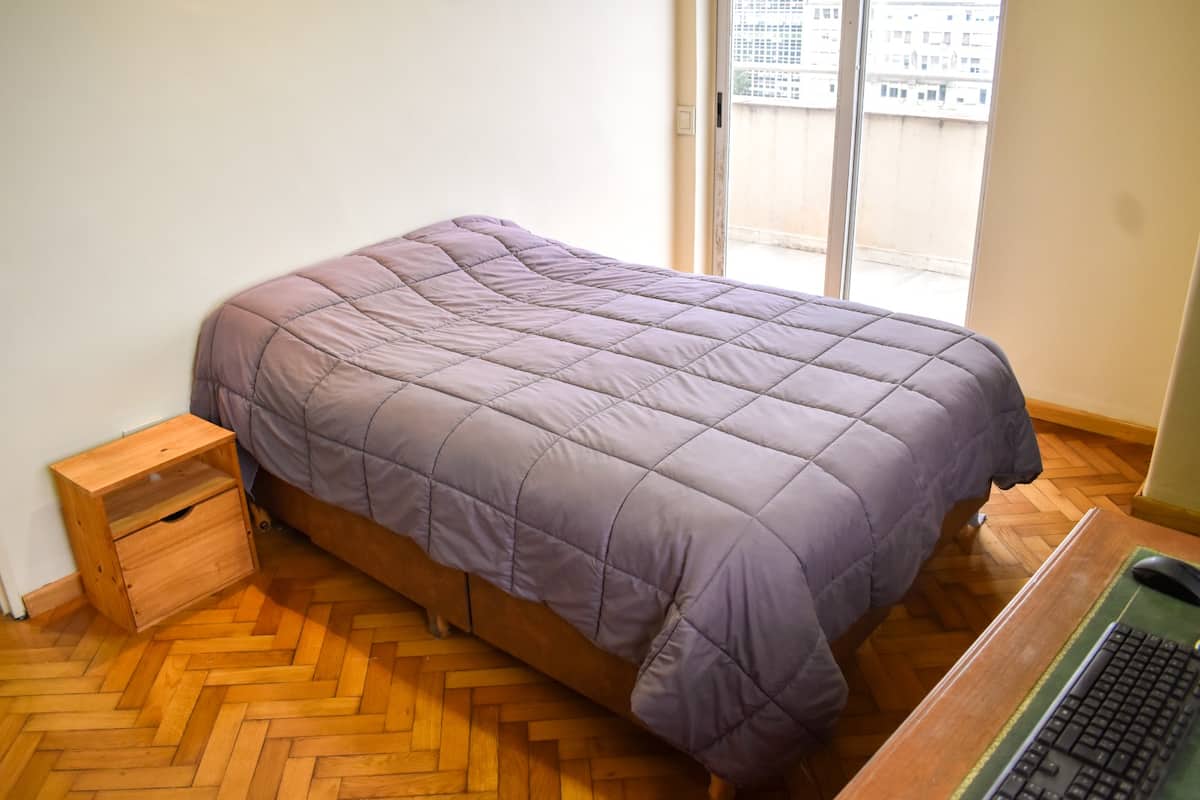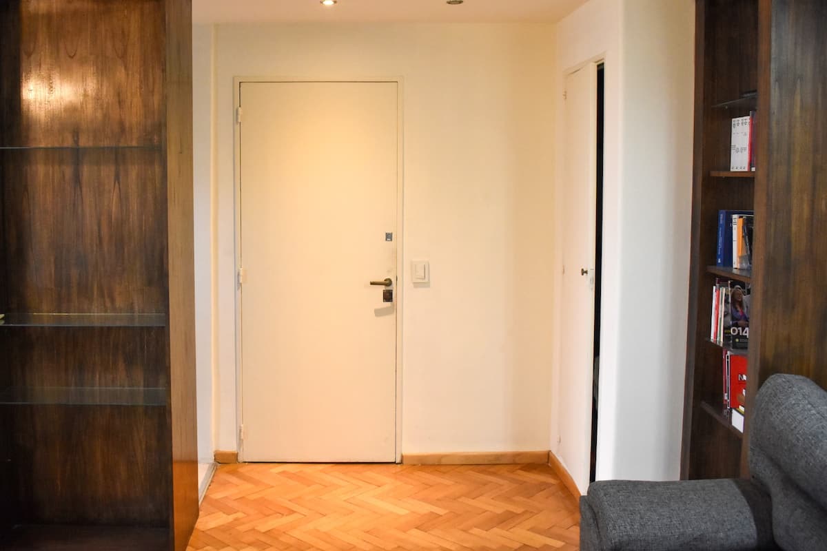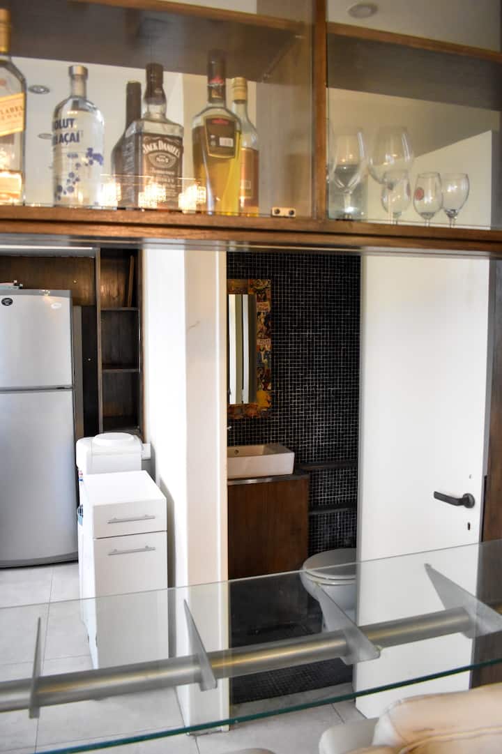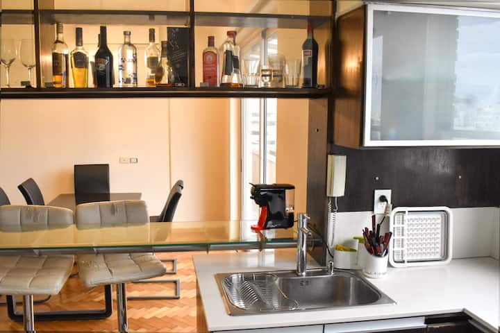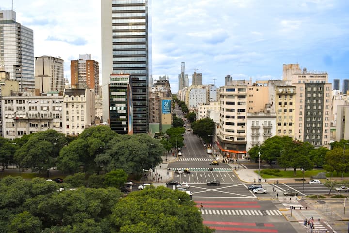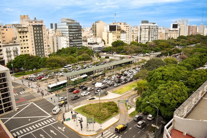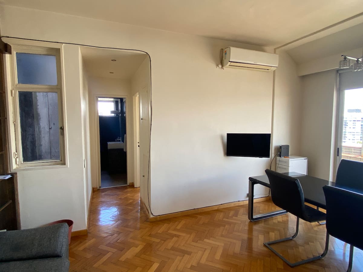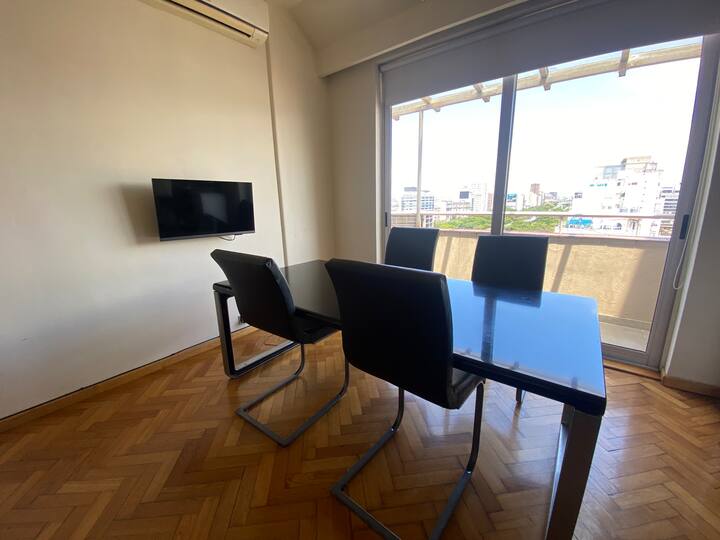 Apartment on Av 9 de Julio and Belgrano in Monserrat with 2 rooms (2 ambientes) and 1 bedroom. It has an integrated kitchen, 2 air conditioners, a washing machine, an electric water dispenser for hot and cold water, and 2 bathrooms (one full and one with a shower). The unit includes 2 balconies and is described as bright, with a view. The entire apartment is available for use.