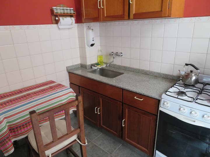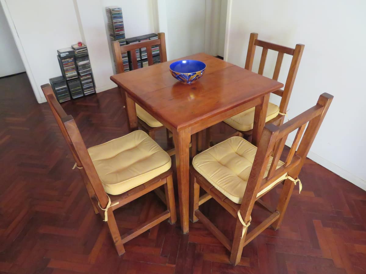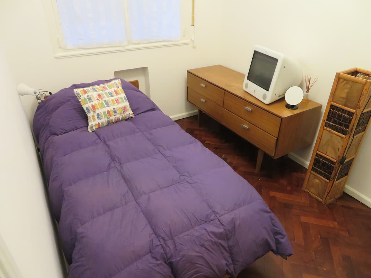 A private single room in a shared apartment in San Telmo. The room includes a single bed, table/desk, and wardrobe, with linens and towels. The living room has air conditioning and heating, and the apartment has good WiFi internet. The unit is six blocks from Plaza de Mayo.