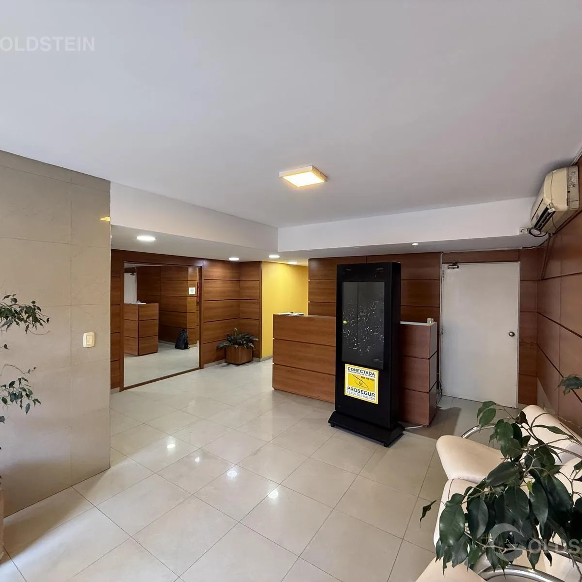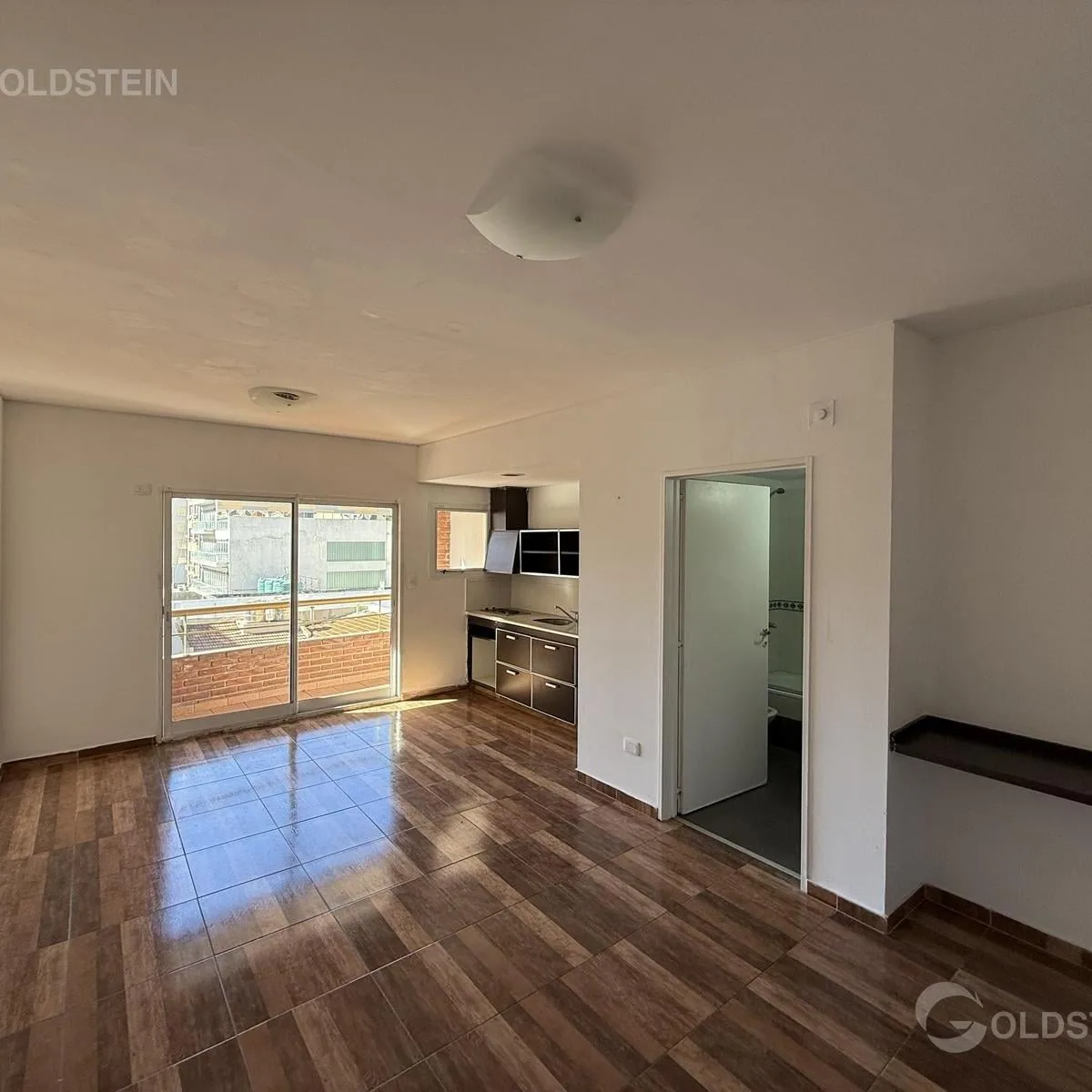 Two-room front-facing apartment in Monserrat with a balcony. It has split air conditioning in the bedroom, an electric countertop stove, and a connection for a washing machine on the balcony. Building fees include security totem, Cablevisión cable, AySA, and central hot water. The electric towel rail is not included.