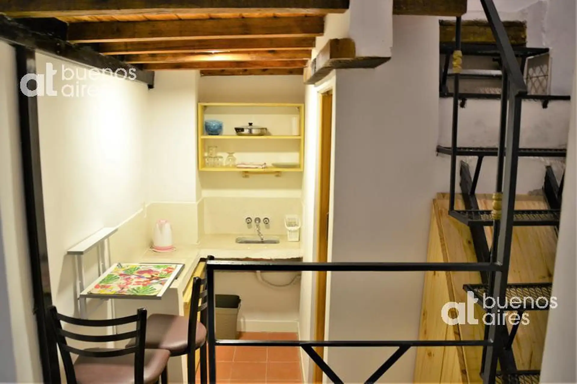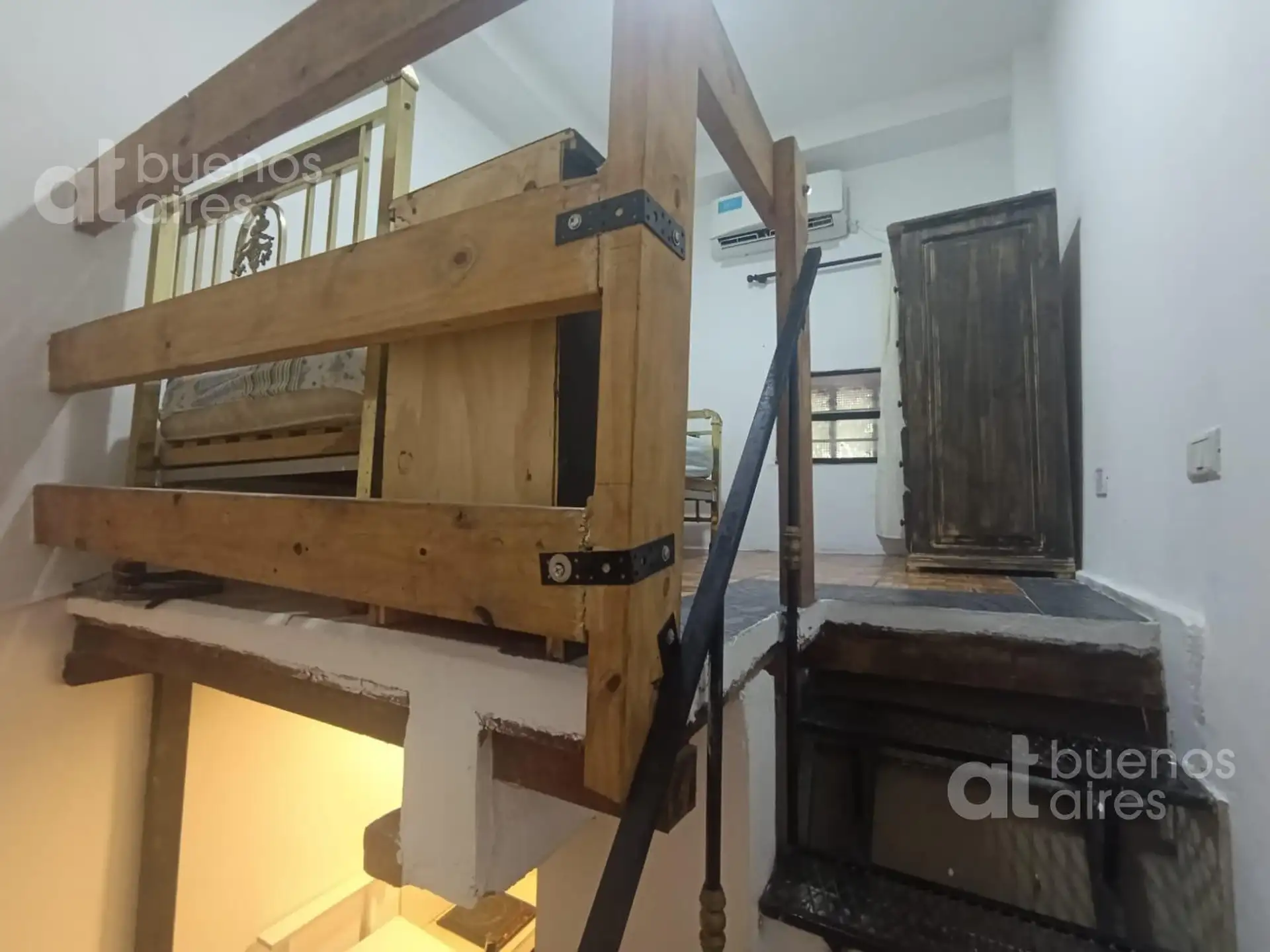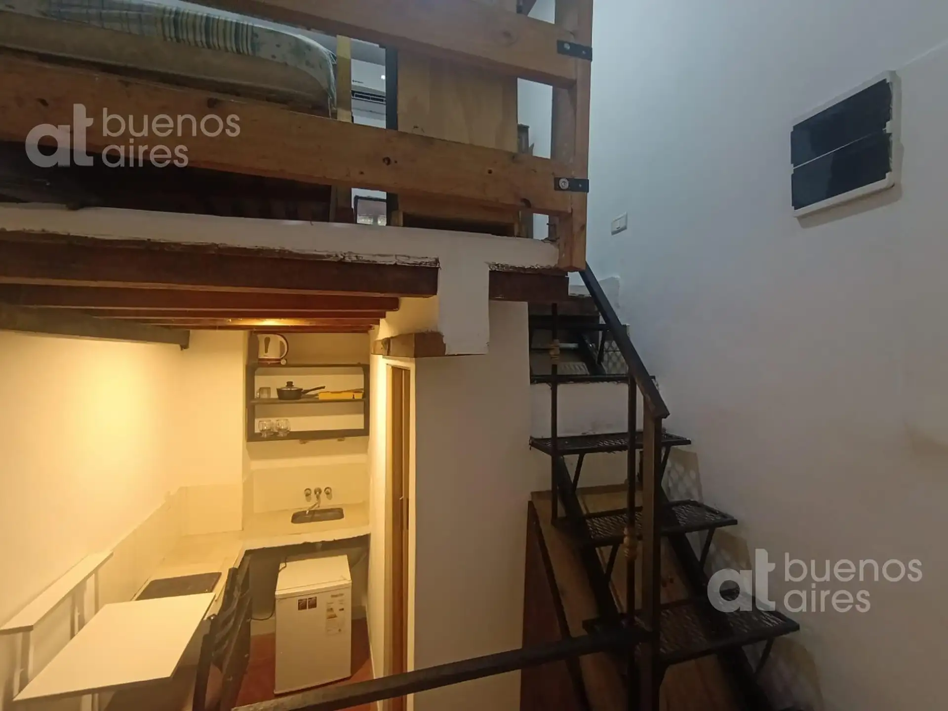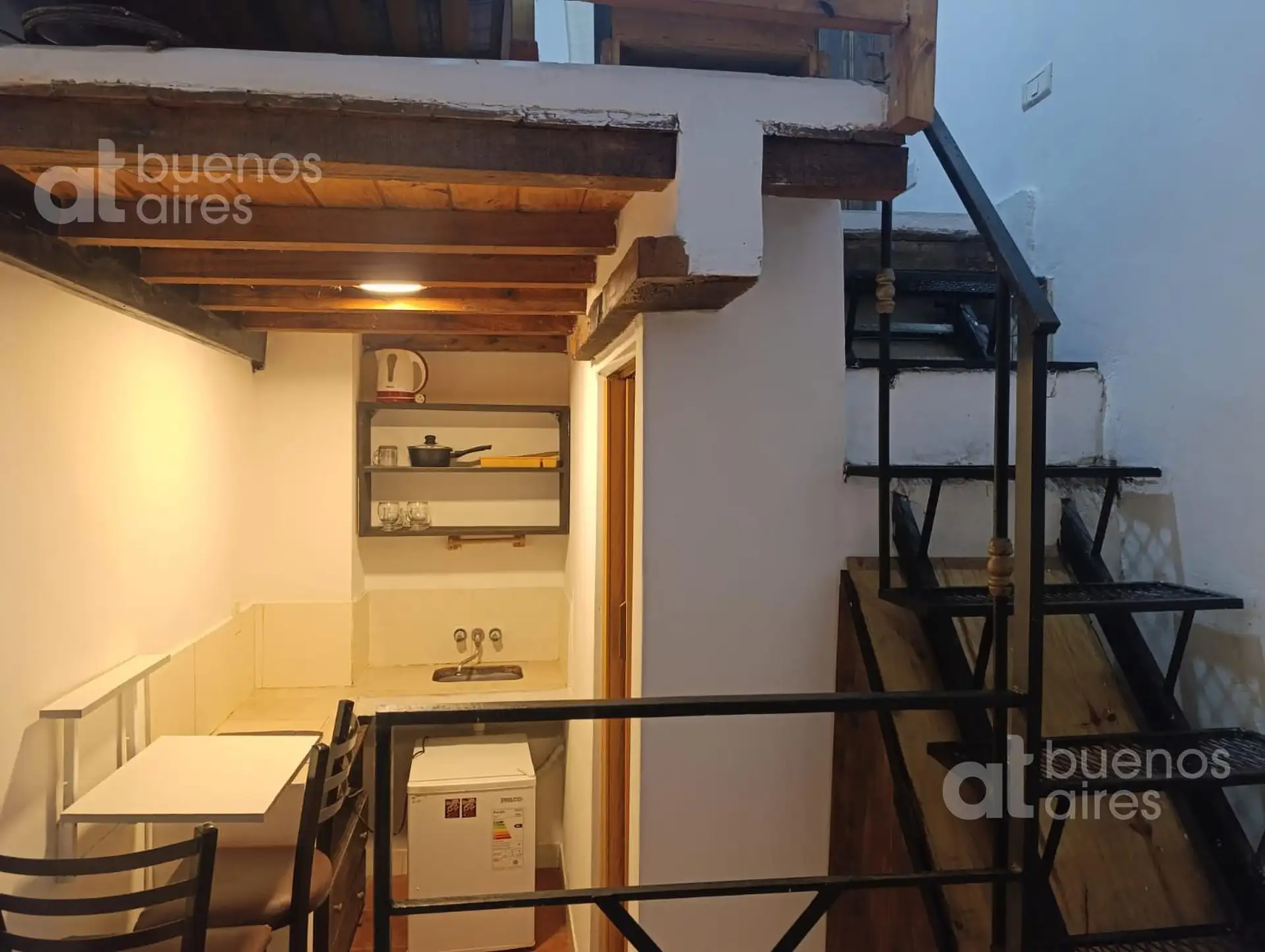 One-bedroom apartment in San Telmo, refurbished and ready from 2026. The unit accommodates 1 person and includes a shared entry hall, a small kitchen with a fridge and dining area, and a bedroom accessed via a narrow mezzanine stair with a single bed. It has hot and cold air conditioning and is entirely electric. There is a shared laundry area with a washing machine and a shared terrace. The rental price is all-inclusive, except for internet which is paid by the tenant.