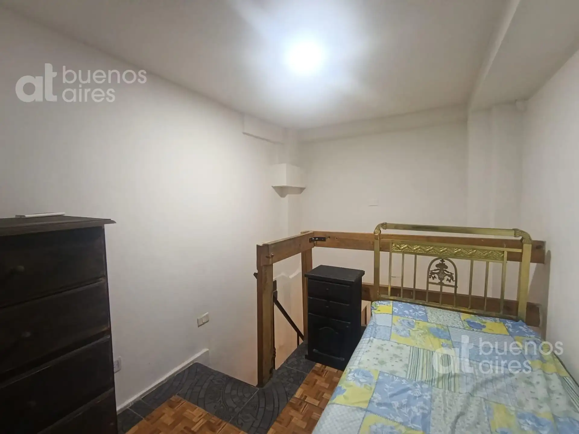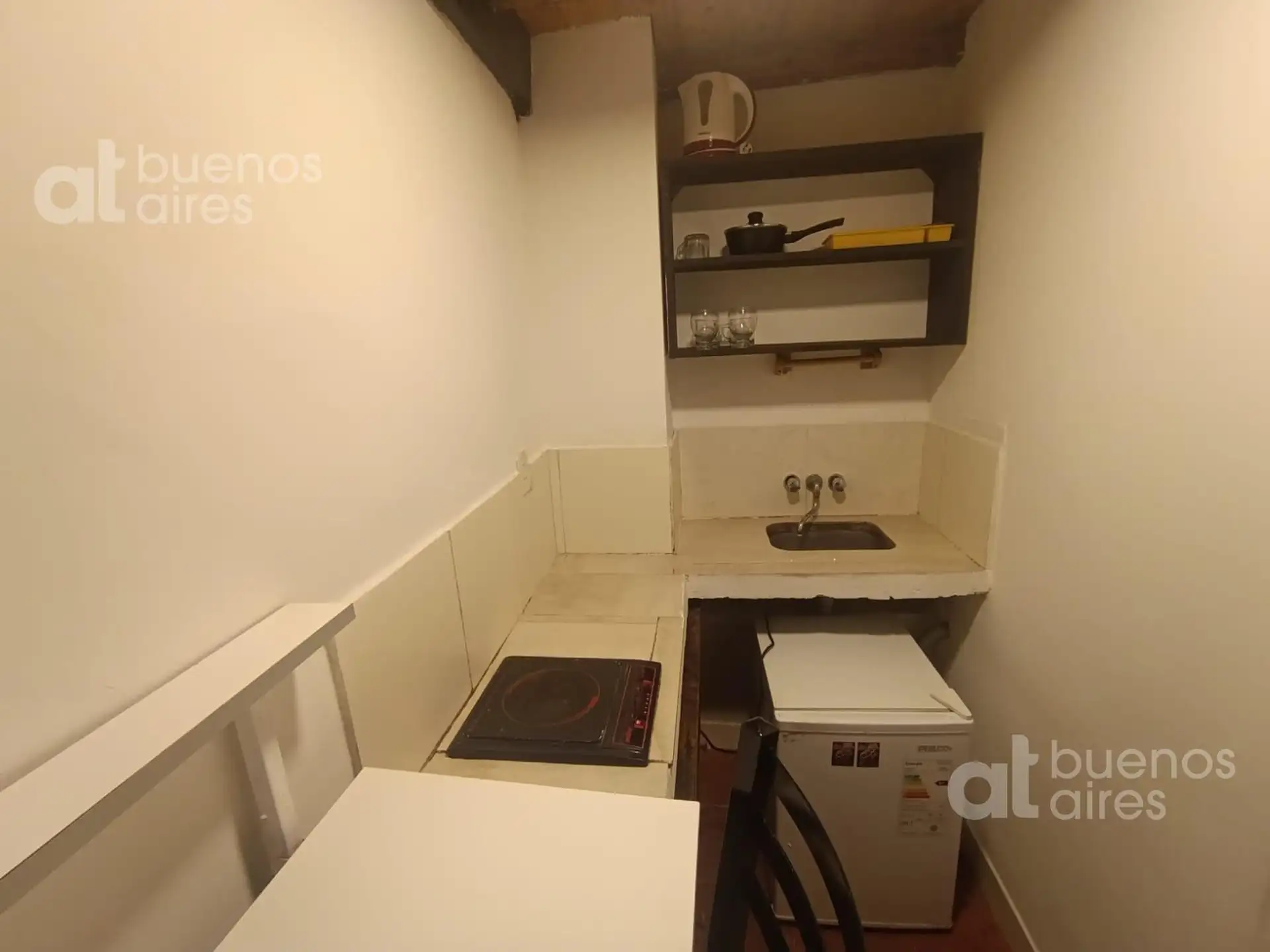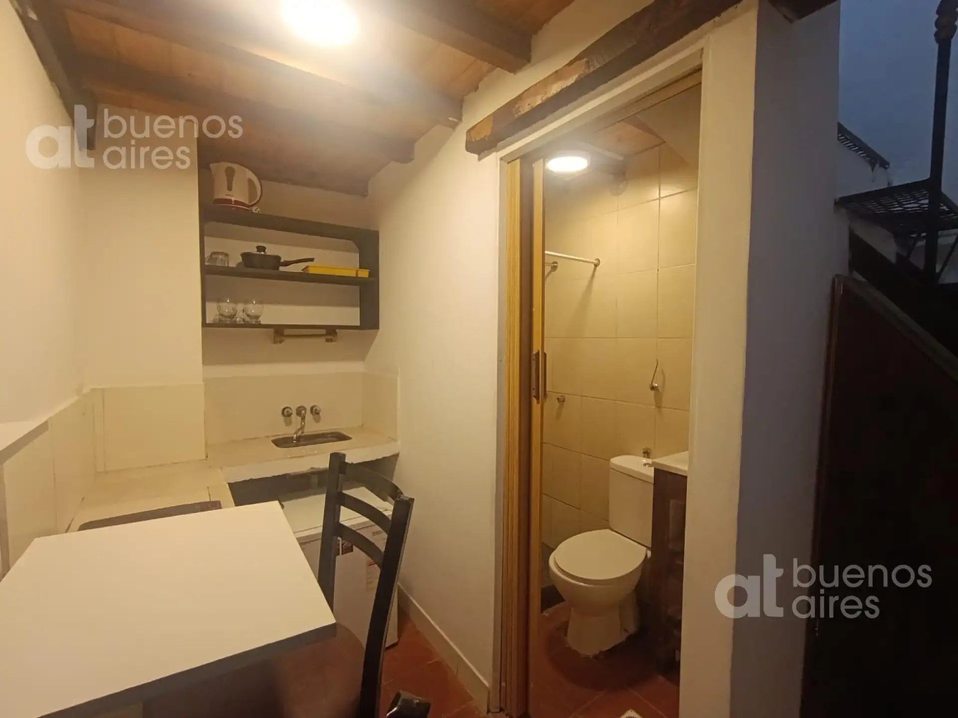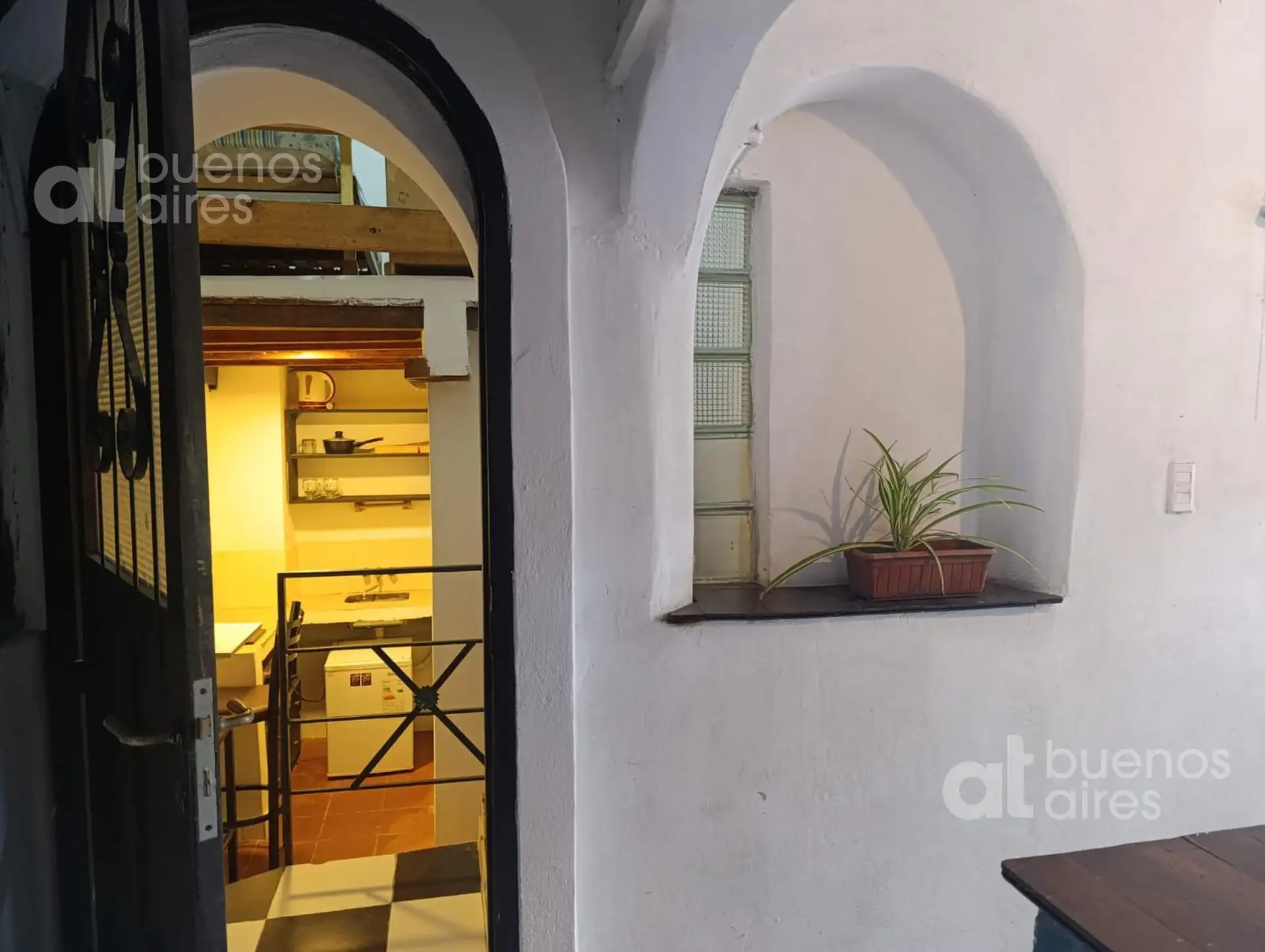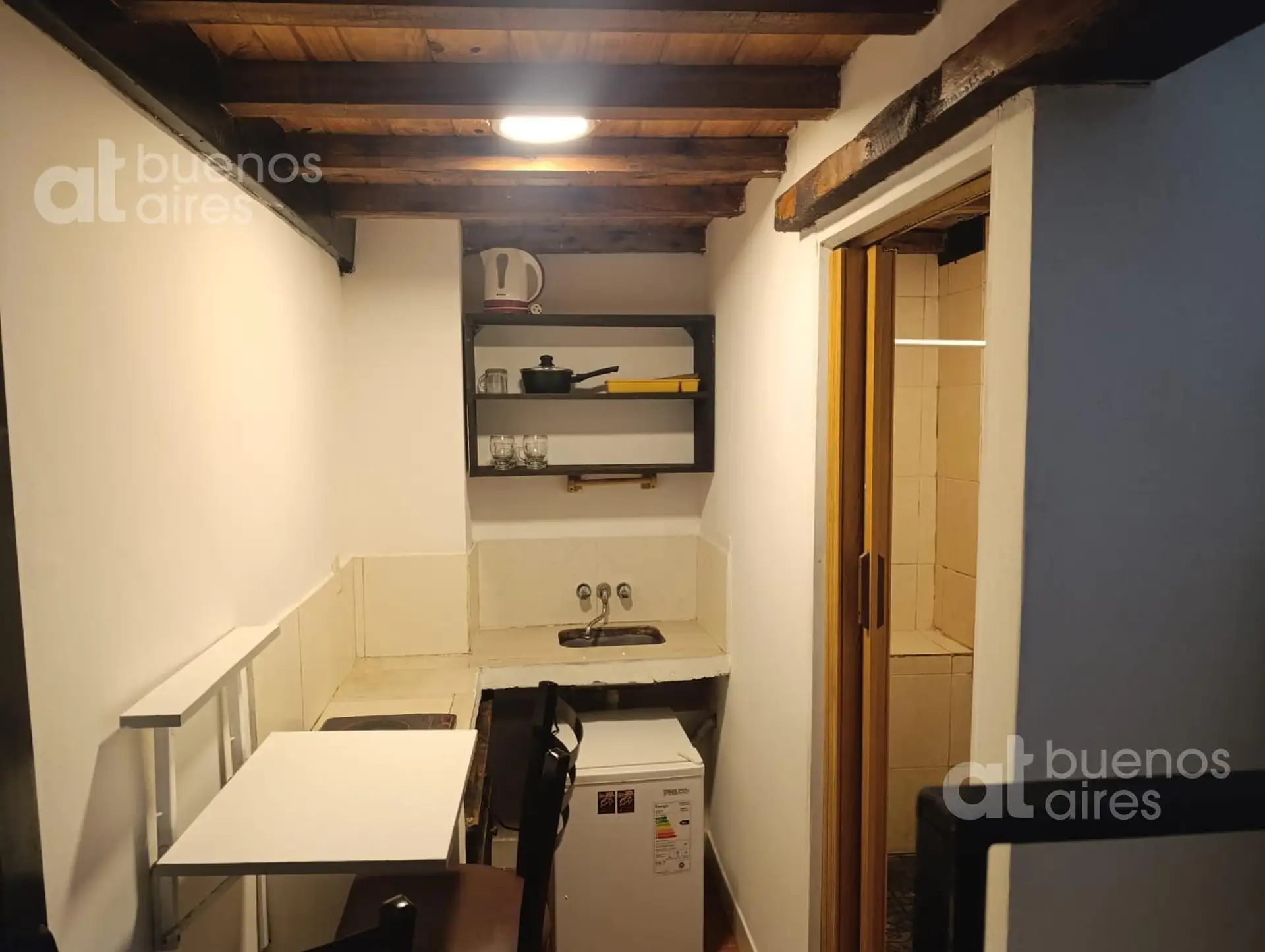 One-bedroom apartment in San Telmo, refurbished and ready from 2026. The unit accommodates 1 person and includes a shared entry hall, a small kitchen with a fridge and dining area, and a bedroom accessed via a narrow mezzanine stair with a single bed. It has hot and cold air conditioning and is entirely electric. There is a shared laundry area with a washing machine and a shared terrace. The rental price is all-inclusive, except for internet which is paid by the tenant.