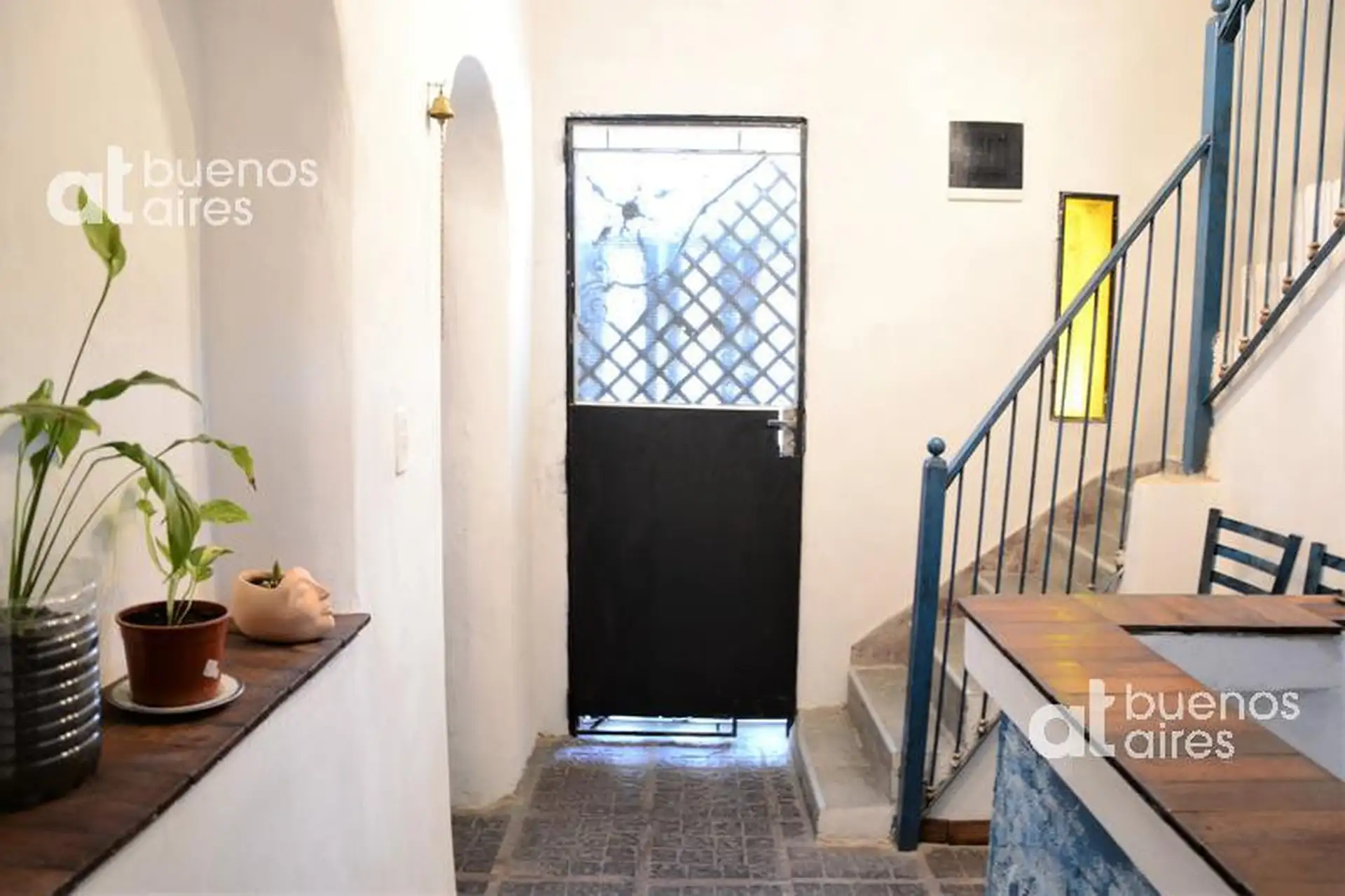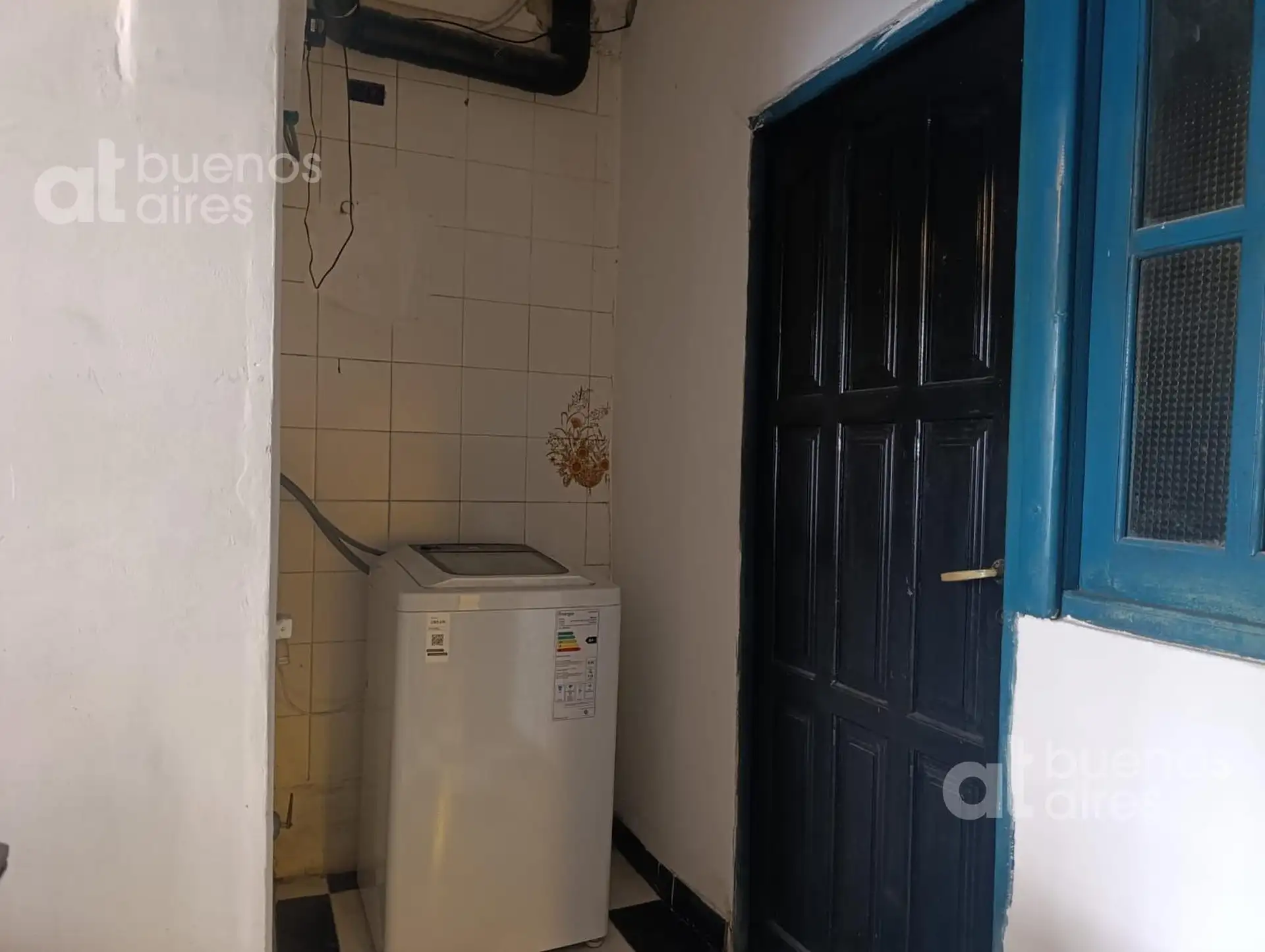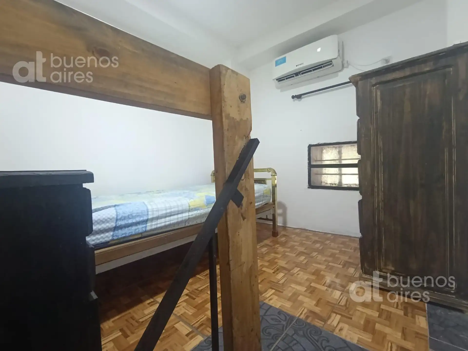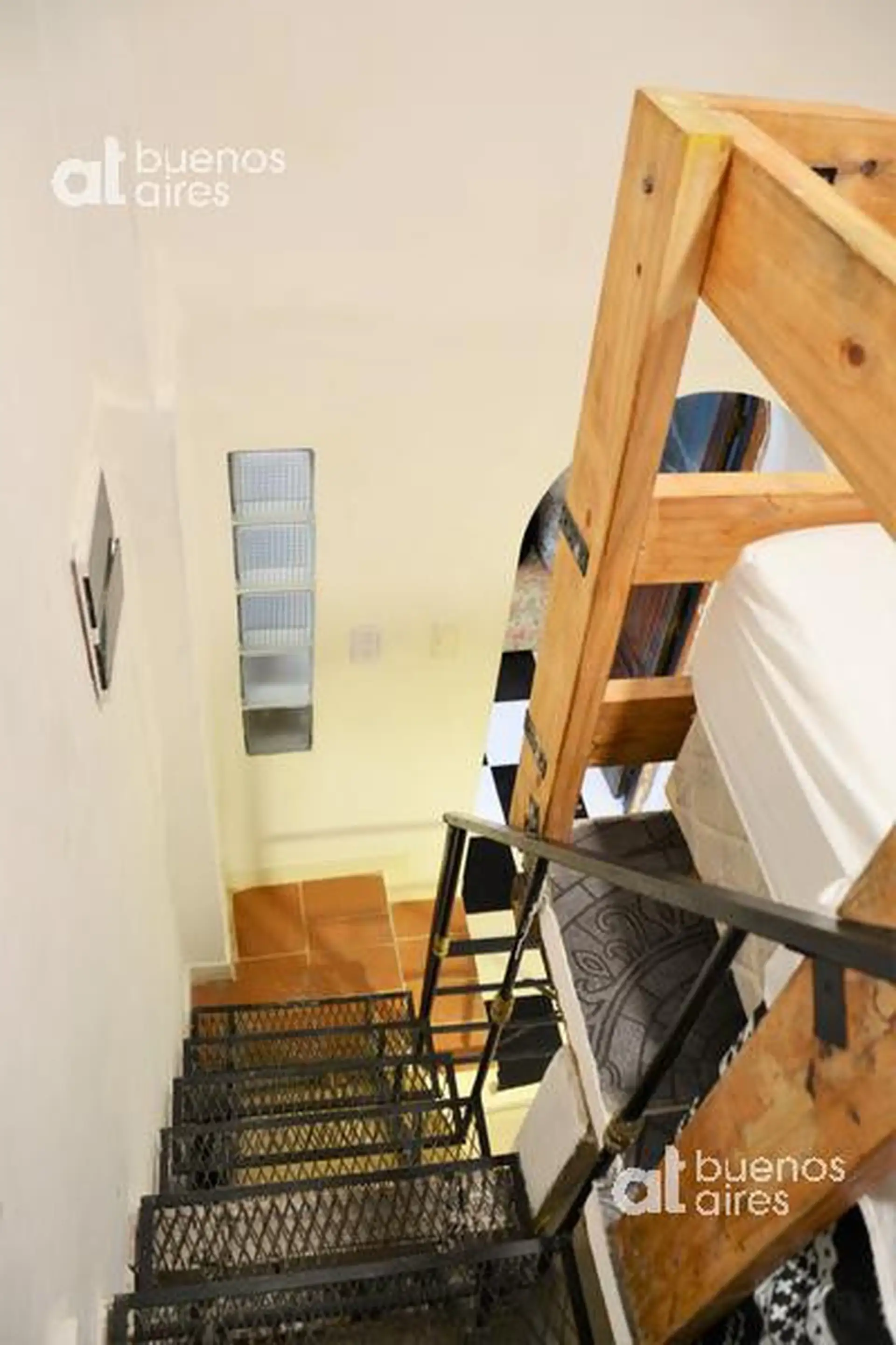 One-bedroom apartment in San Telmo, refurbished and ready from 2026. The unit accommodates 1 person and includes a shared entry hall, a small kitchen with a fridge and dining area, and a bedroom accessed via a narrow mezzanine stair with a single bed. It has hot and cold air conditioning and is entirely electric. There is a shared laundry area with a washing machine and a shared terrace. The rental price is all-inclusive, except for internet which is paid by the tenant.