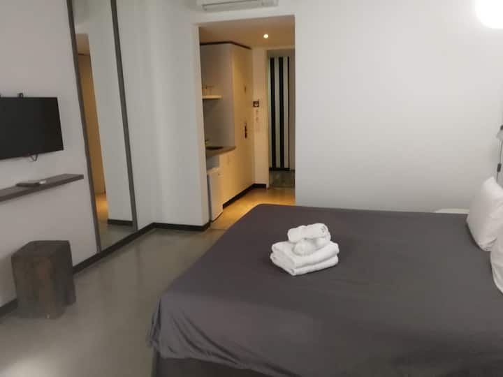 Building with 30 studio apartments for up to 2 people. Studio units are approximately 30 m² and include a full bathroom and a fully equipped integrated kitchen. Services include Wi-Fi, cable TV, and mandatory cleaning every 7 days; guests also complete an online check-in form. The building street is under construction, with possible noise from 08:00 to 18:00.