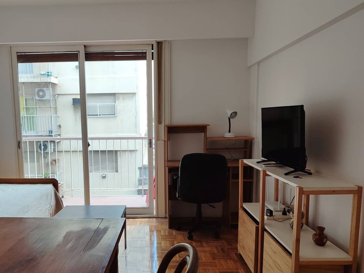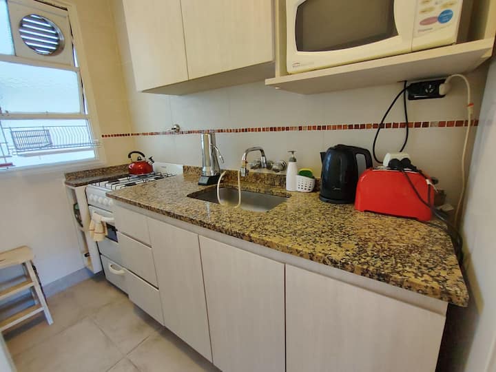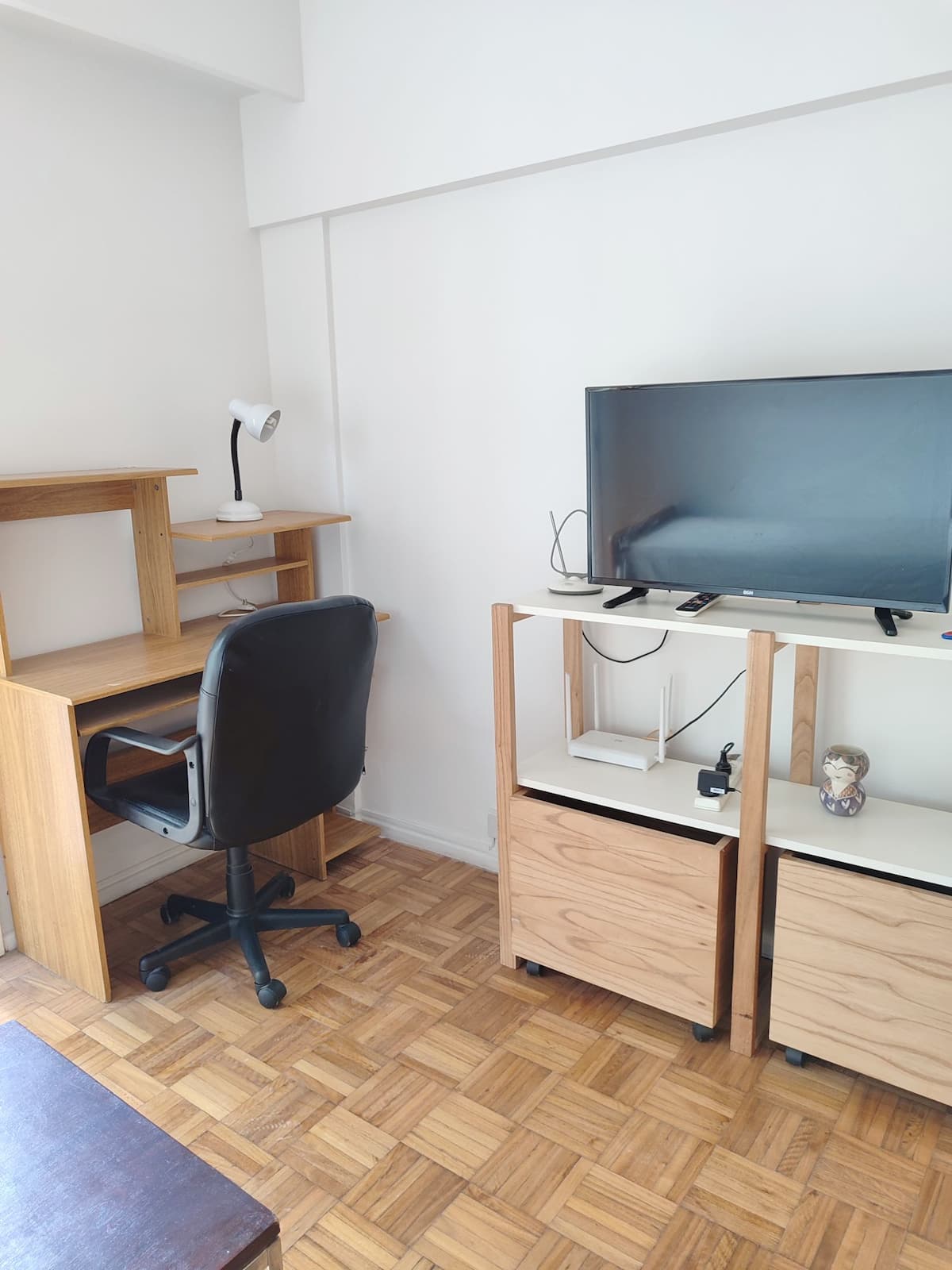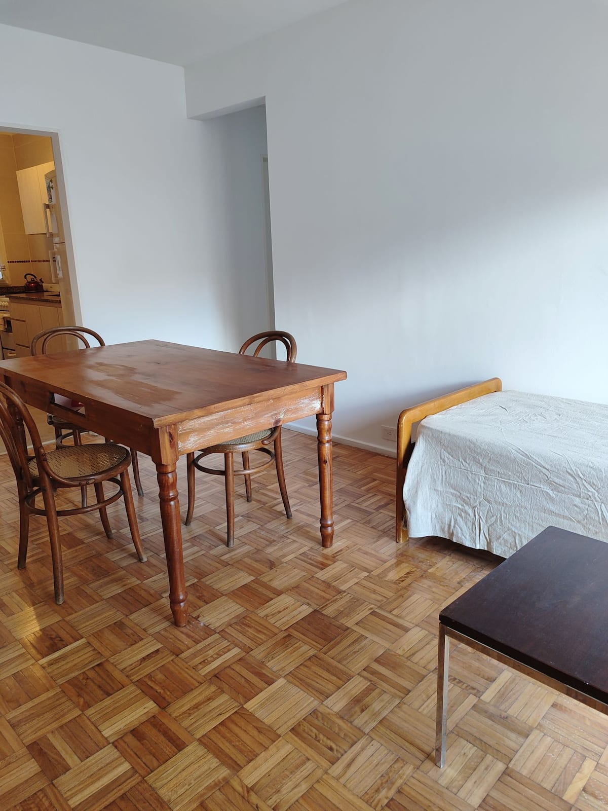 One-bedroom apartment in Monserrat with a full kitchen and a living room. The living room includes a single bed and a work area. Guests can use the entire apartment except one room that remains closed; check-in is from 2:00 pm to 7:00 pm, with an extra USD 20 for arrivals outside those hours subject to availability.