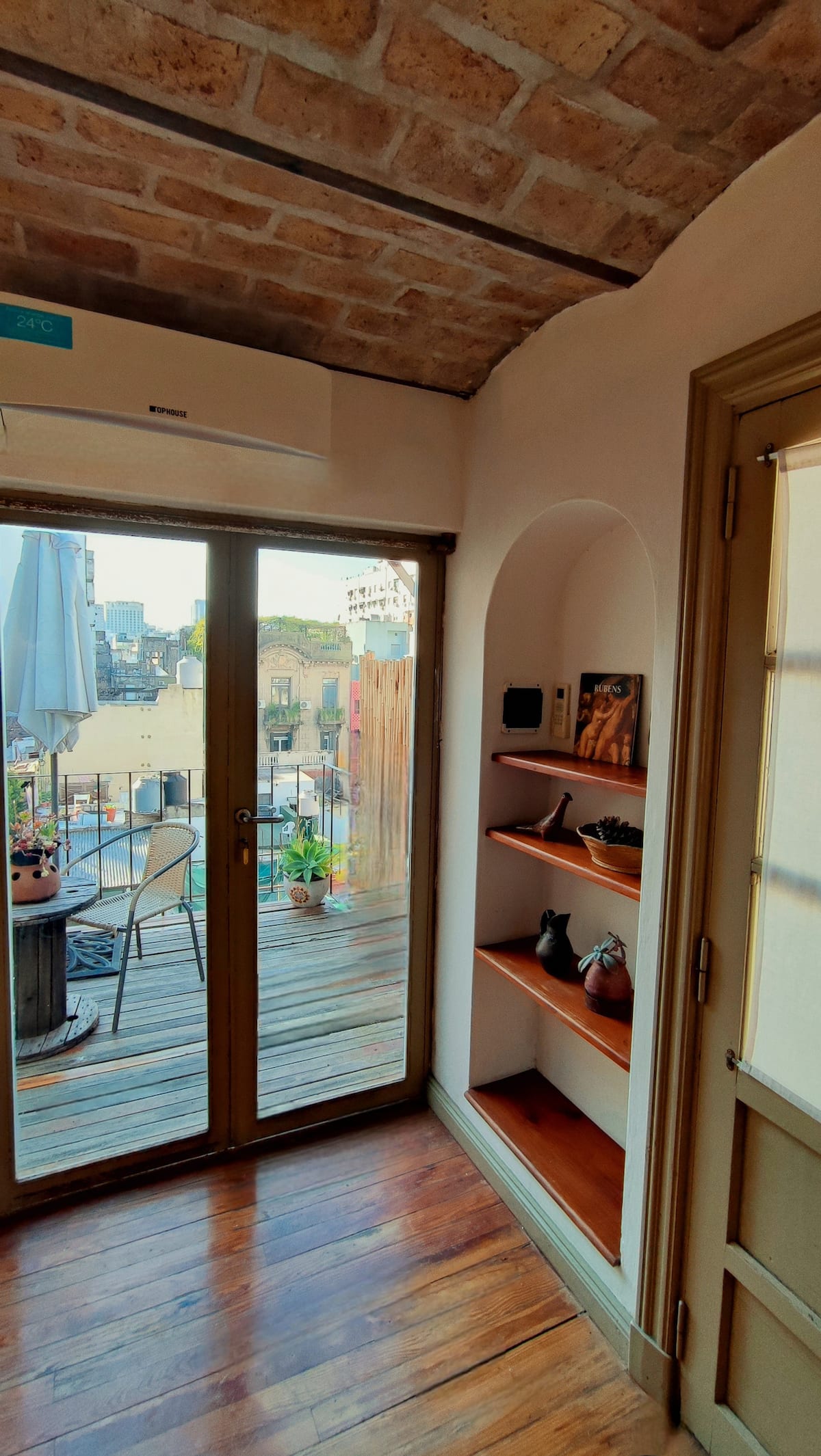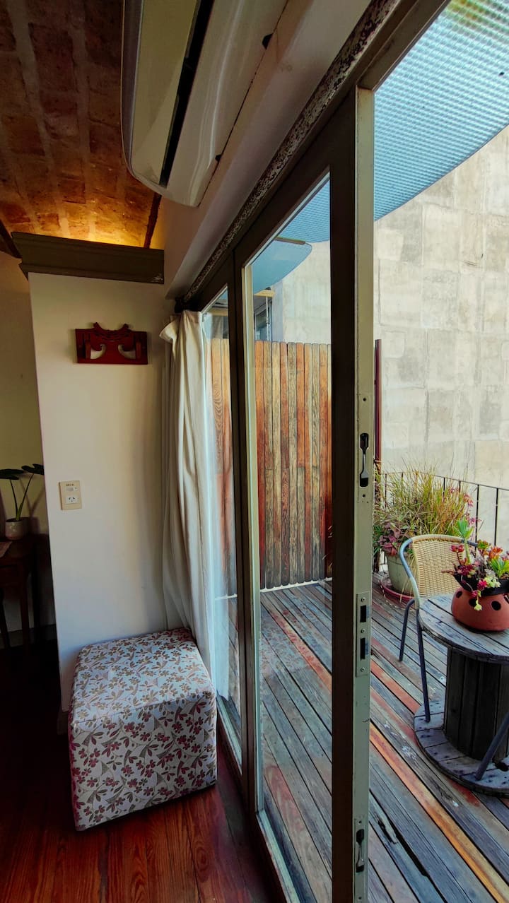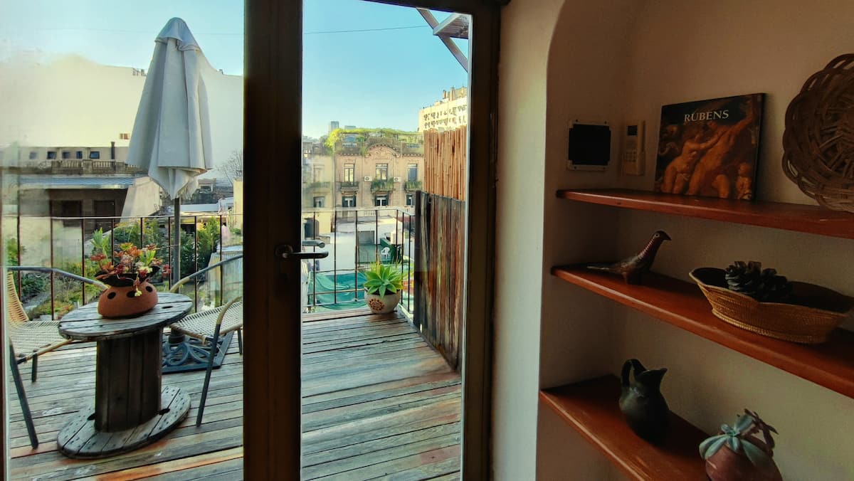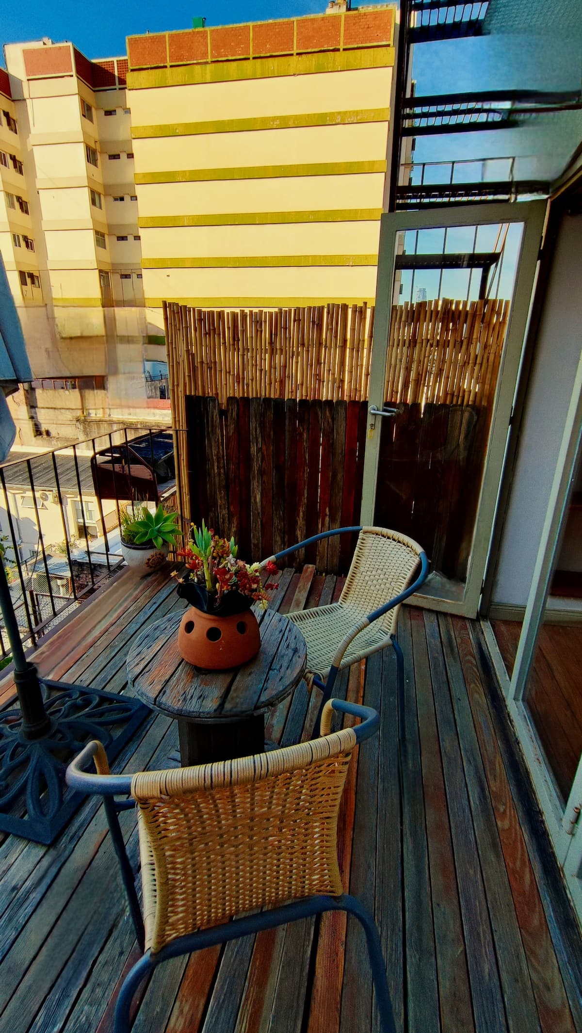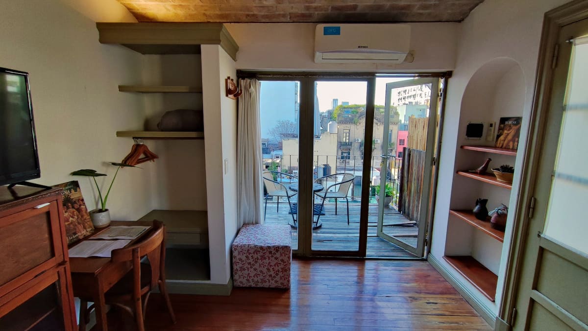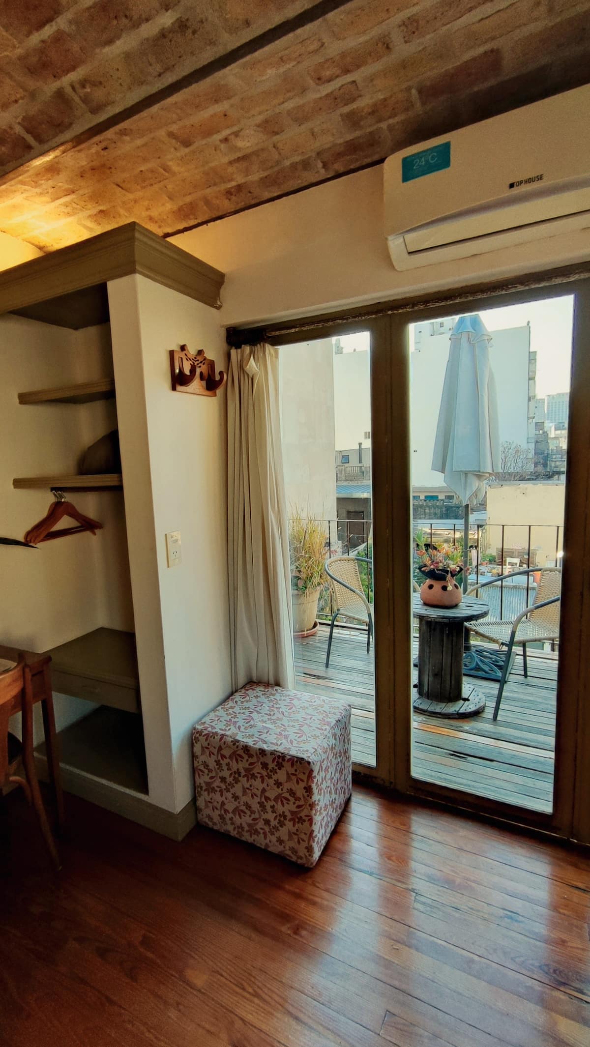 Studio apartment with north-facing orientation. Includes a wooden deck/balcony, air conditioning and 3500 cold/large-heat capacity unit, unlimited hot water, a recycled pine-wood floor and a vault-style ceiling. The building has 11 furnished, fully equipped apartments and an internal courtyard shared by residents; ground-floor space has been used for a free movement internship since 1989.