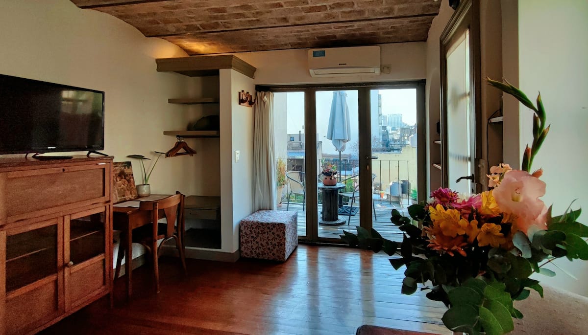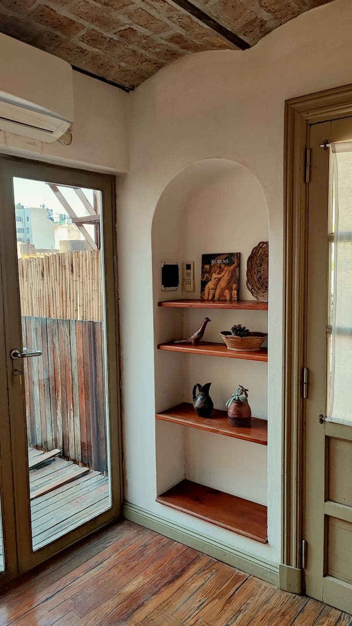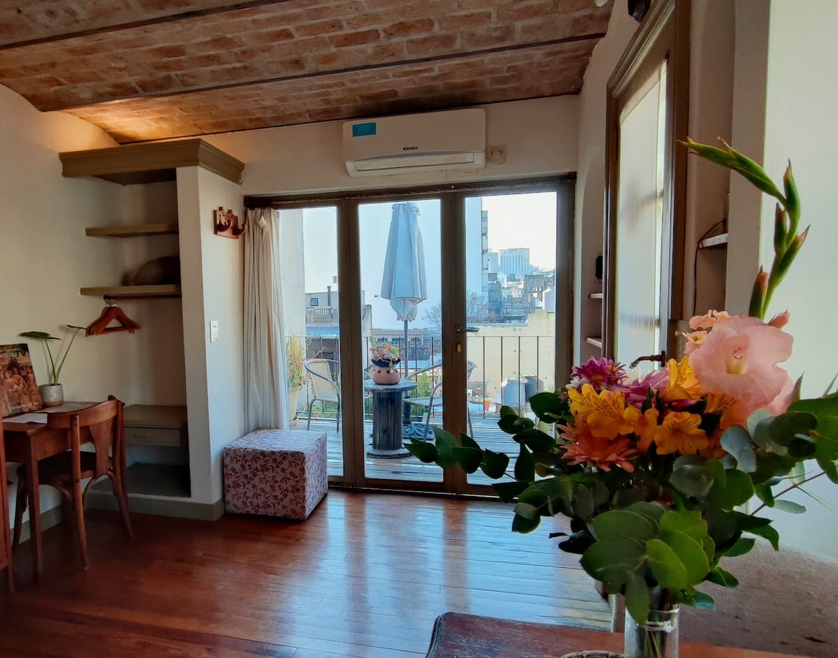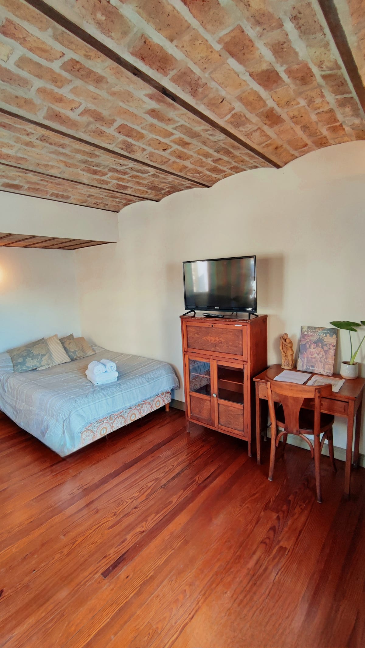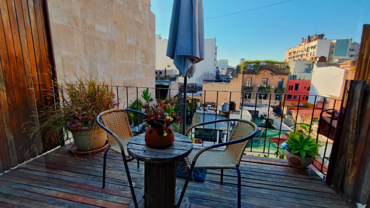 Studio apartment with north-facing orientation. Includes a wooden deck/balcony, air conditioning and 3500 cold/large-heat capacity unit, unlimited hot water, a recycled pine-wood floor and a vault-style ceiling. The building has 11 furnished, fully equipped apartments and an internal courtyard shared by residents; ground-floor space has been used for a free movement internship since 1989.