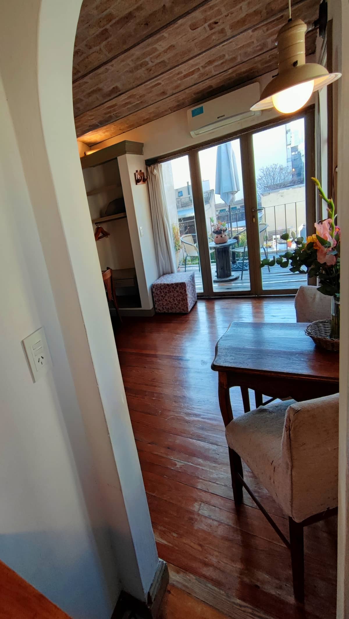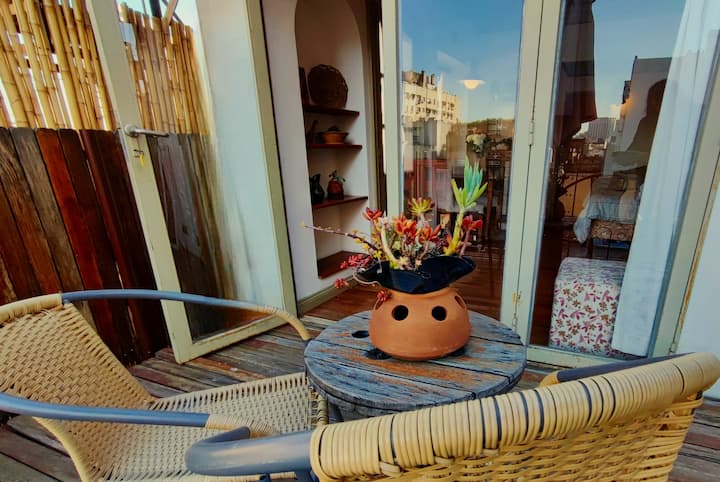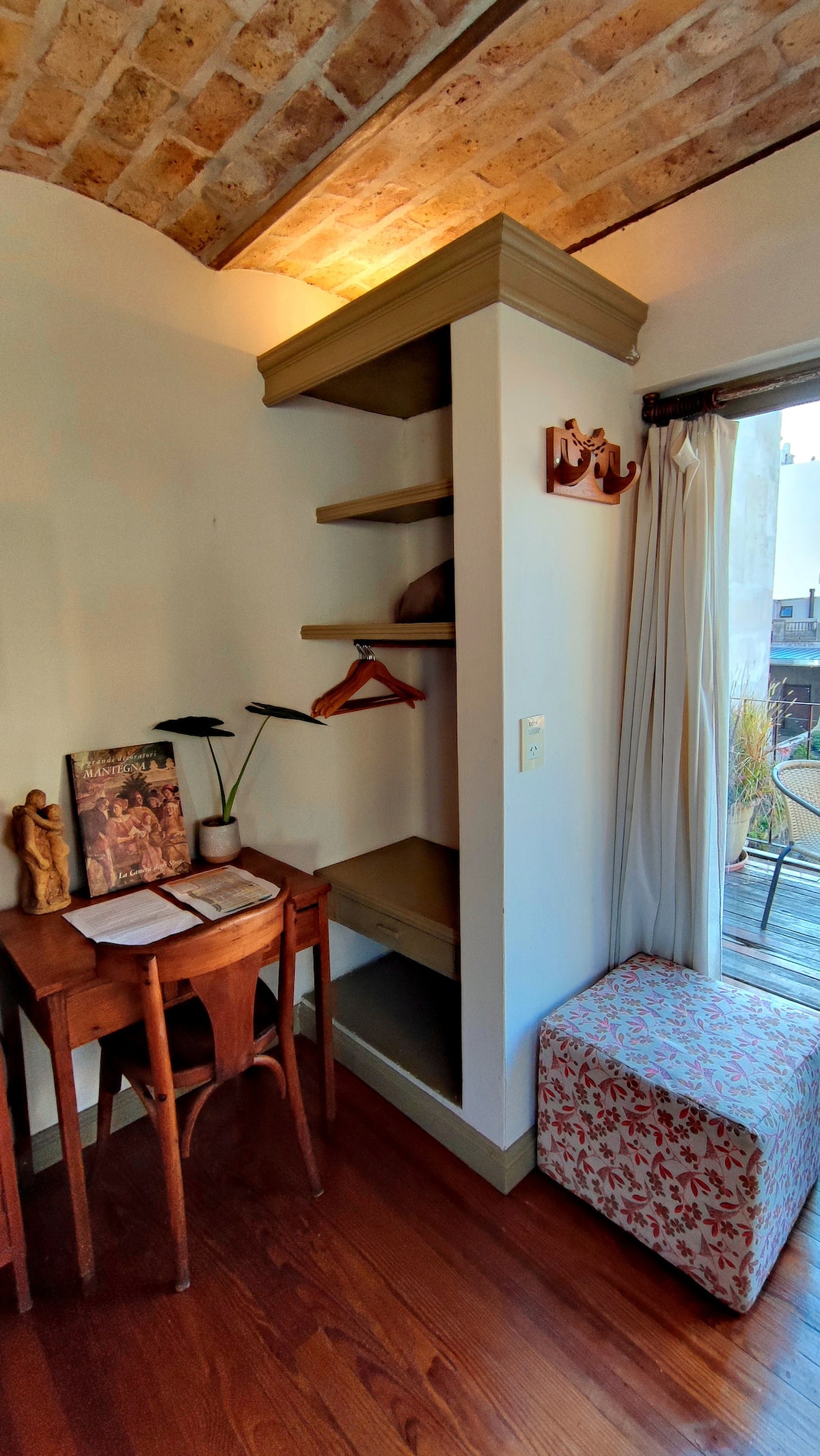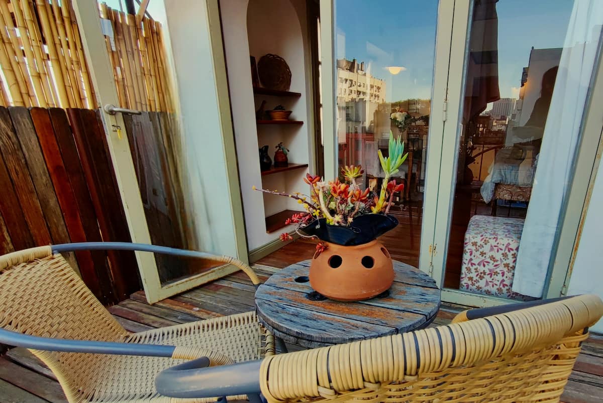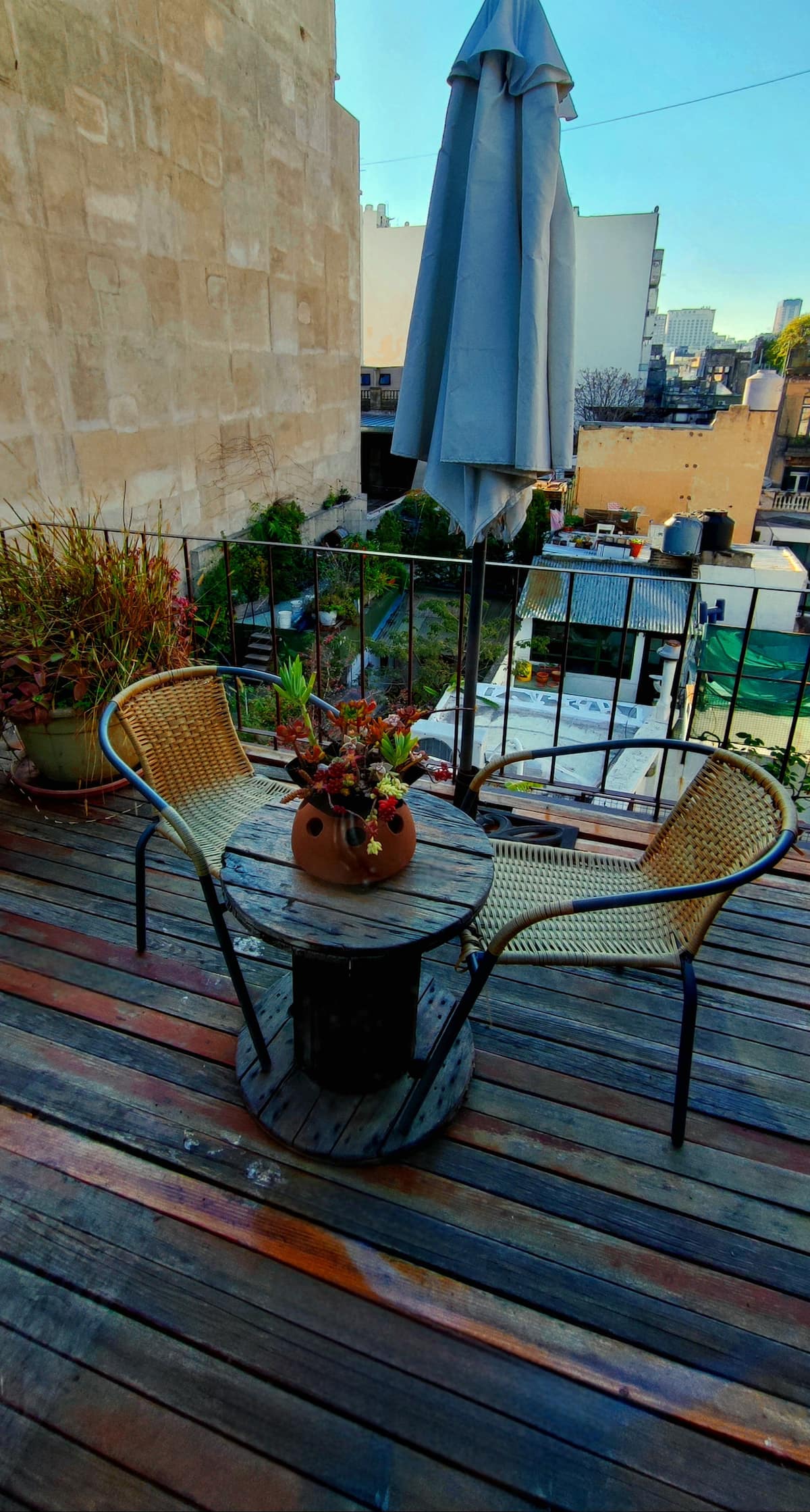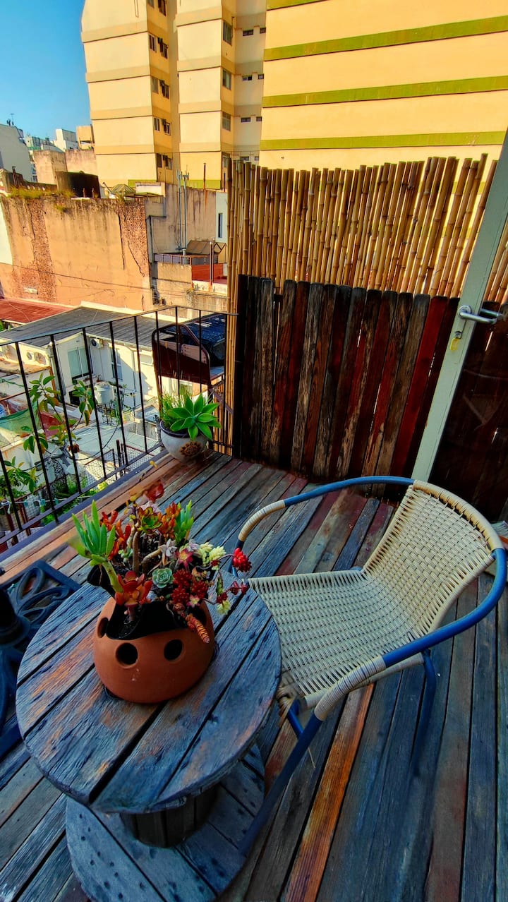 Studio apartment with north-facing orientation. Includes a wooden deck/balcony, air conditioning and 3500 cold/large-heat capacity unit, unlimited hot water, a recycled pine-wood floor and a vault-style ceiling. The building has 11 furnished, fully equipped apartments and an internal courtyard shared by residents; ground-floor space has been used for a free movement internship since 1989.