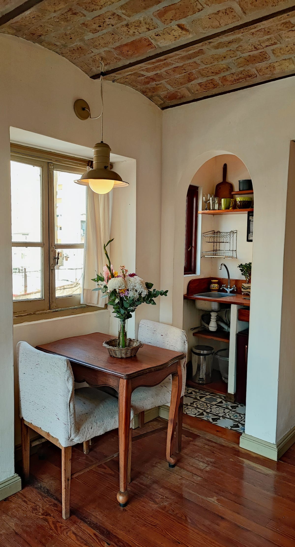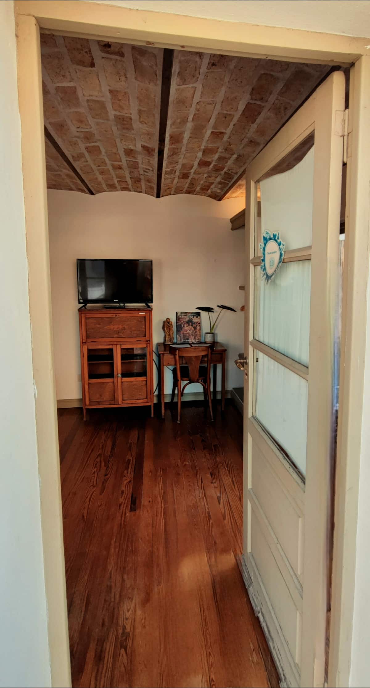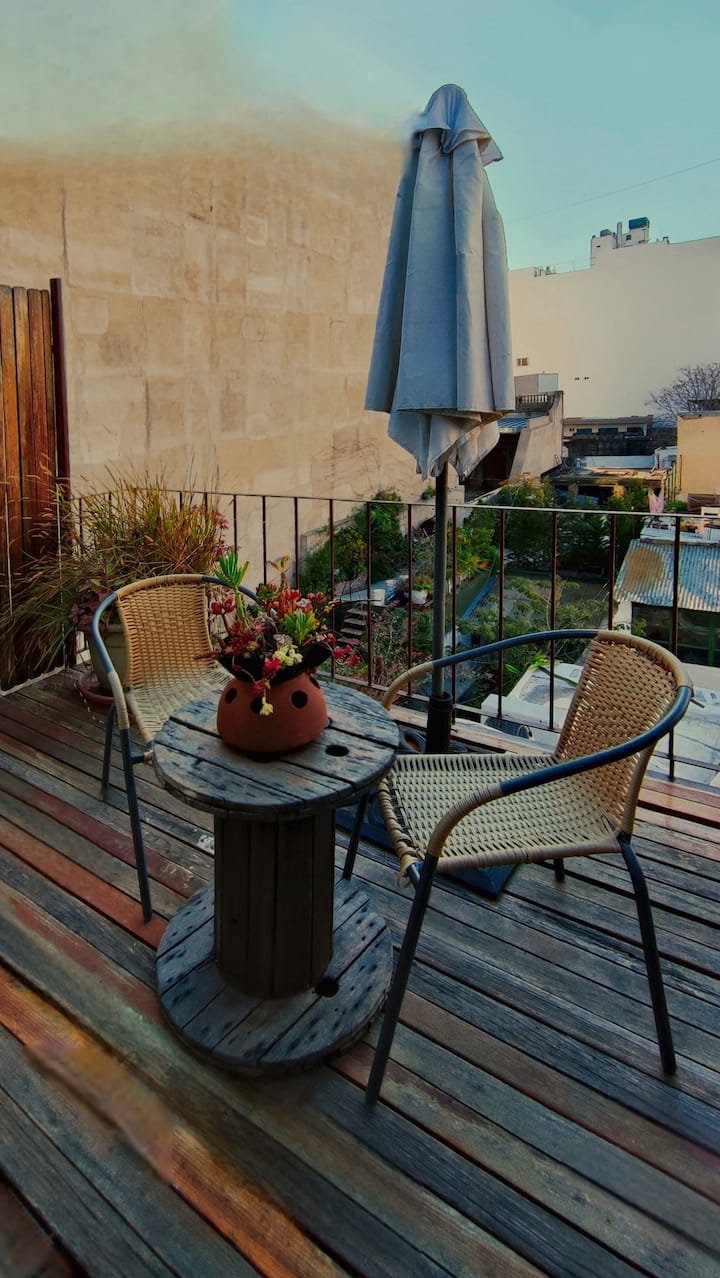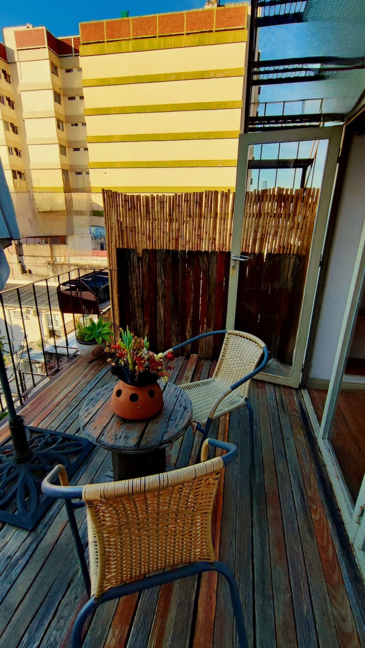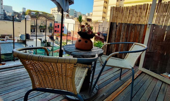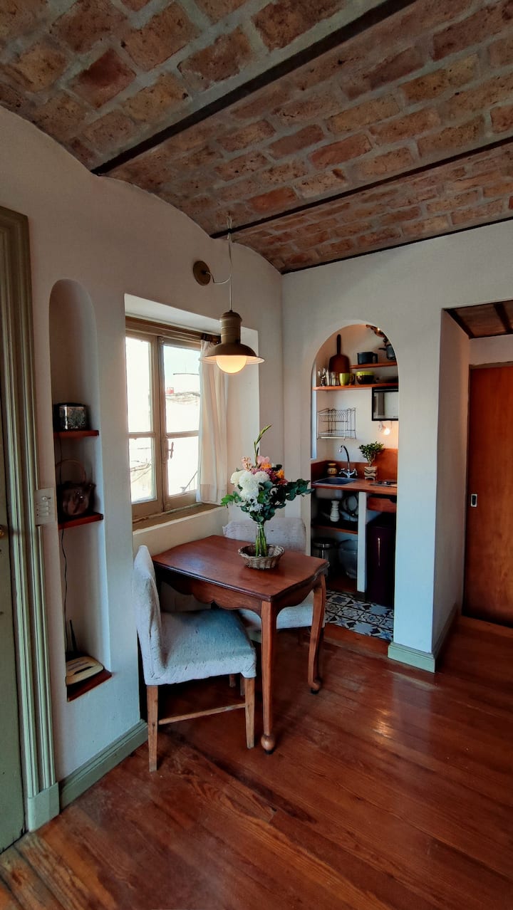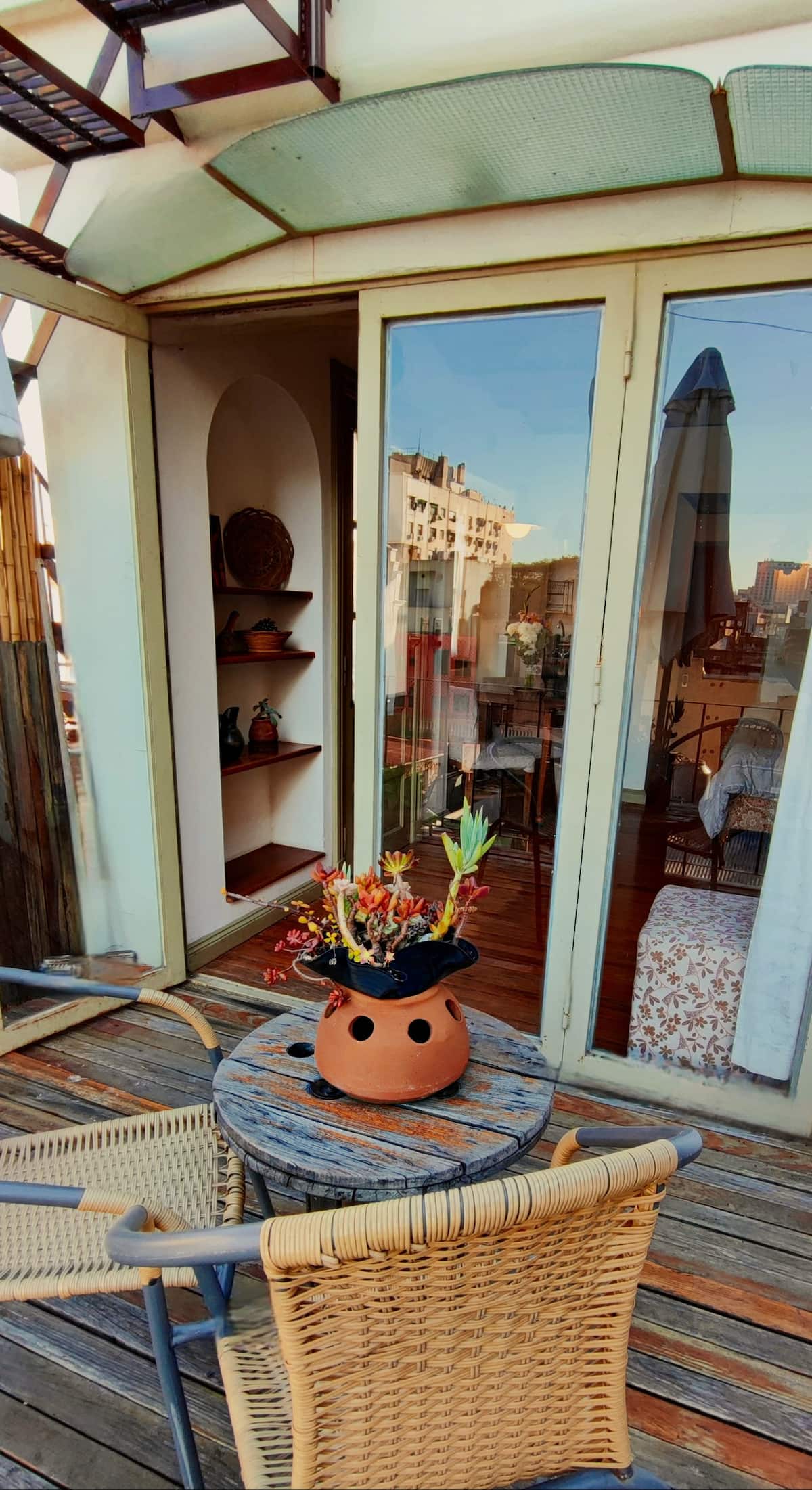 Studio apartment with north-facing orientation. Includes a wooden deck/balcony, air conditioning and 3500 cold/large-heat capacity unit, unlimited hot water, a recycled pine-wood floor and a vault-style ceiling. The building has 11 furnished, fully equipped apartments and an internal courtyard shared by residents; ground-floor space has been used for a free movement internship since 1989.