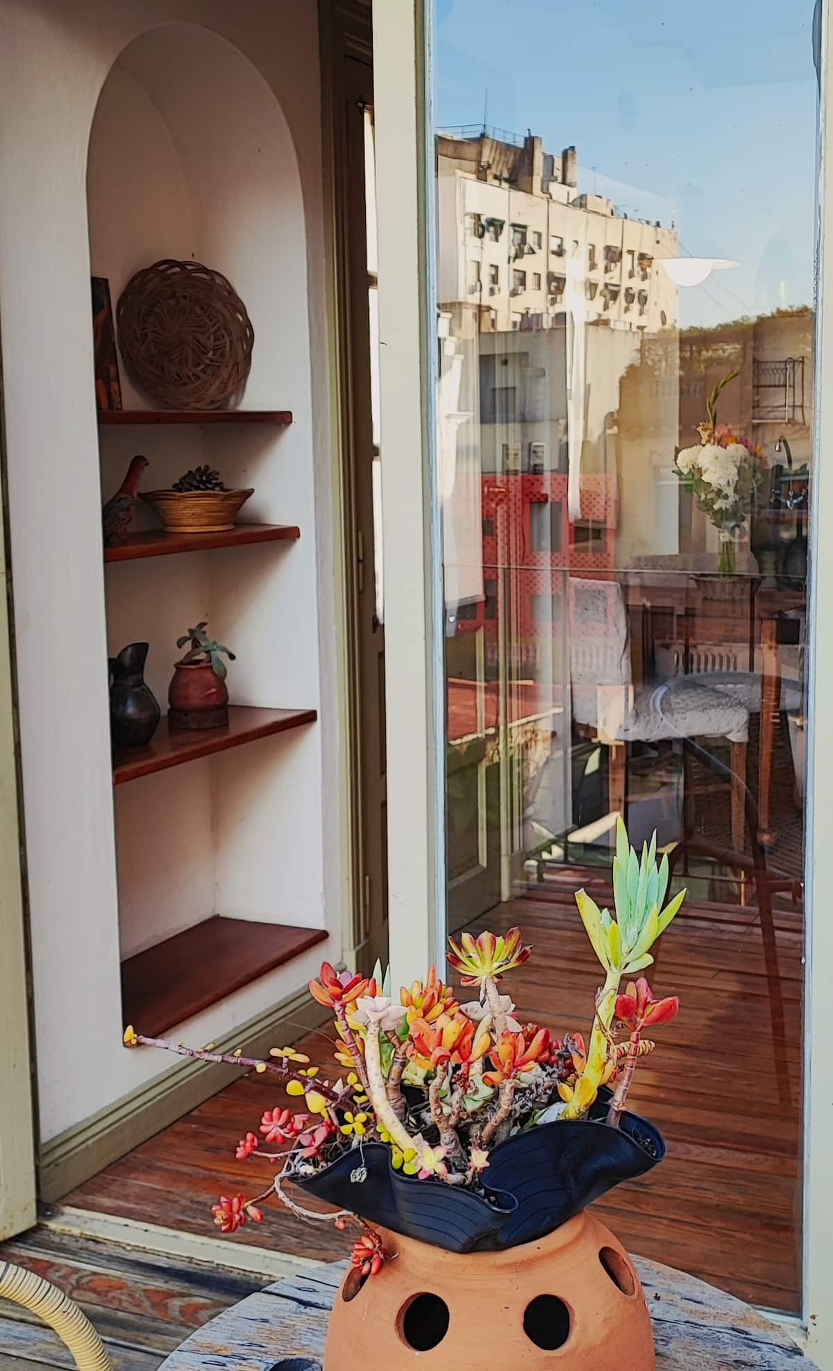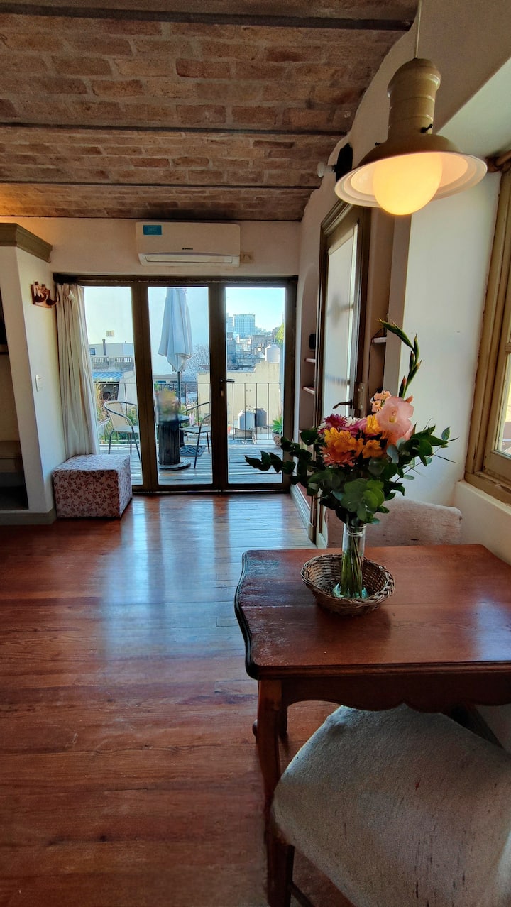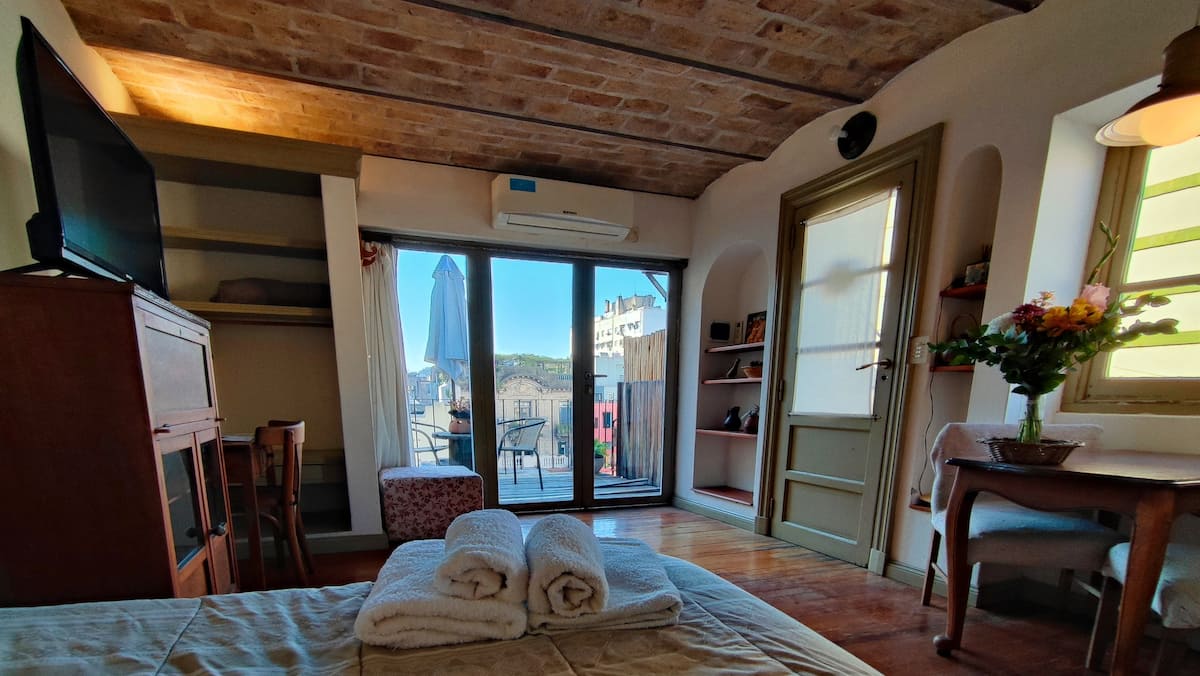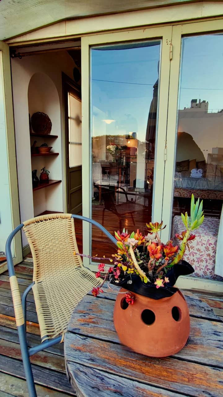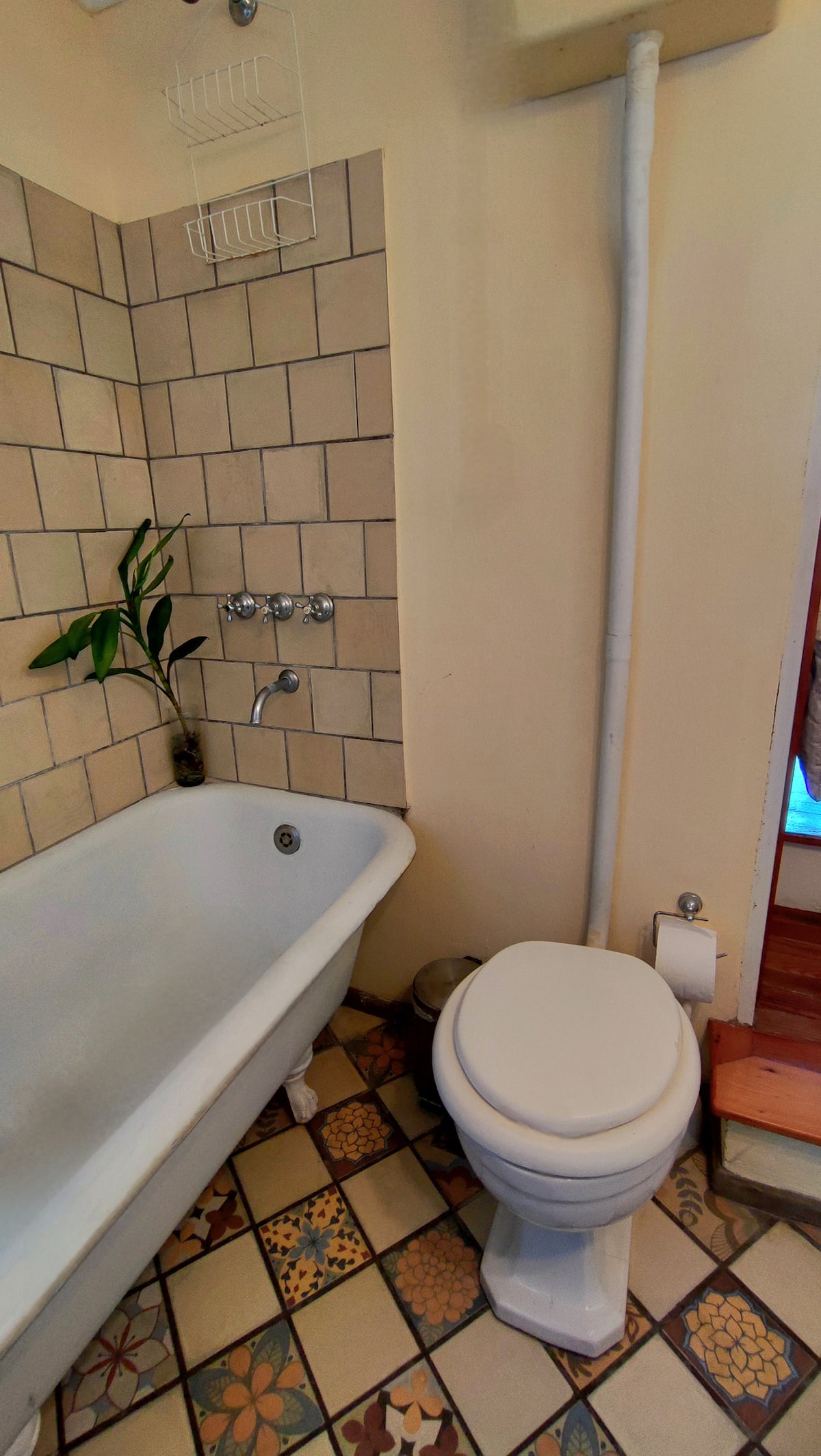 Studio apartment with north-facing orientation. Includes a wooden deck/balcony, air conditioning and 3500 cold/large-heat capacity unit, unlimited hot water, a recycled pine-wood floor and a vault-style ceiling. The building has 11 furnished, fully equipped apartments and an internal courtyard shared by residents; ground-floor space has been used for a free movement internship since 1989.