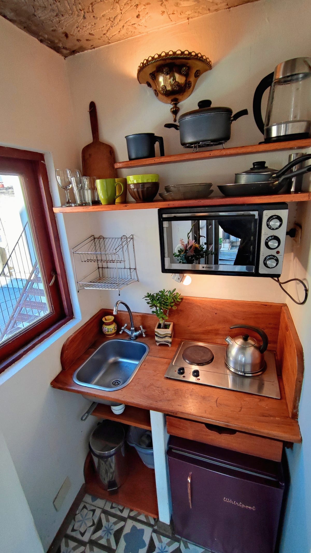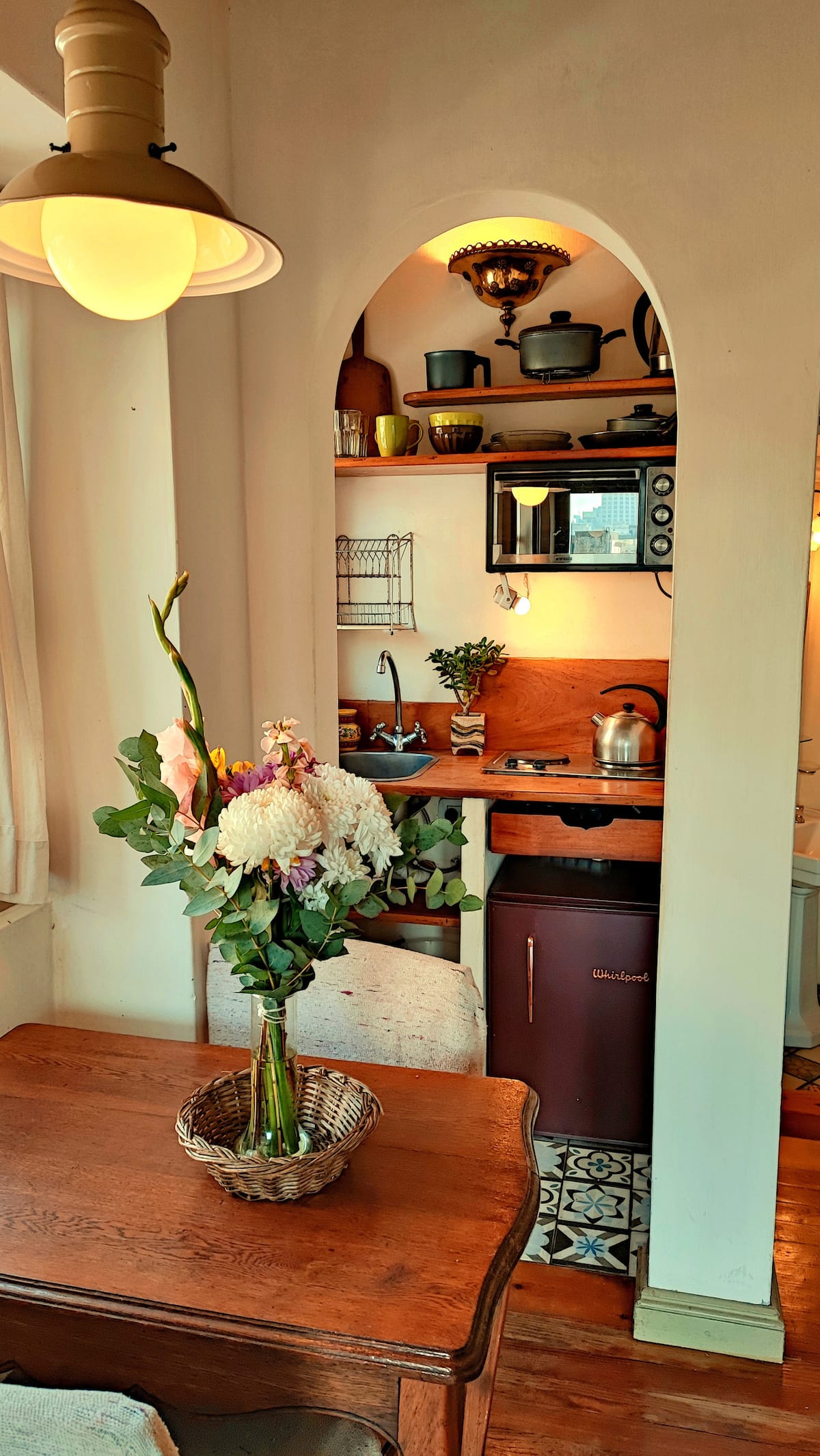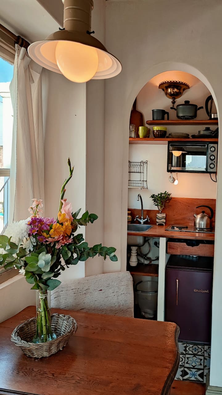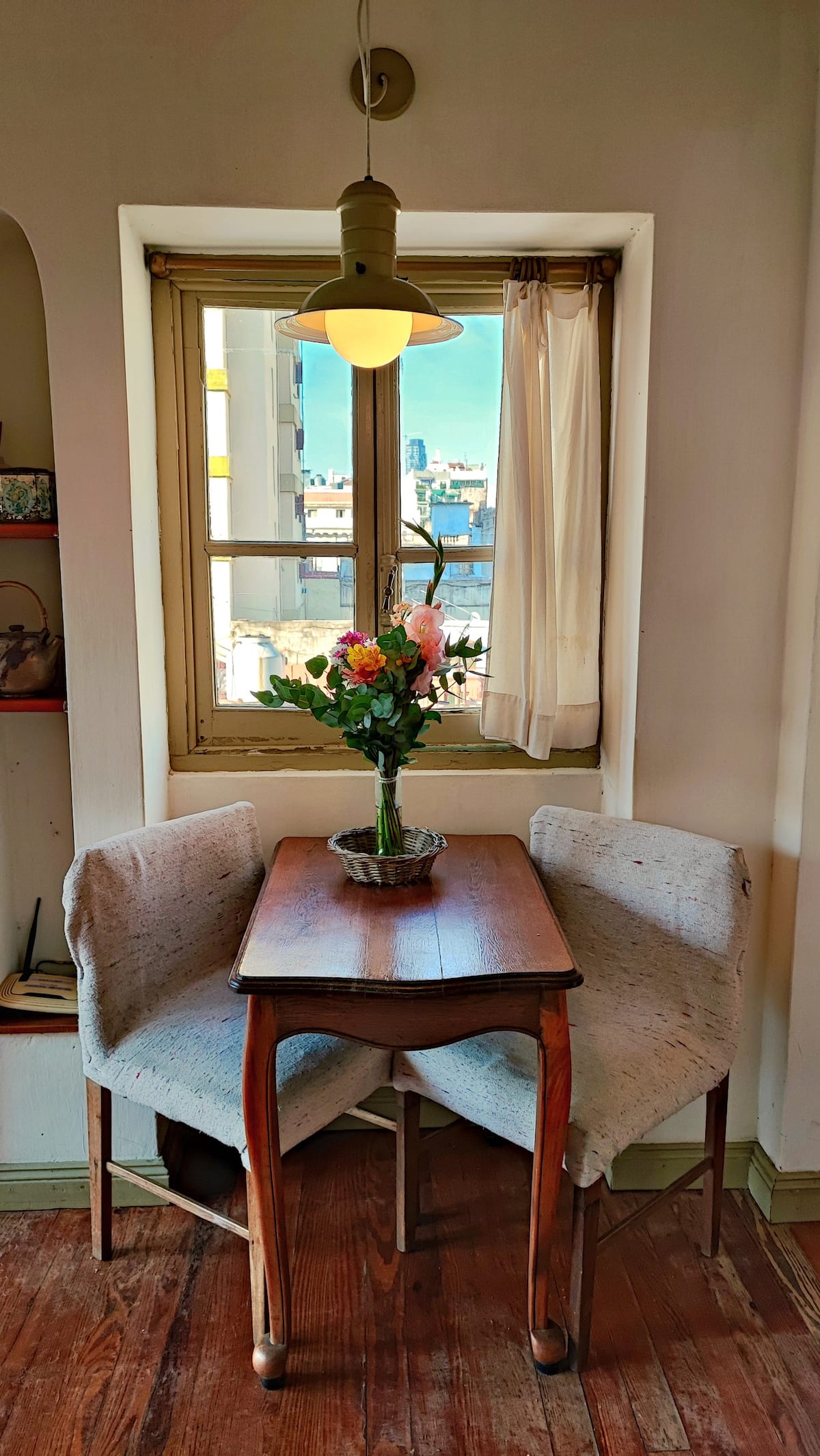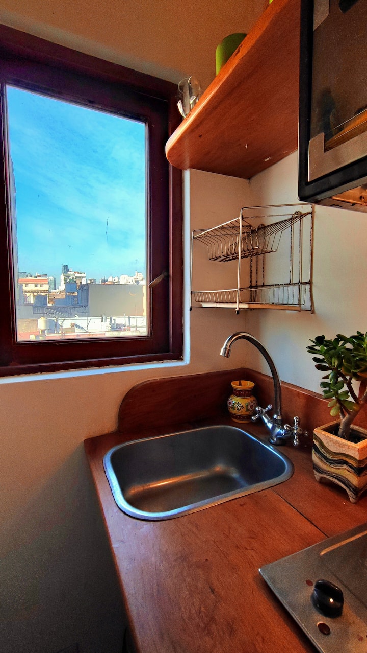 Studio apartment with north-facing orientation. Includes a wooden deck/balcony, air conditioning and 3500 cold/large-heat capacity unit, unlimited hot water, a recycled pine-wood floor and a vault-style ceiling. The building has 11 furnished, fully equipped apartments and an internal courtyard shared by residents; ground-floor space has been used for a free movement internship since 1989.